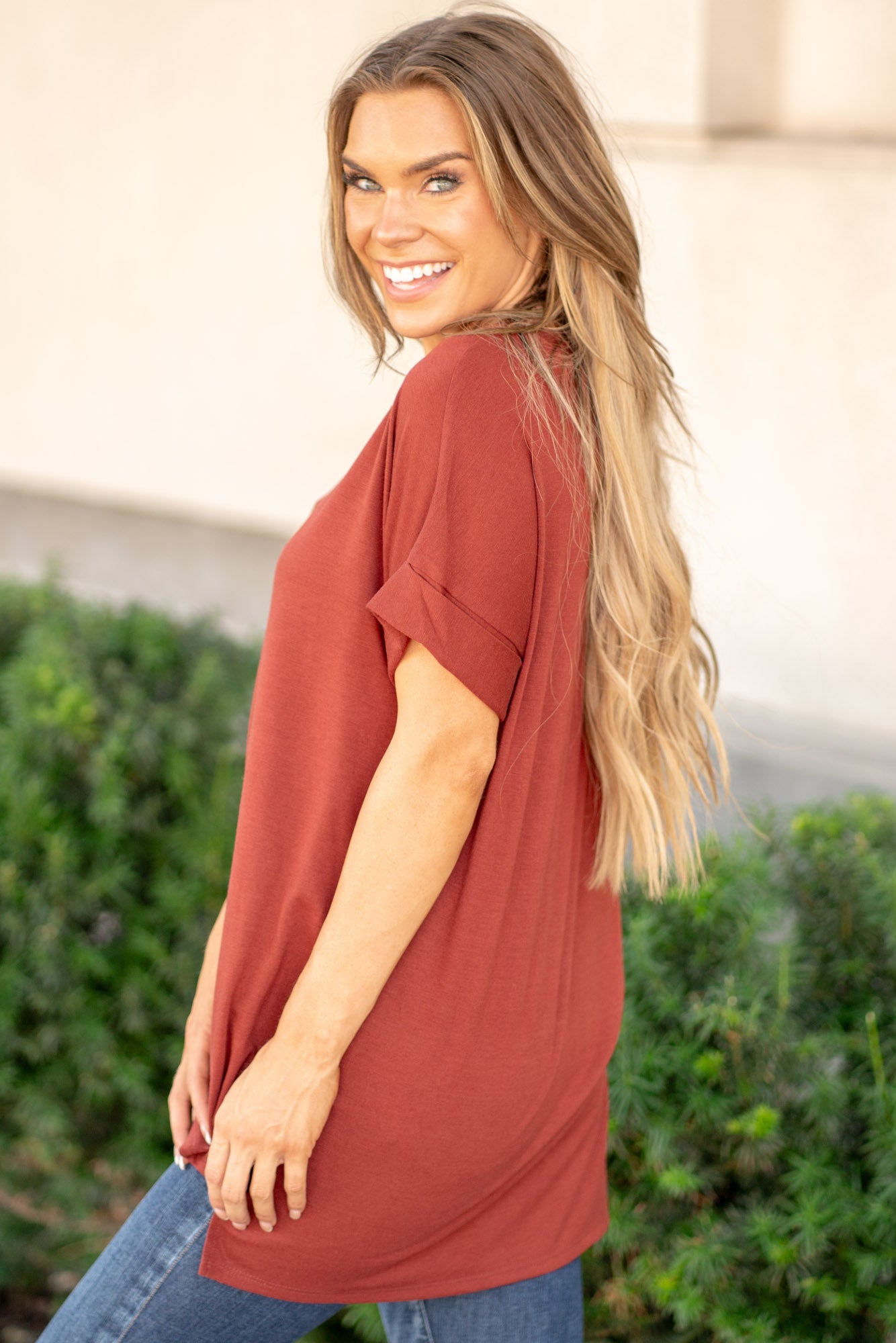 Super Soft High Low Hem V Neck Top - Dark Rust T-Shirt