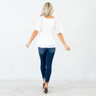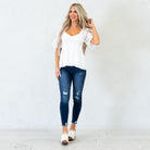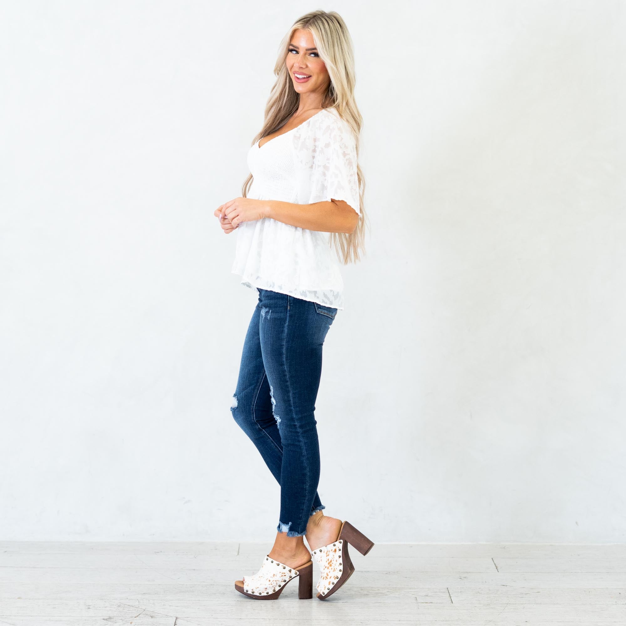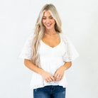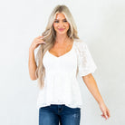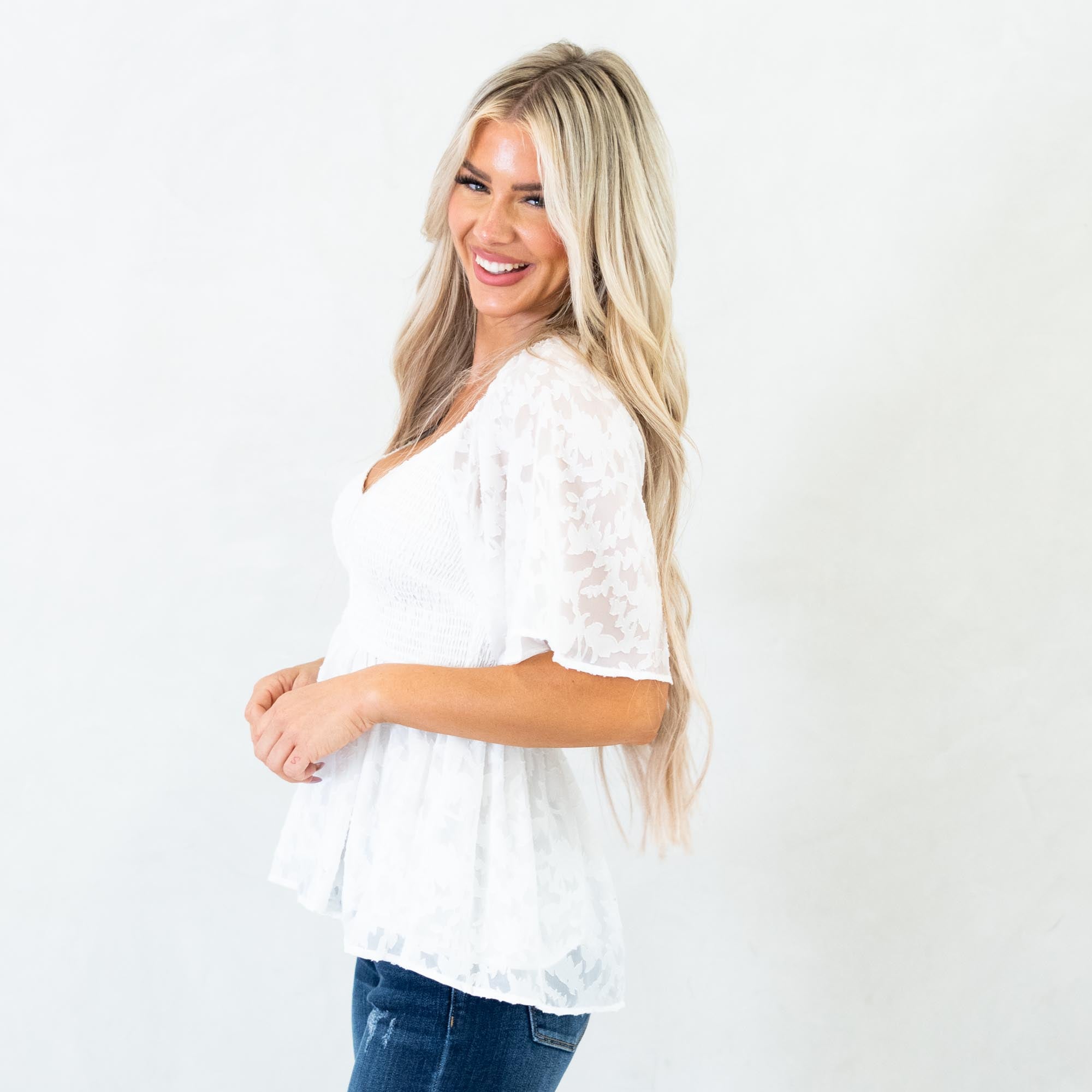The Midnight Charm Smocked Peplum Top is a timeless staple with a flirty twist. Designed with a flattering V-neckline and soft flutter sleeves, this top brings an effortlessly feminine touch to your look. The smocked bodice hugs your shape in all the right places, while the peplum hem flows gently for a romantic, figure-flattering silhouette. Crafted in a classic white hue, it’s the perfect piece to dress up with jeans and heels or keep casual with wide-leg denim and sandals.