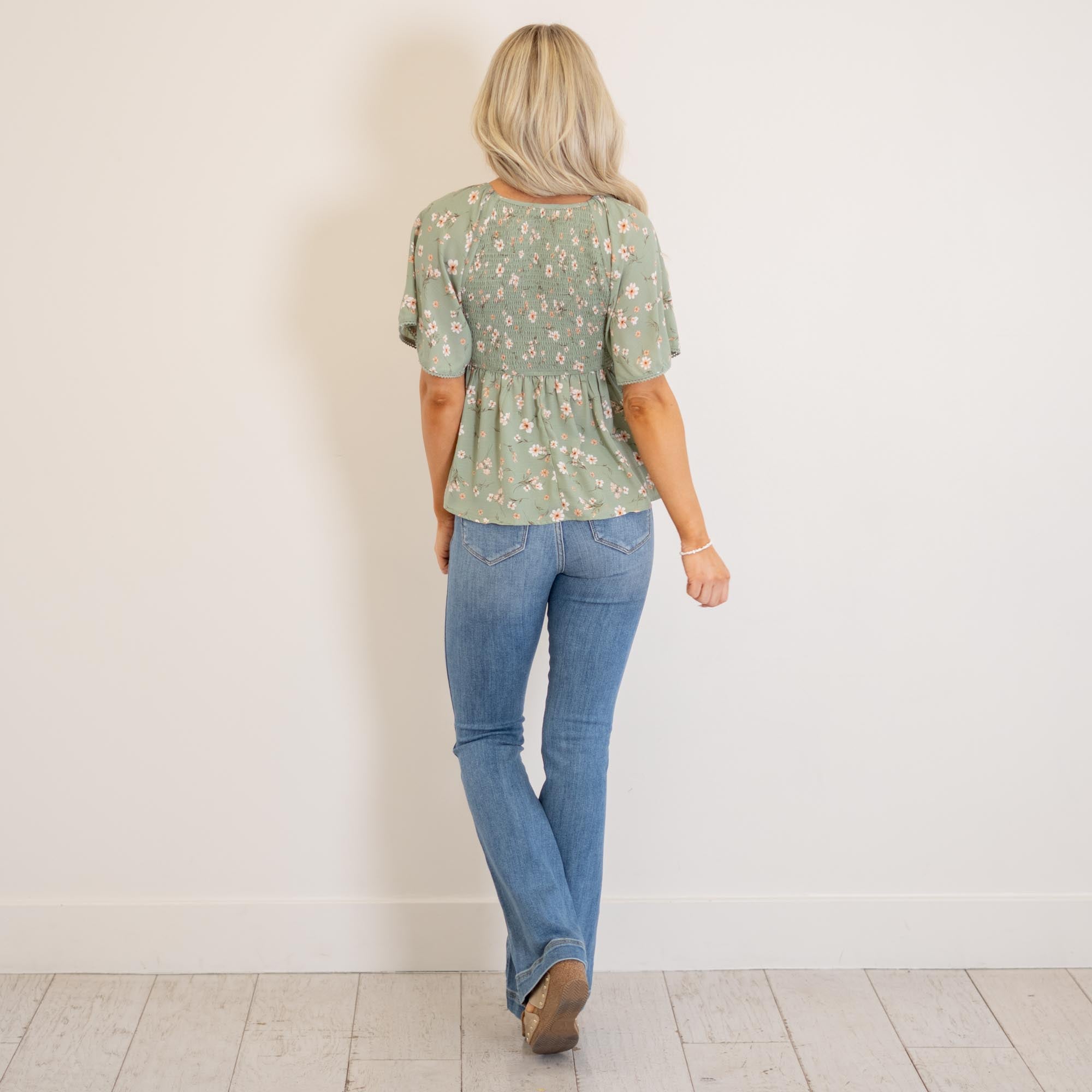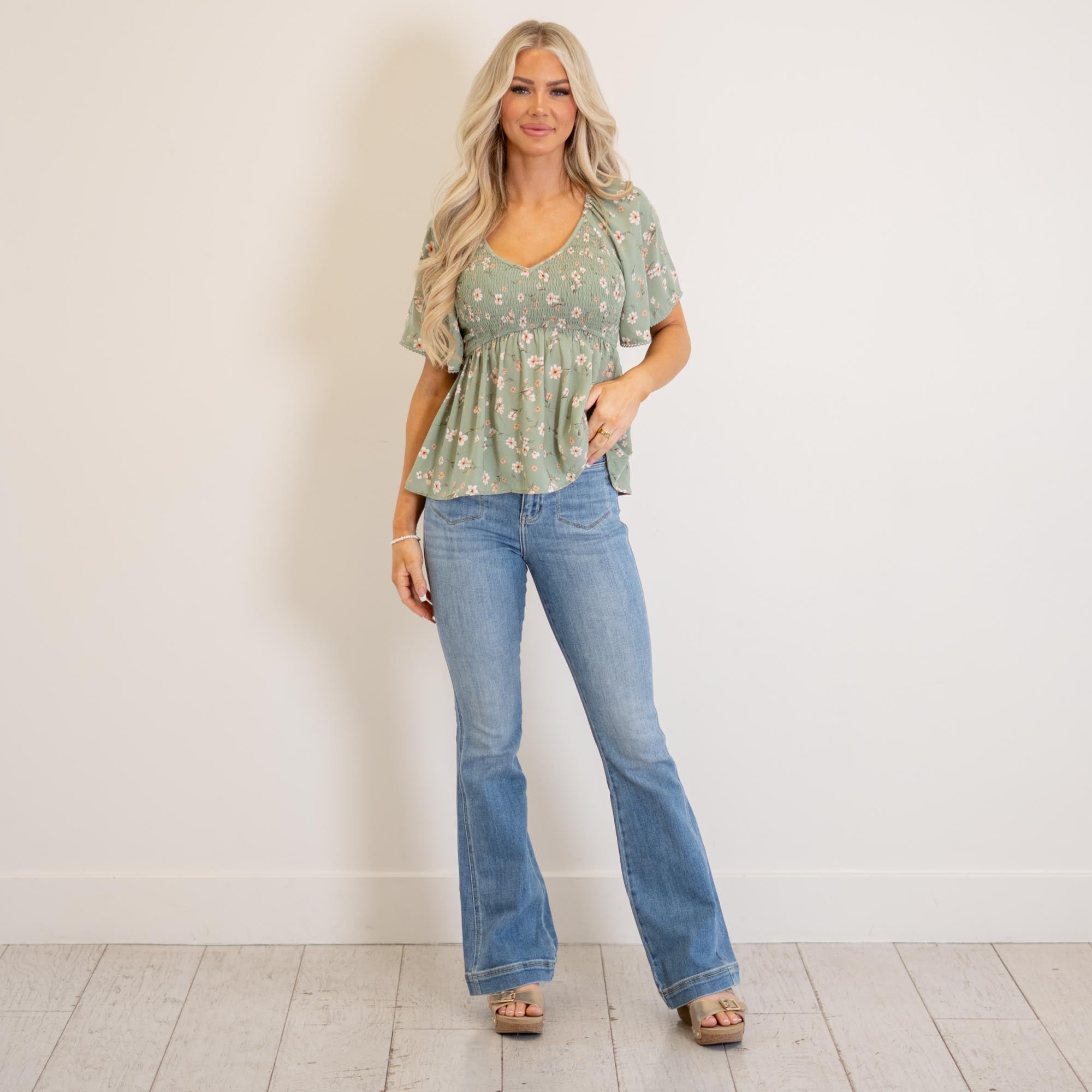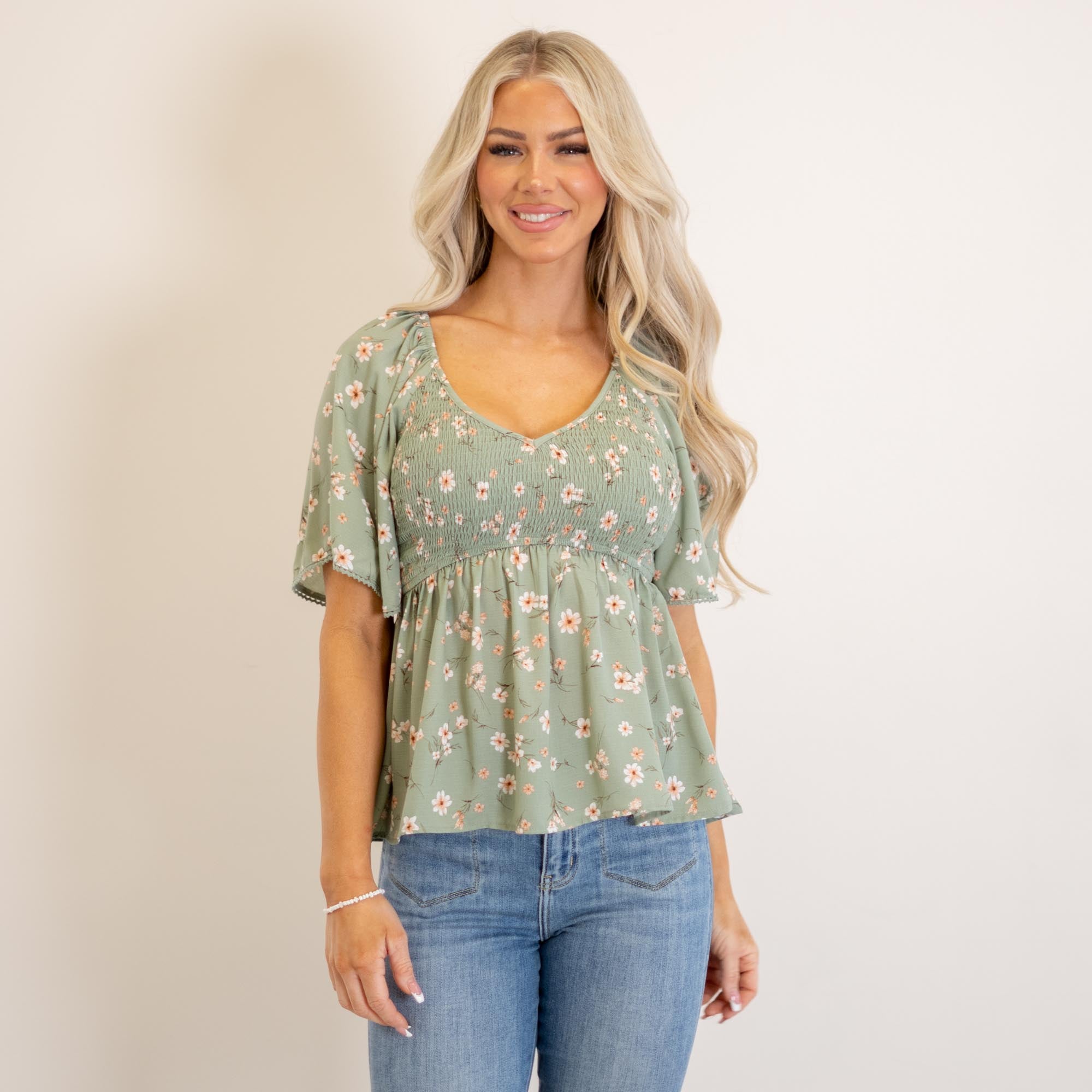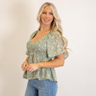 Light, flowy, and effortlessly flattering—this sage peplum top is made for easy, everyday styling. Featuring a soft V-neckline, flutter sleeves, and a smocked bodice, it hugs in all the right places before flowing into a breezy peplum hem. The lightweight fabric keeps it comfortable and breathable, while the feminine silhouette adds a polished touch to any look. Pair it with your favorite denim or shorts for an effortlessly styled outfit.