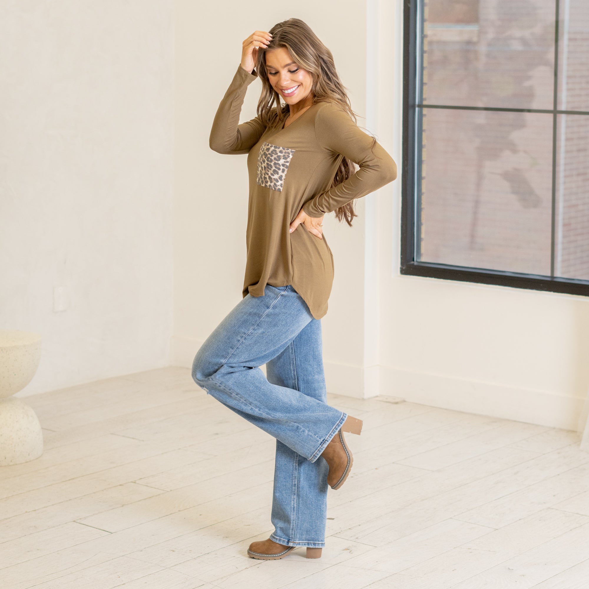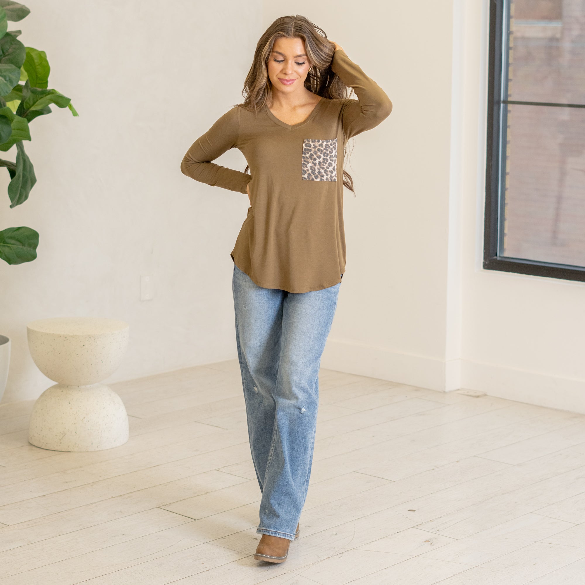Long sleeve v-neck leopard pocket top