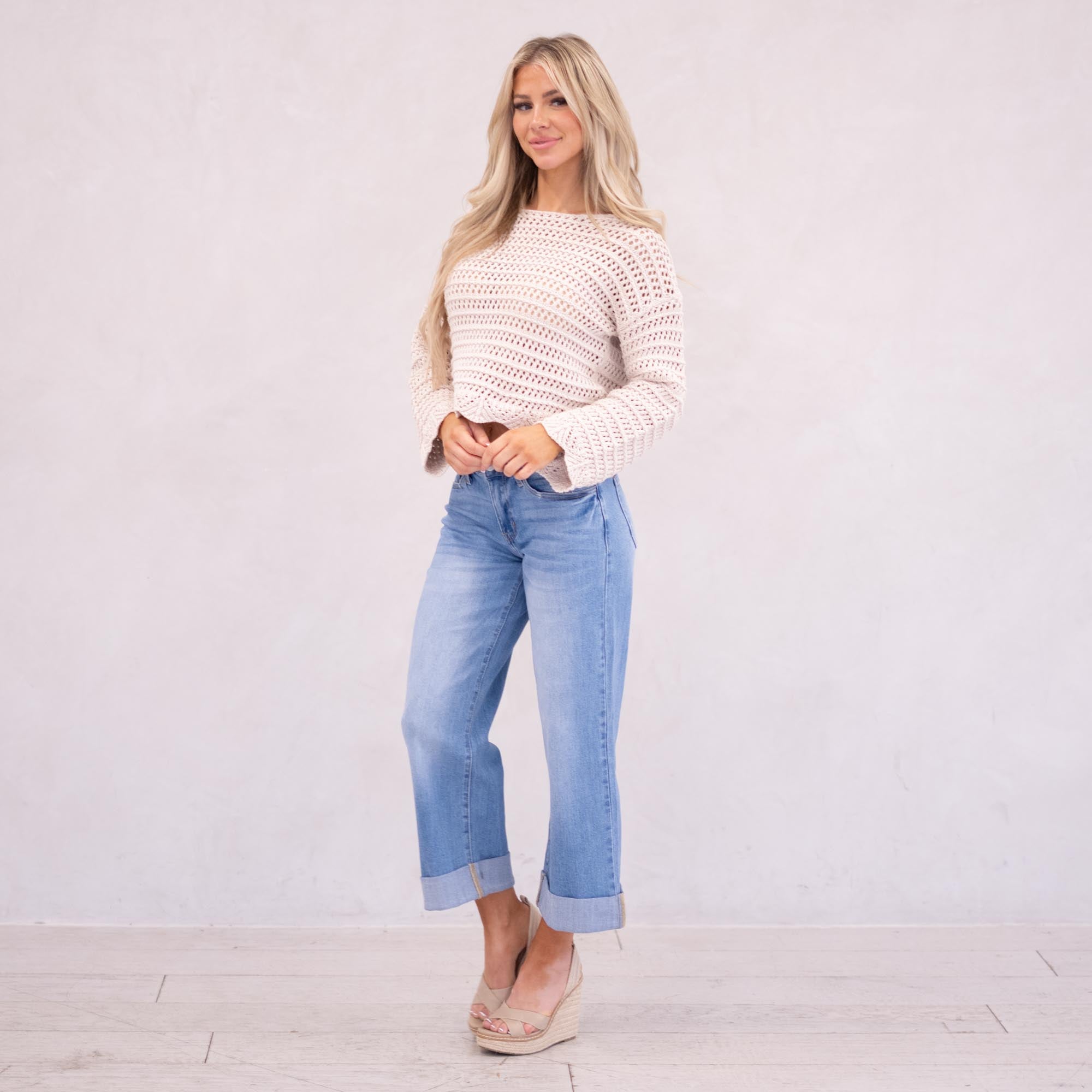 An airy open-knit sweater designed with a relaxed boat neckline, wide sleeves, and soft scalloped edges for an effortless, laid-back look that’s perfect for layering.