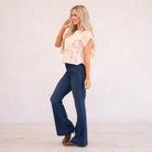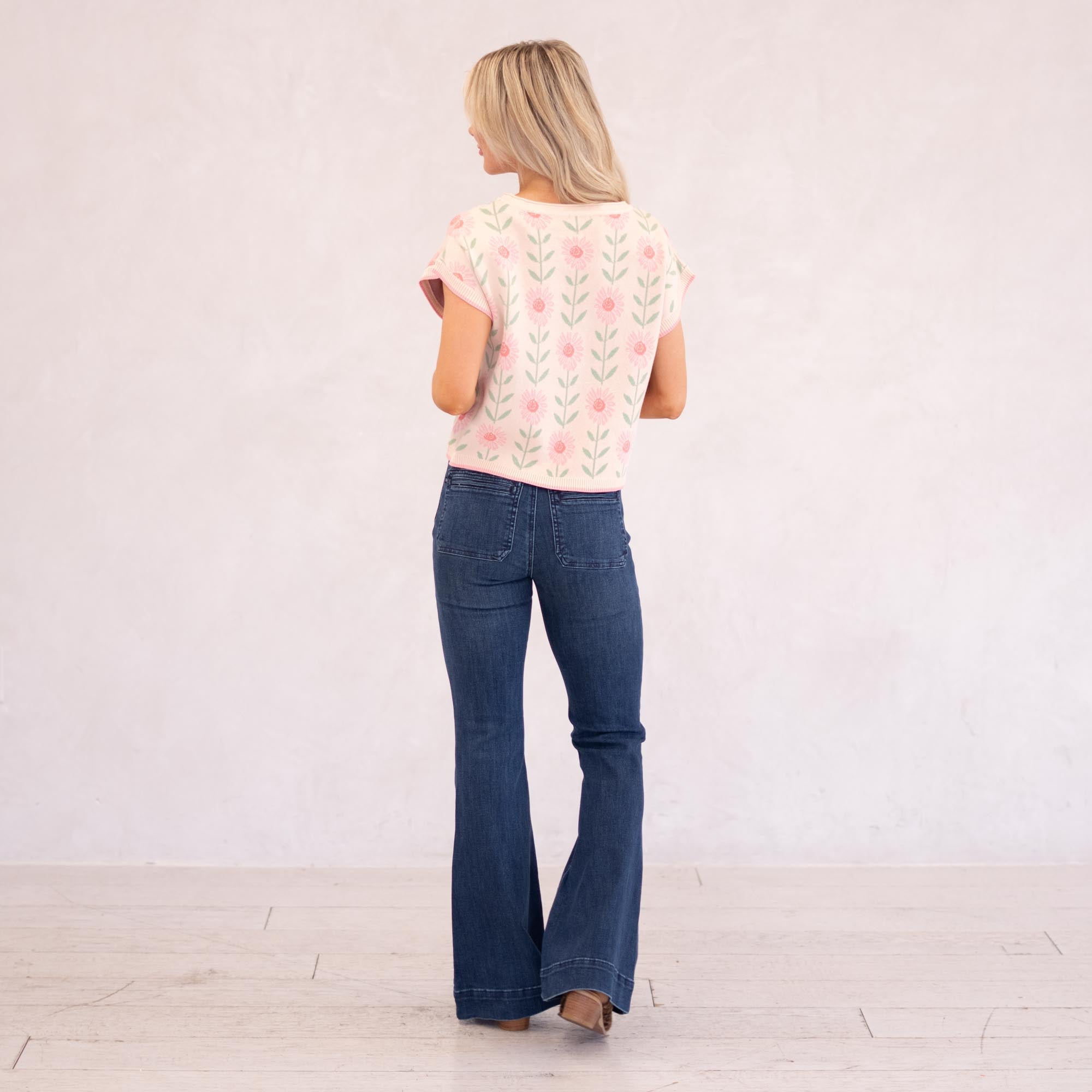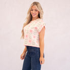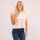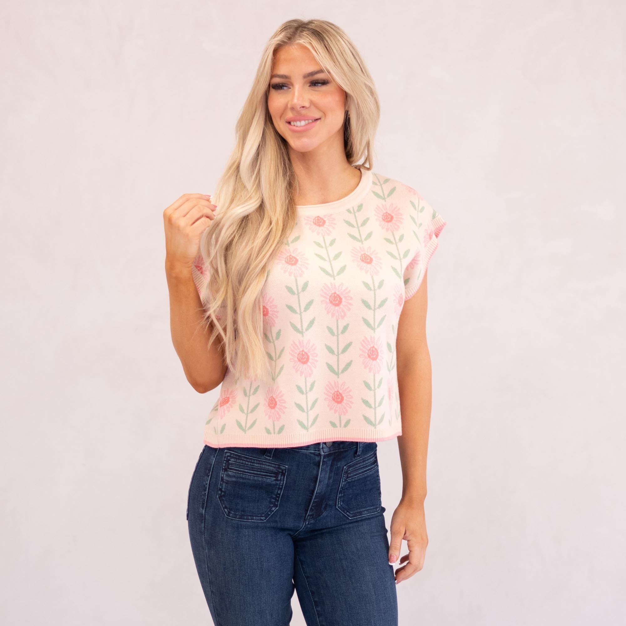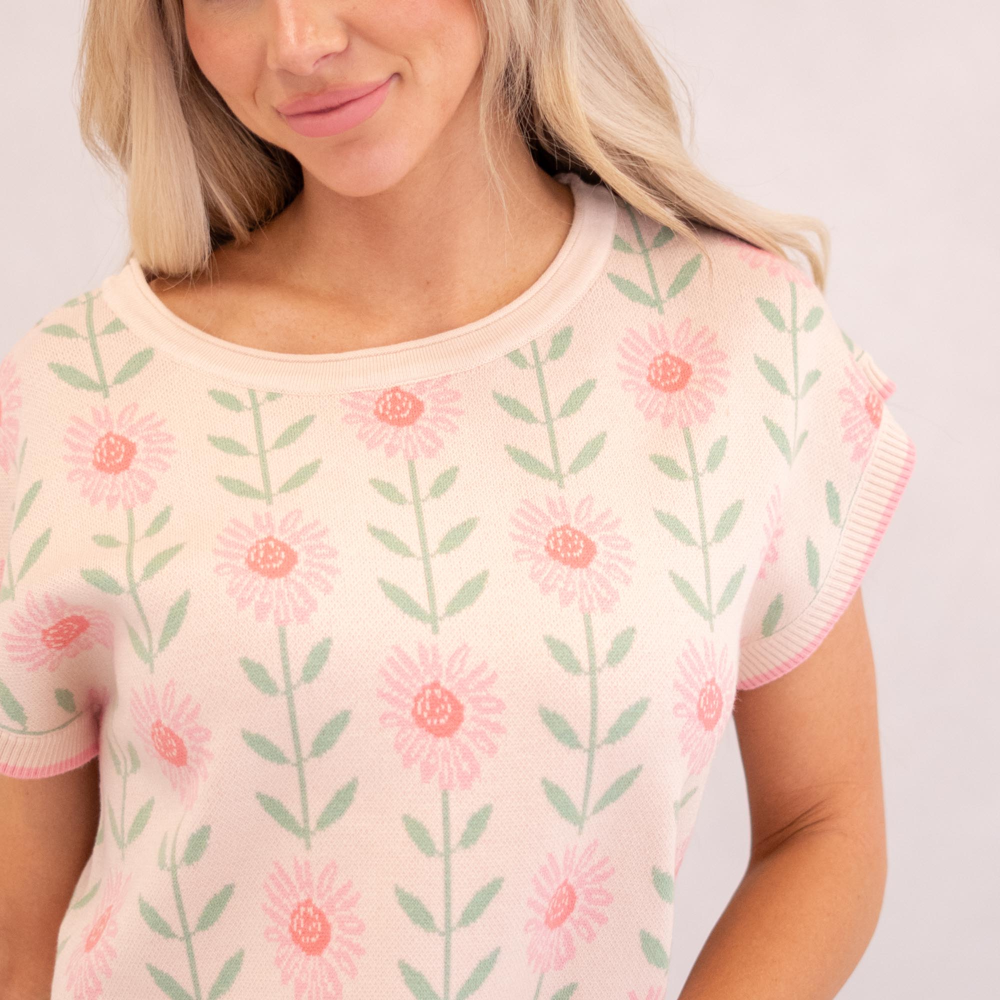 A lightweight sweater top featuring a relaxed boat neckline and a soft pink floral print for an easy, feminine look that layers beautifully from season to season.