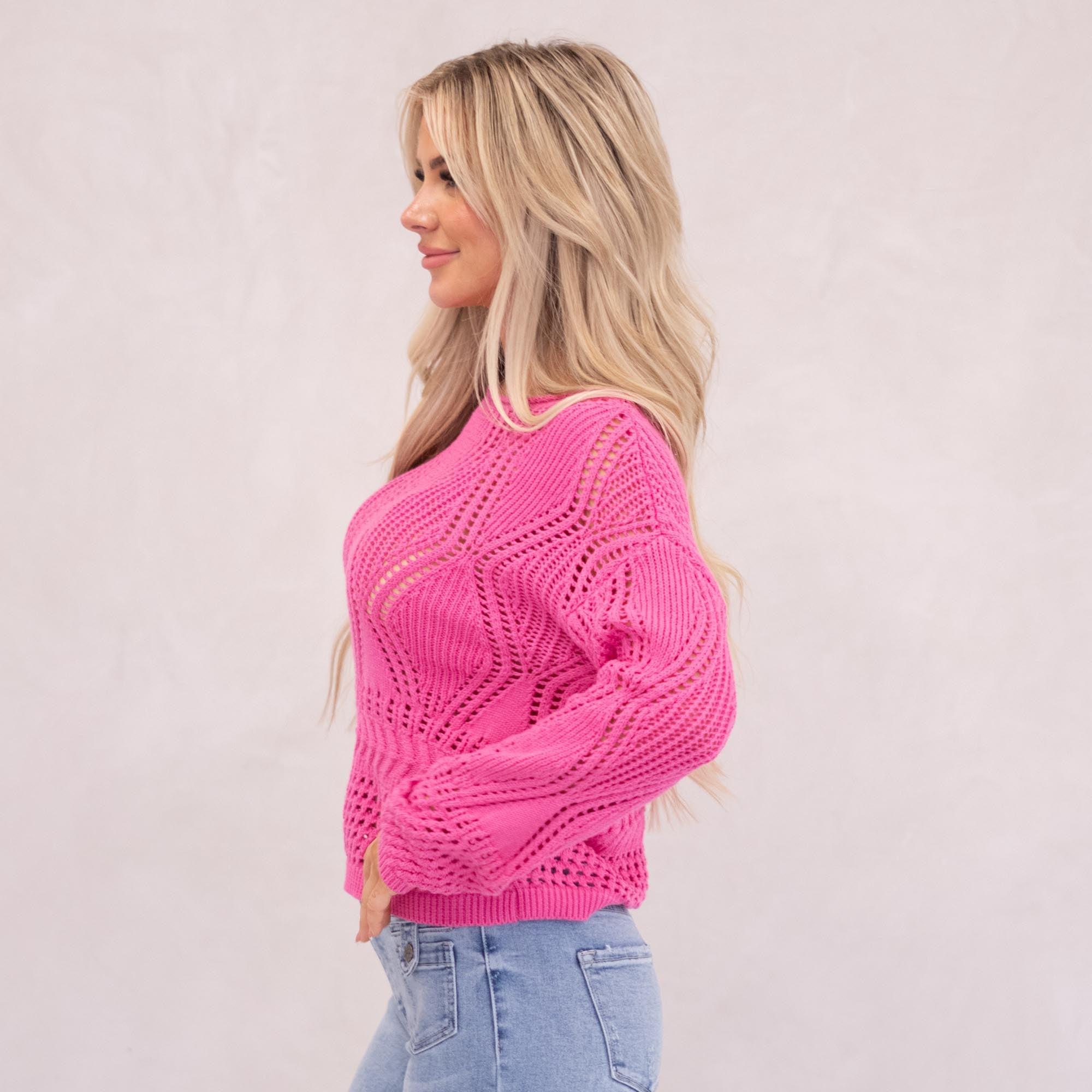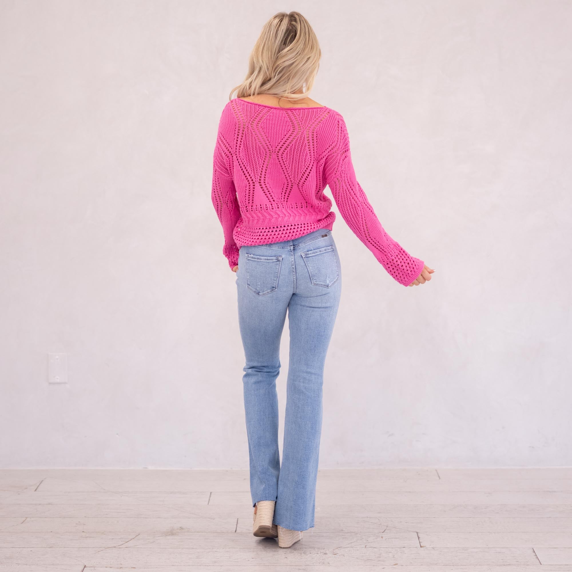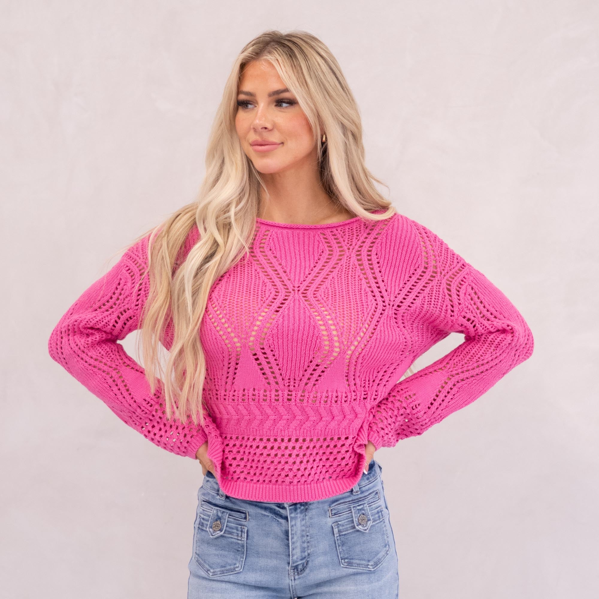 Bright, breezy, and made for layering — the Sunset Drift Crochet Sweater brings effortless style to your warm-weather wardrobe. Designed with a relaxed boat neckline and open crochet knit, this lightweight sweater drapes perfectly for that laid-back yet elevated look. The bold fuchsia hue adds the perfect pop of color, making it an easy standout whether you’re heading to brunch, the beach, or a casual night out.
