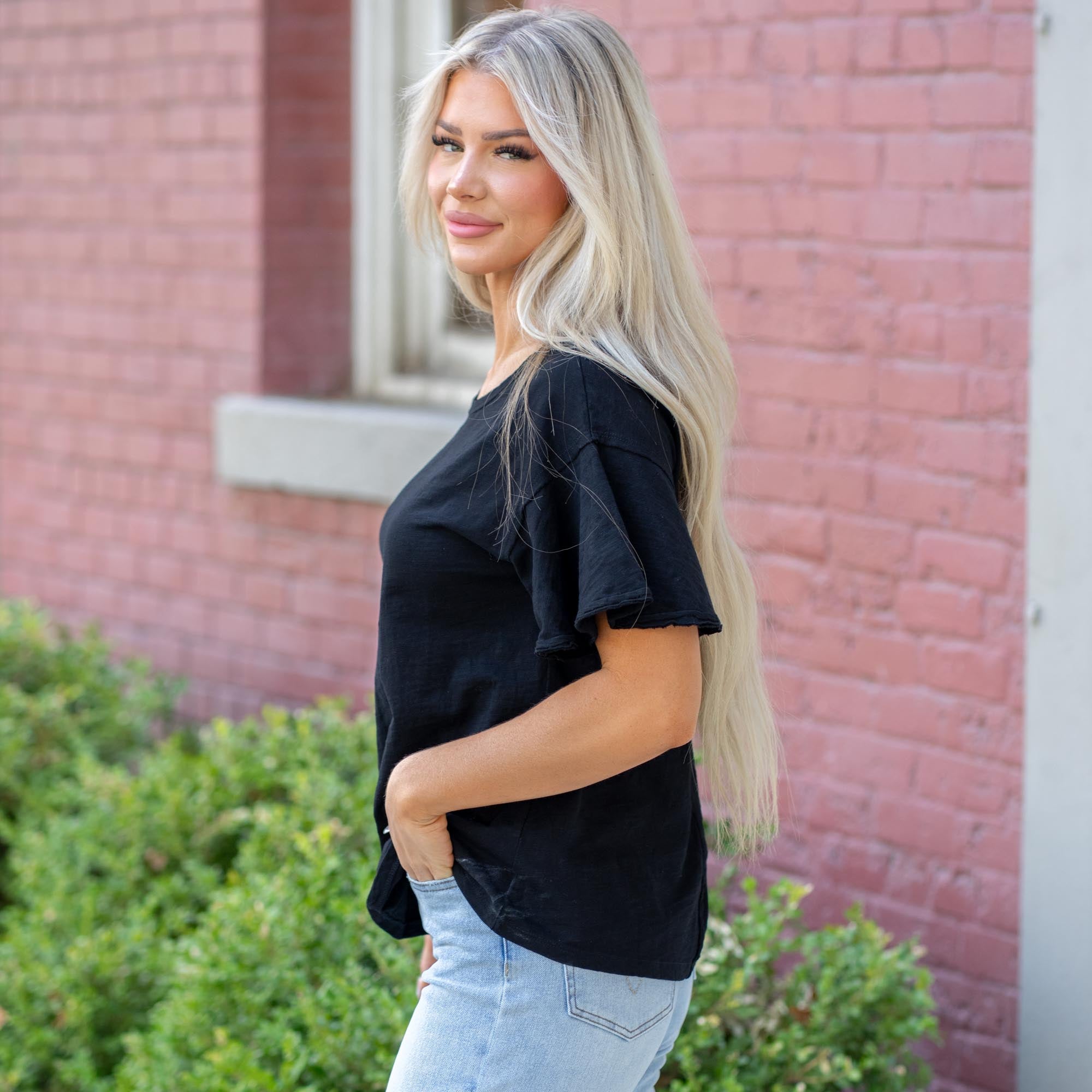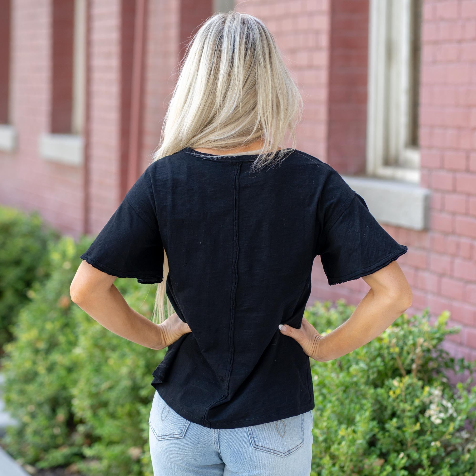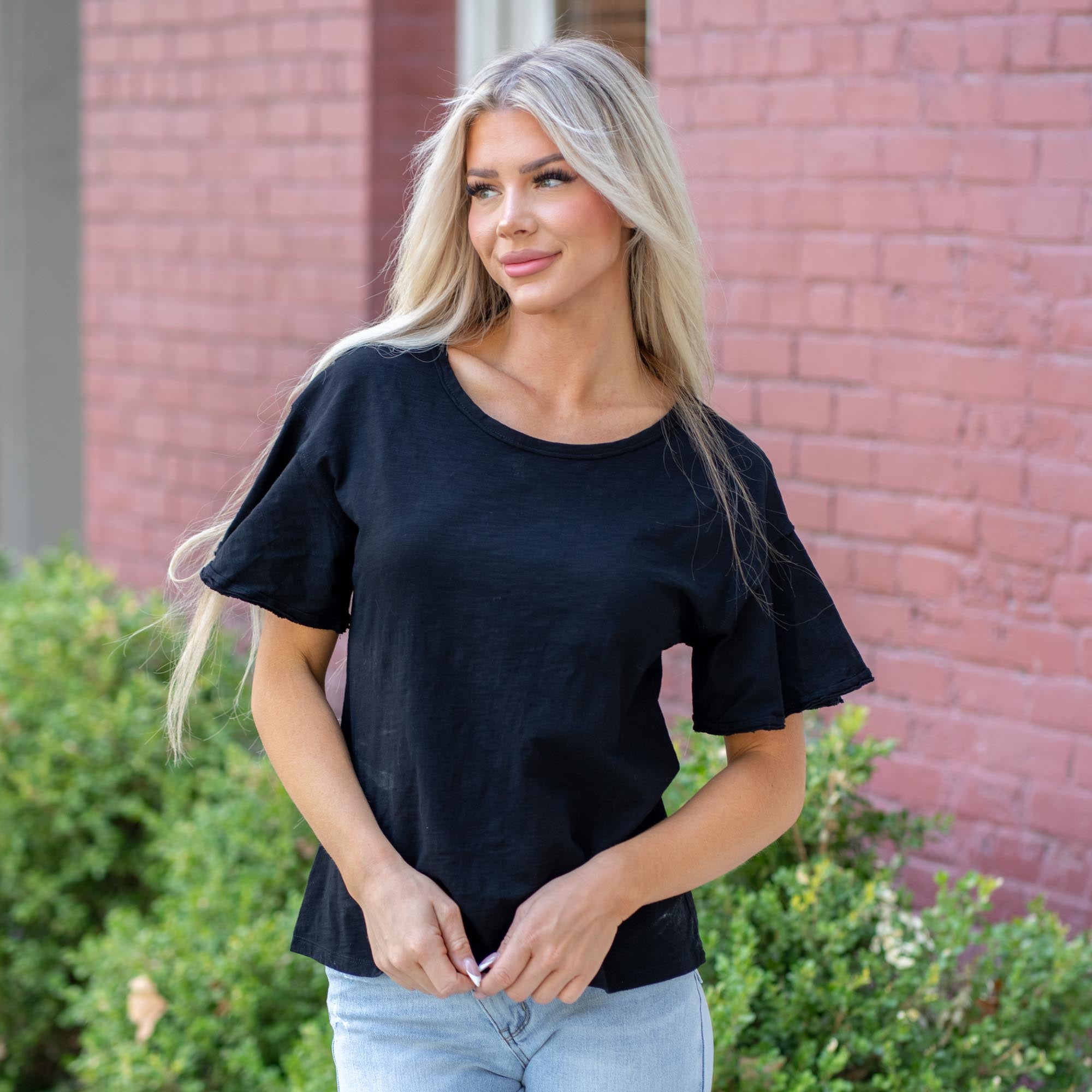 Keep it cool and effortlessly chic with the Raw Edge Relaxed Knit Tee in Black. This short sleeve knit top features raw edge detailing that adds a touch of casual edge while keeping the look versatile. Crafted from soft, breathable fabric, it’s the perfect staple to style with jeans, shorts, or layered under a jacket. A must-have basic with just the right amount of attitude.