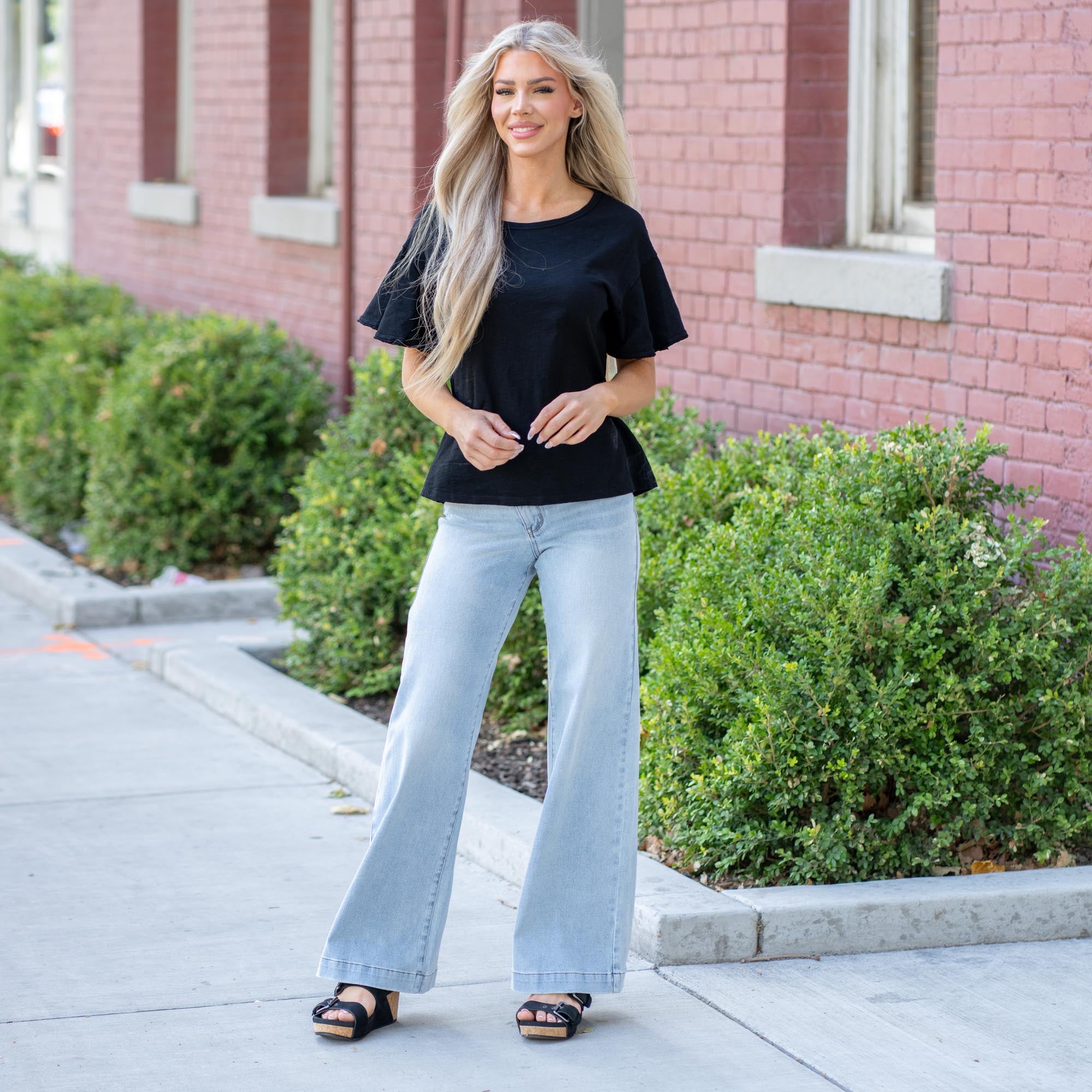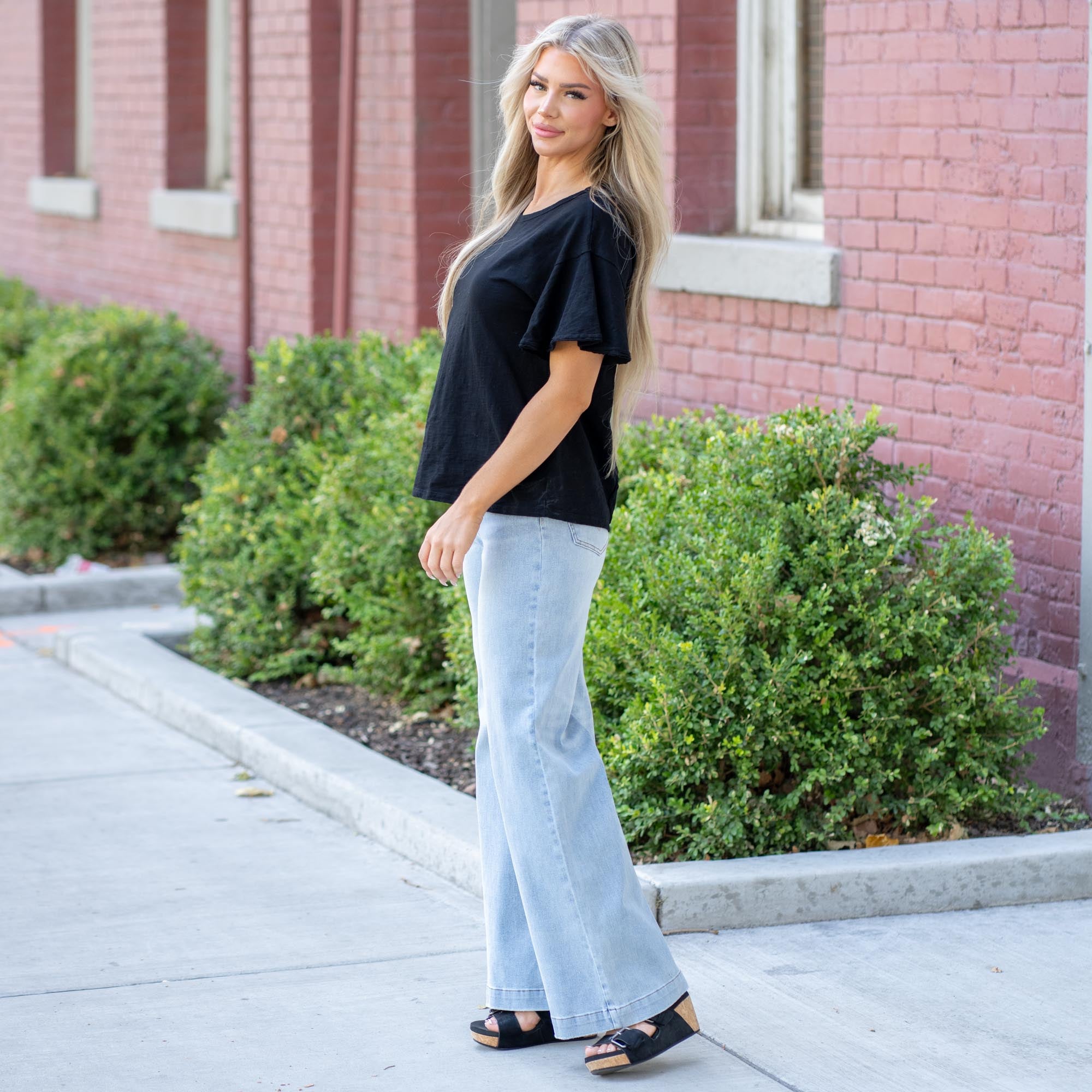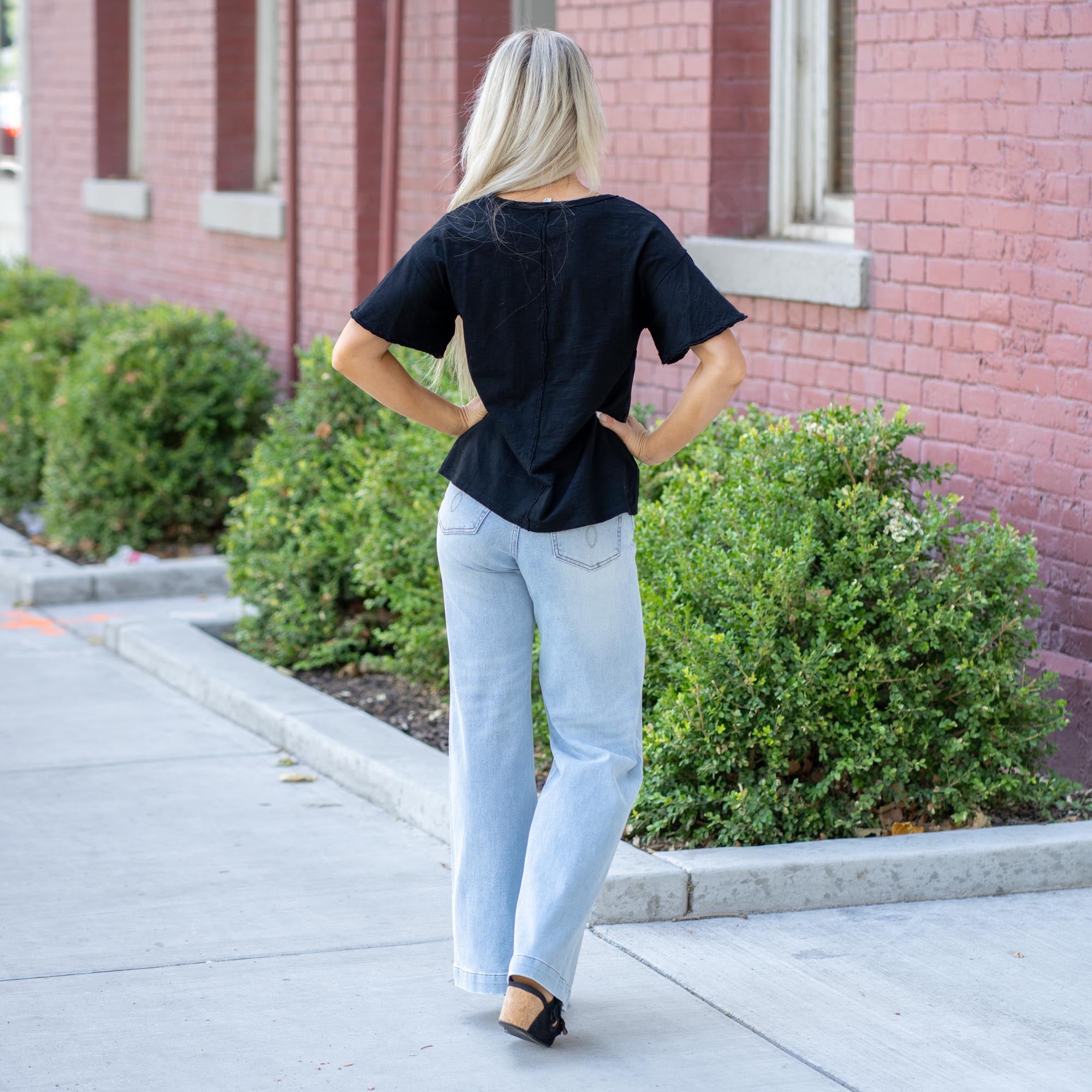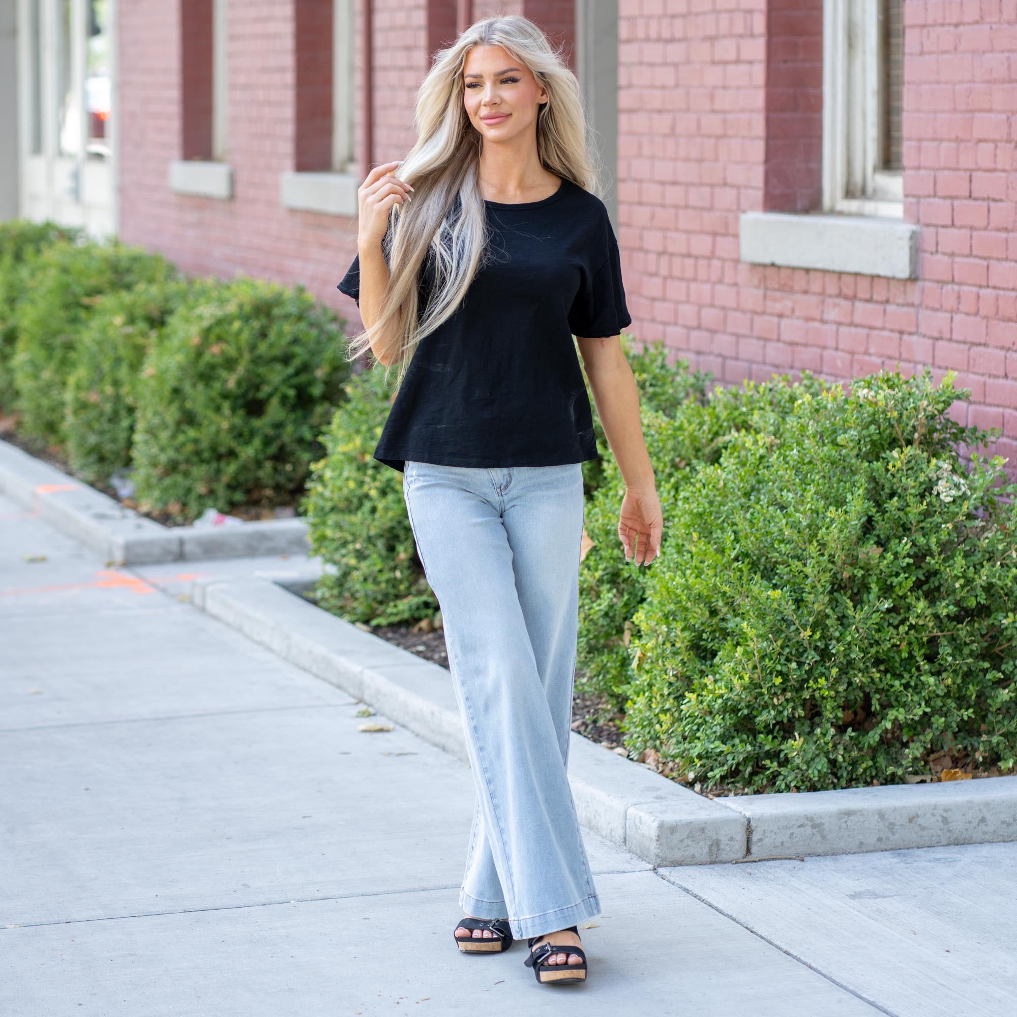 Keep it cool and effortlessly chic with the Raw Edge Relaxed Knit Tee in Black. This short sleeve knit top features raw edge detailing that adds a touch of casual edge while keeping the look versatile. Crafted from soft, breathable fabric, it’s the perfect staple to style with jeans, shorts, or layered under a jacket. A must-have basic with just the right amount of attitude.