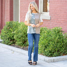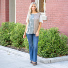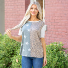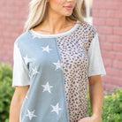Add a pop of personality to your everyday look with the Starlit Contrast Leopard Knit Tee in Olive. This short sleeve knit top is designed with a bold half-and-half pattern—one side with a dreamy star print, the other with chic leopard contrast—finished with edgy overlock stitch details for a modern touch. Soft, lightweight, and easy to wear, it’s the perfect statement piece to pair with your favorite jeans or shorts for a fun, casual-chic vibe.