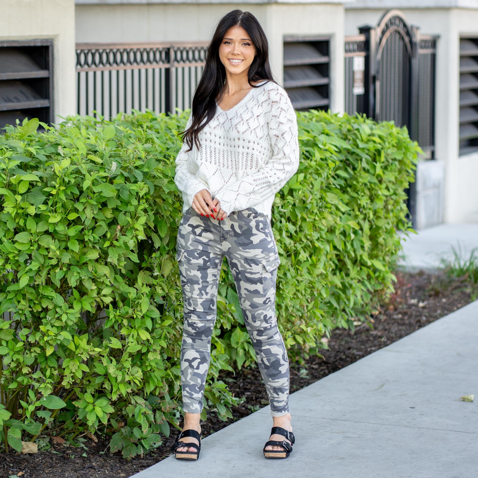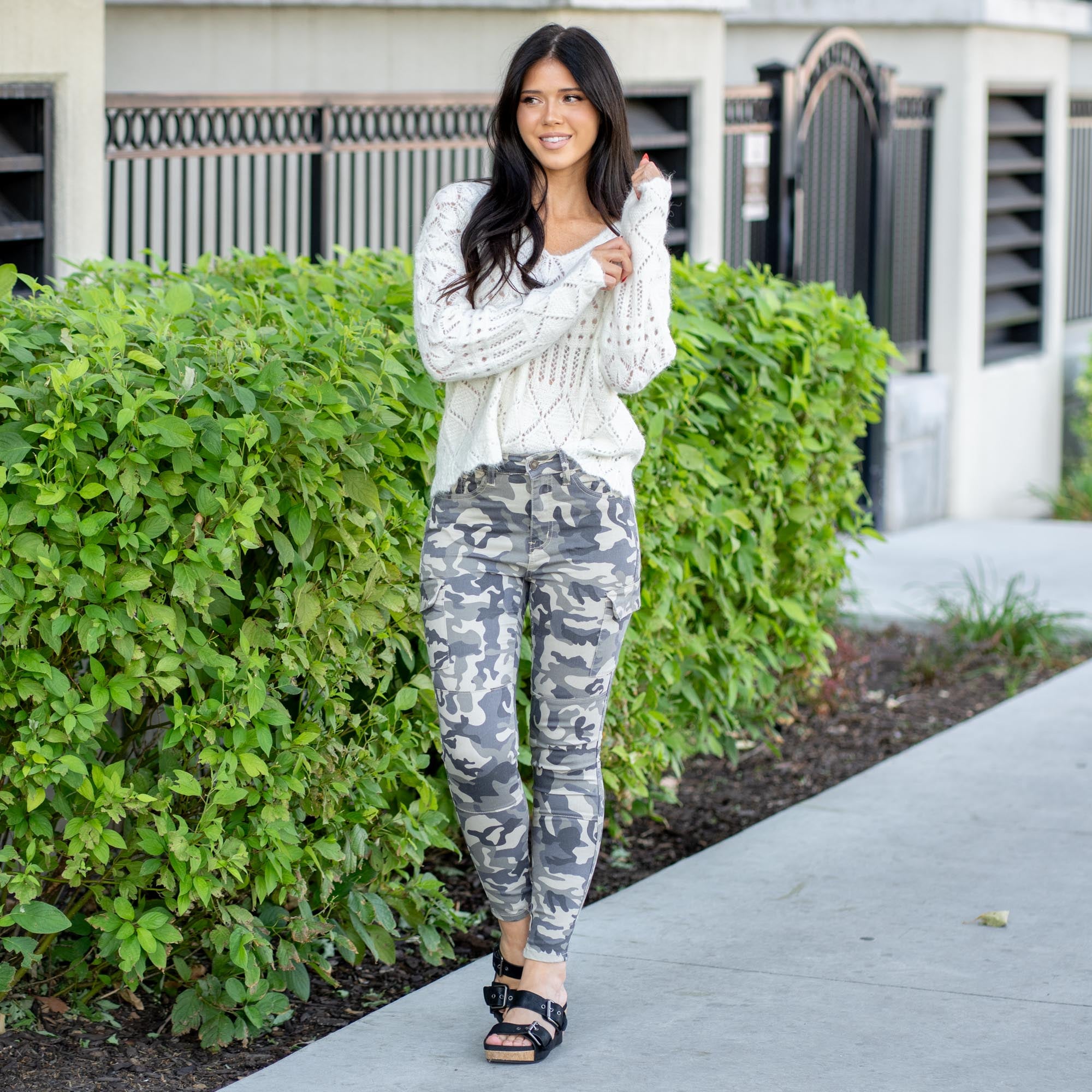 Bring some edge to your everyday style with the Stealth Mode Mid Rise Camo Cargo Pants. Designed in a light camo rinse wash, these ankle-skimming skinnies strike the perfect balance between trendy and versatile. Featuring a mid-rise waist, hidden 4-piece snap button closure, and functional cargo pockets, they deliver both style and utility. Finished with a clean regular hem, these cargos pair effortlessly with sneakers, boots, or even heels for a bold, modern vibe.