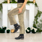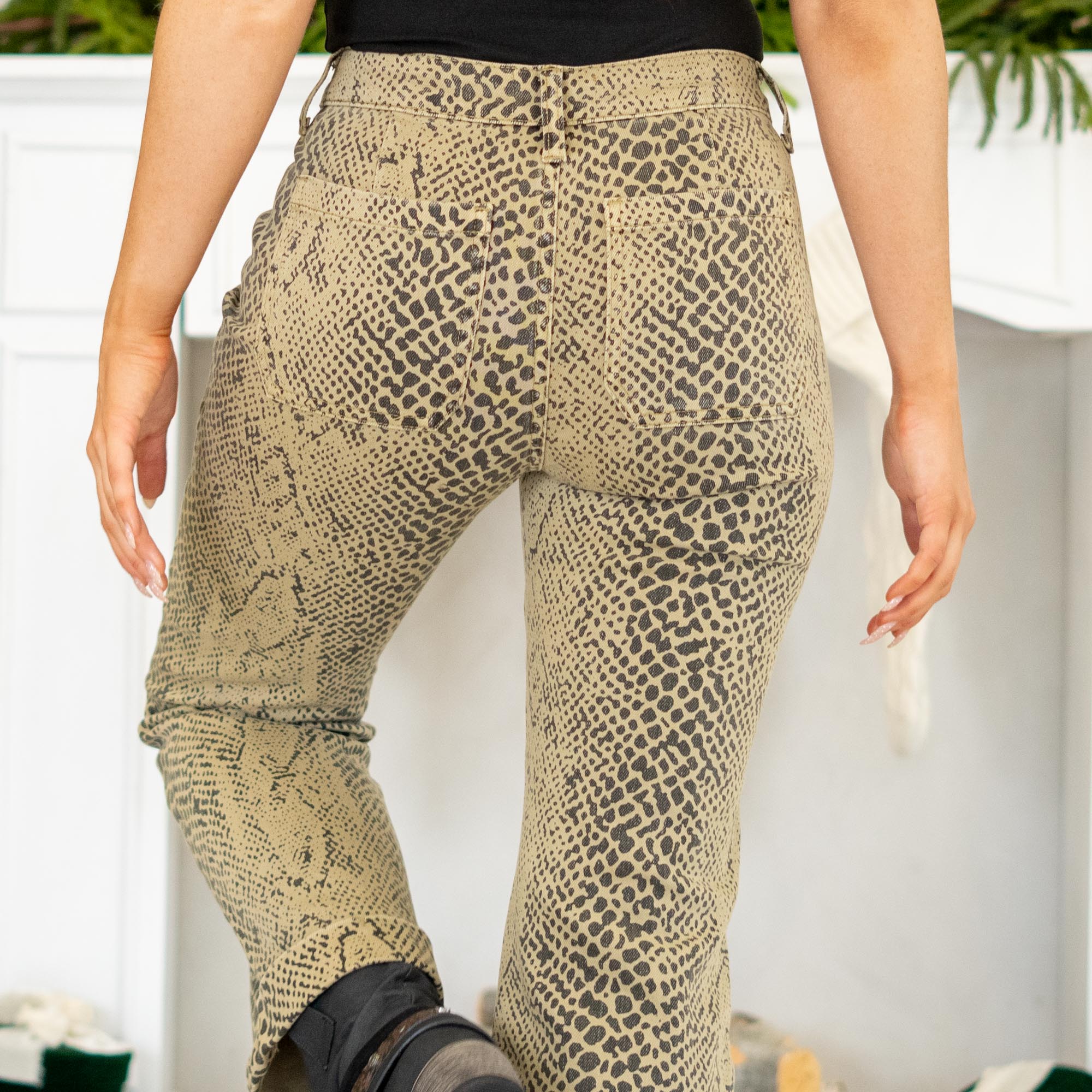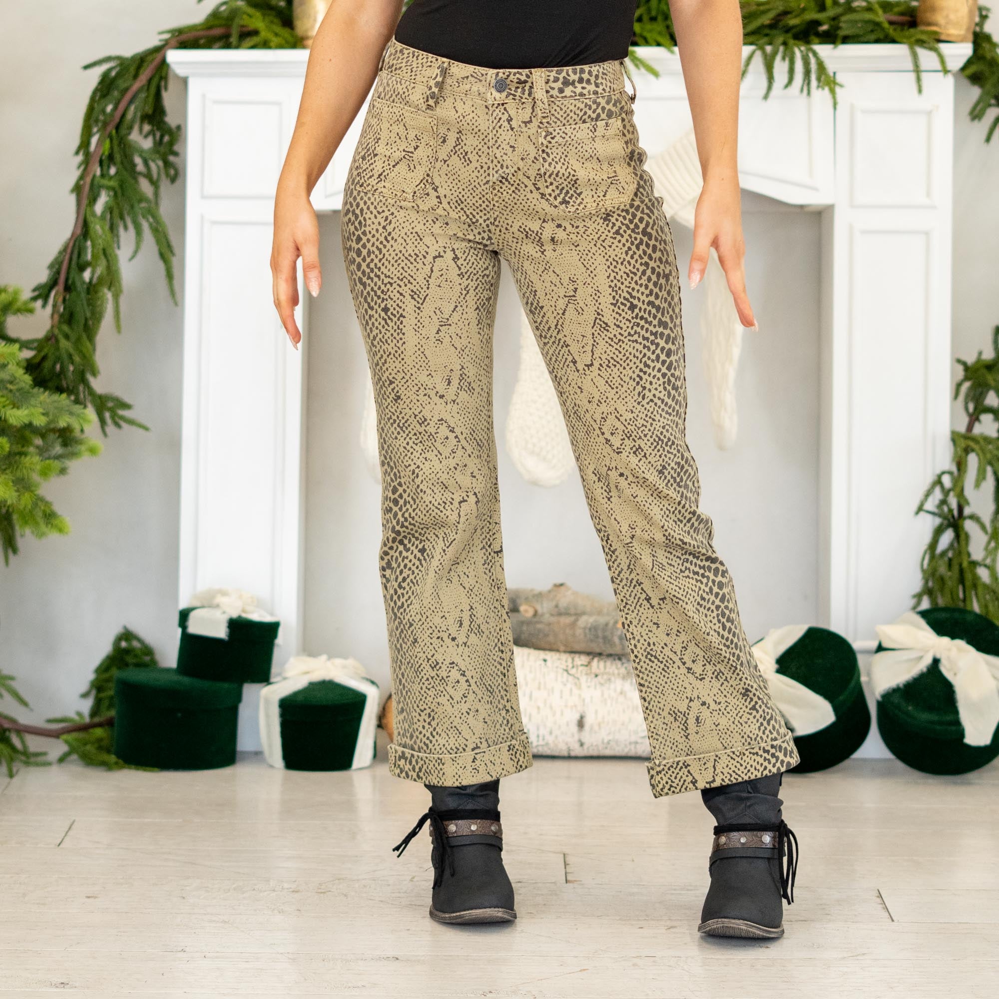 Step into bold sophistication with the Renae Mid Rise Slim Wide Leg Jeans. Designed in a hypnotic olive snakeskin print, these jeans redefine statement denim with their sleek, body-contouring fit and subtle stretch for effortless comfort. The mid-rise waist flatters your figure, while the slim wide-leg silhouette adds a modern edge that’s both versatile and on-trend.