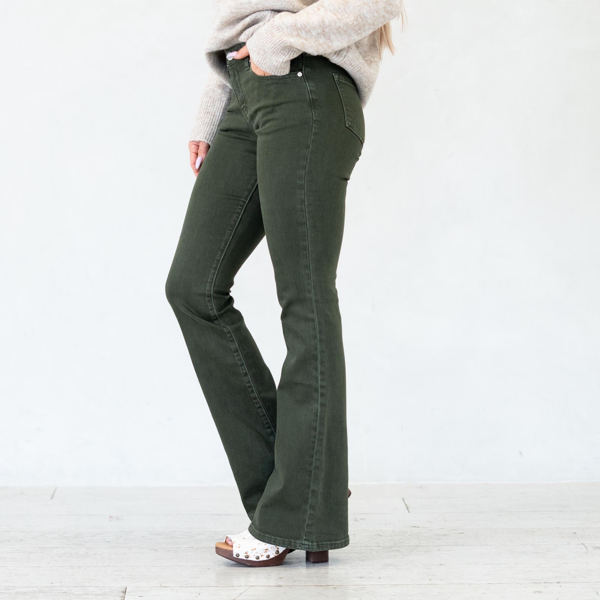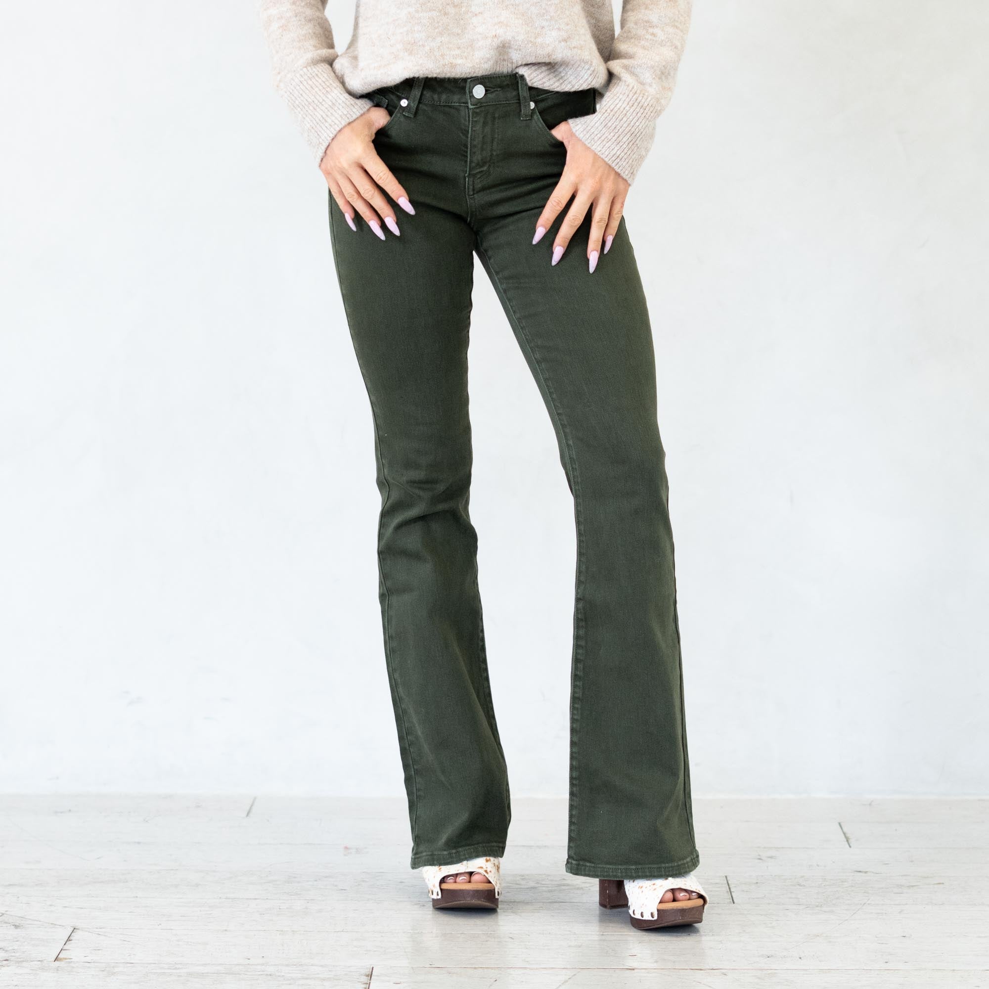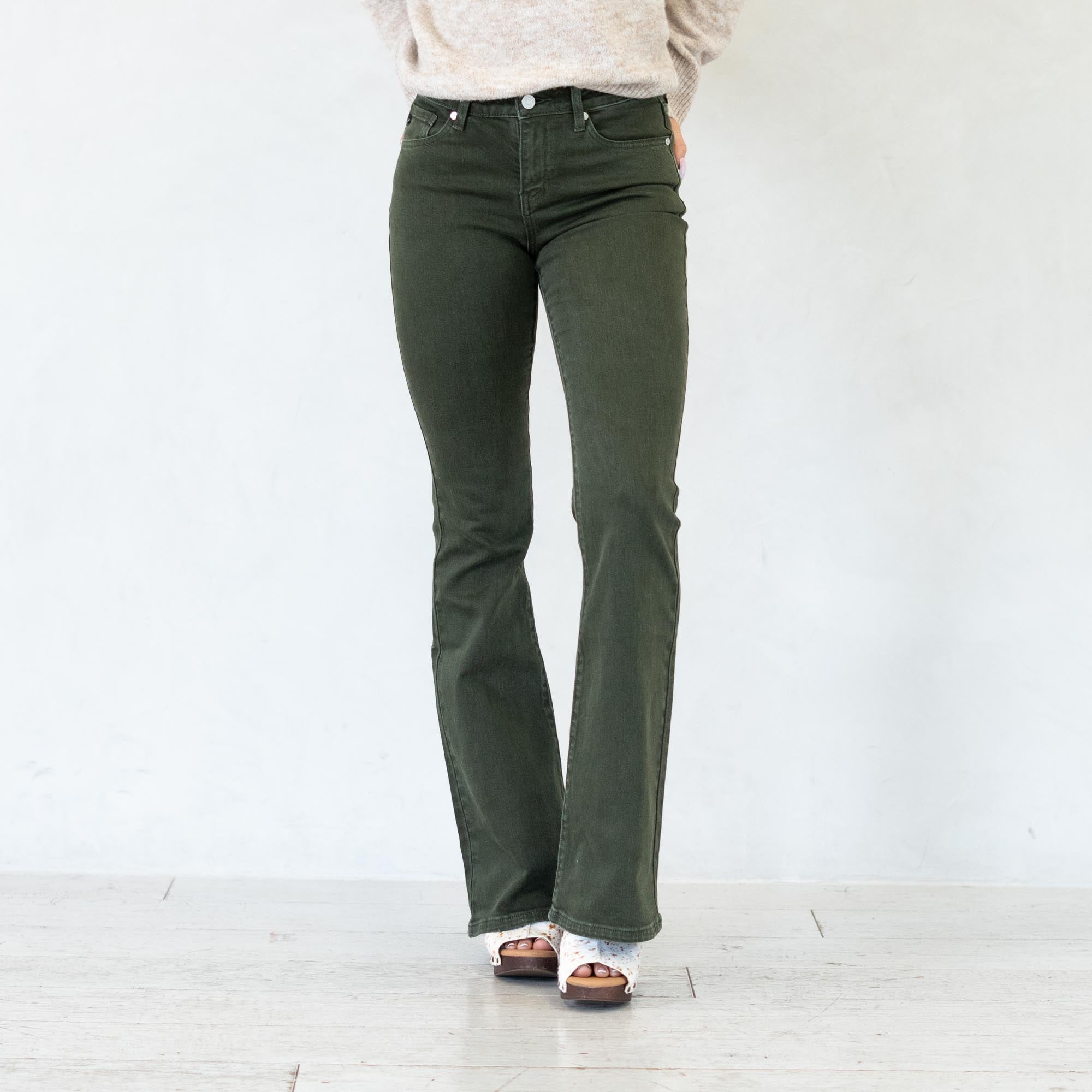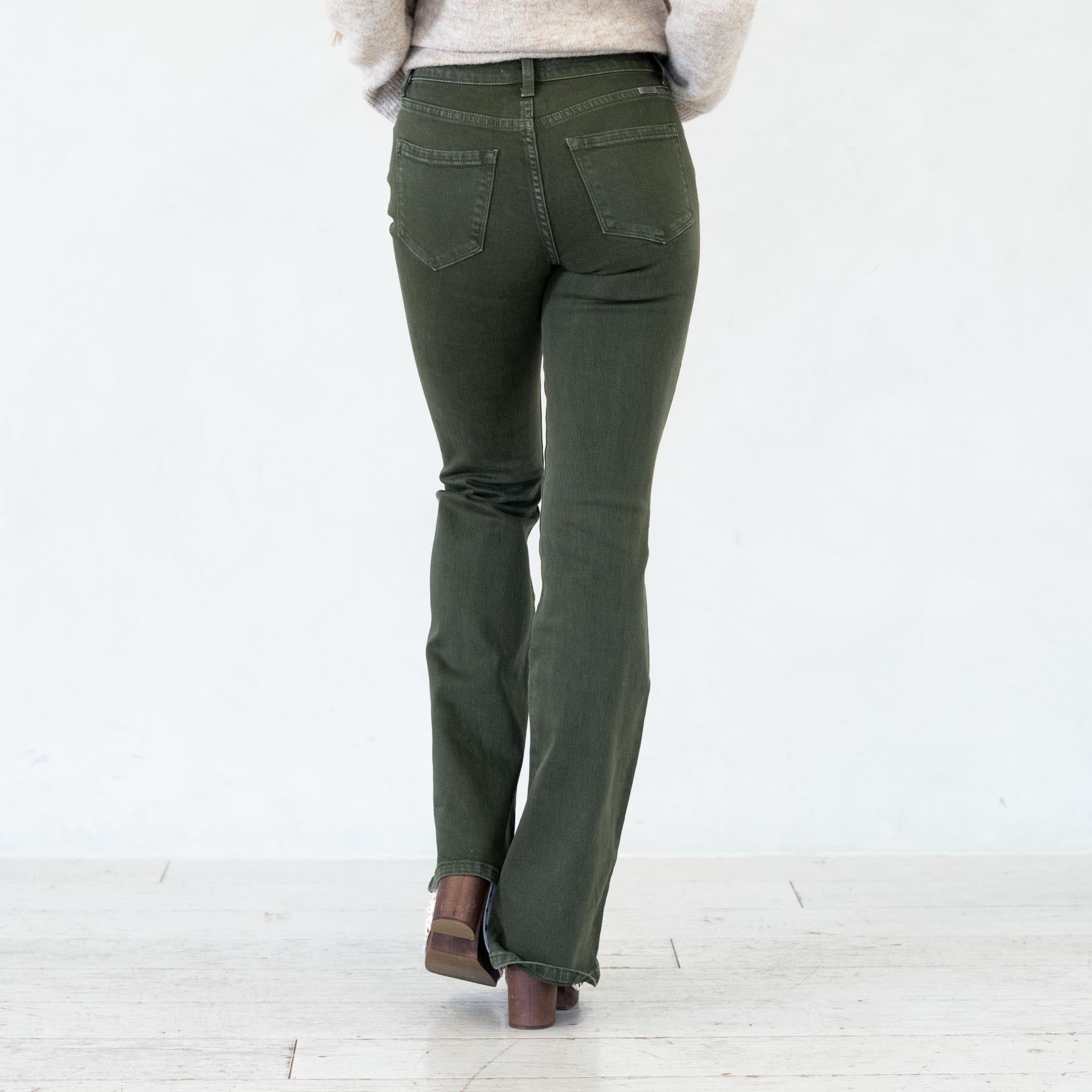 Stand out in effortless style with the Isla High Rise Olive Flare Jeans. Designed in a rich olive hue, these jeans bring a bold twist to a classic silhouette. The high-rise waist flatters your figure while the flare leg creates a long, lean shape that moves beautifully with every step.