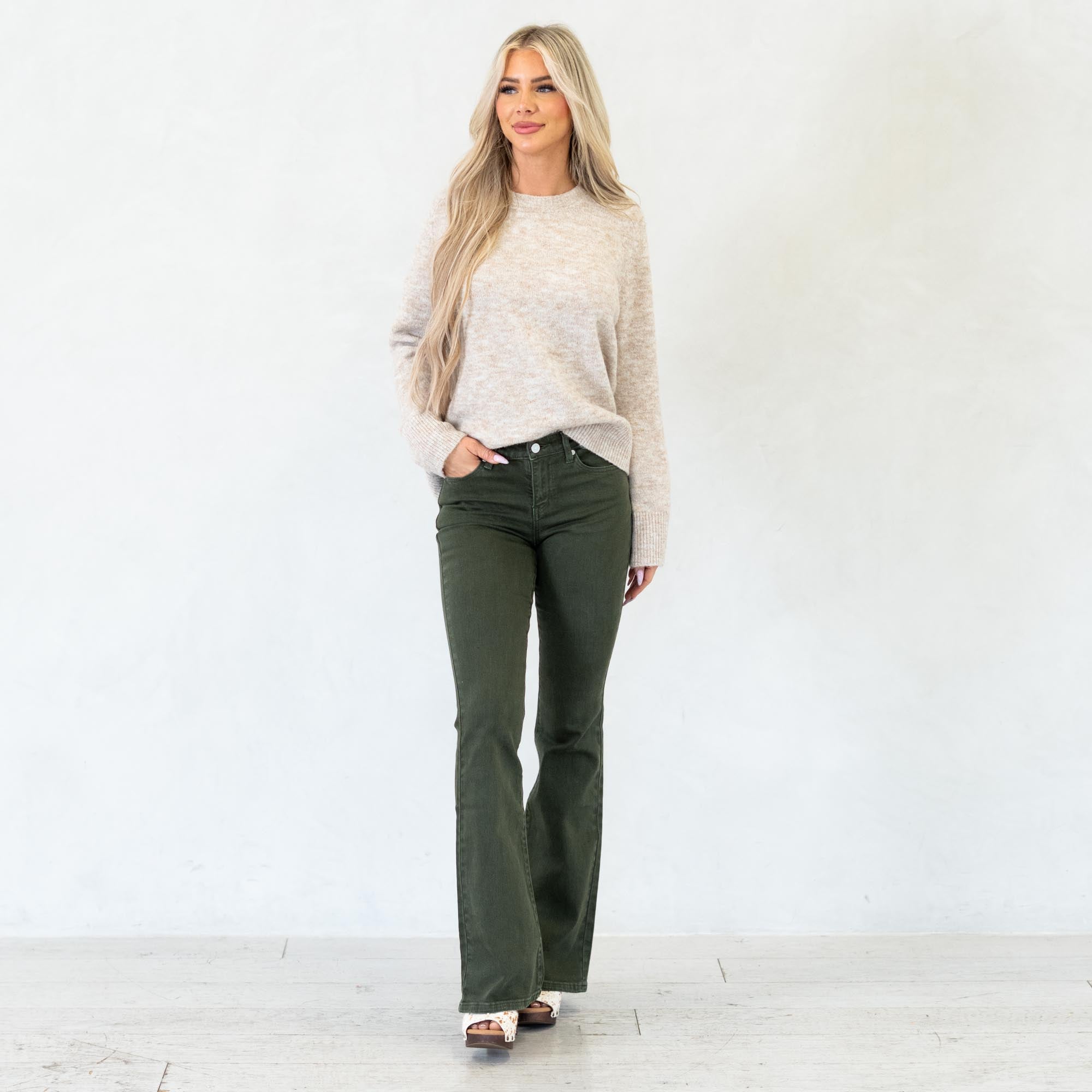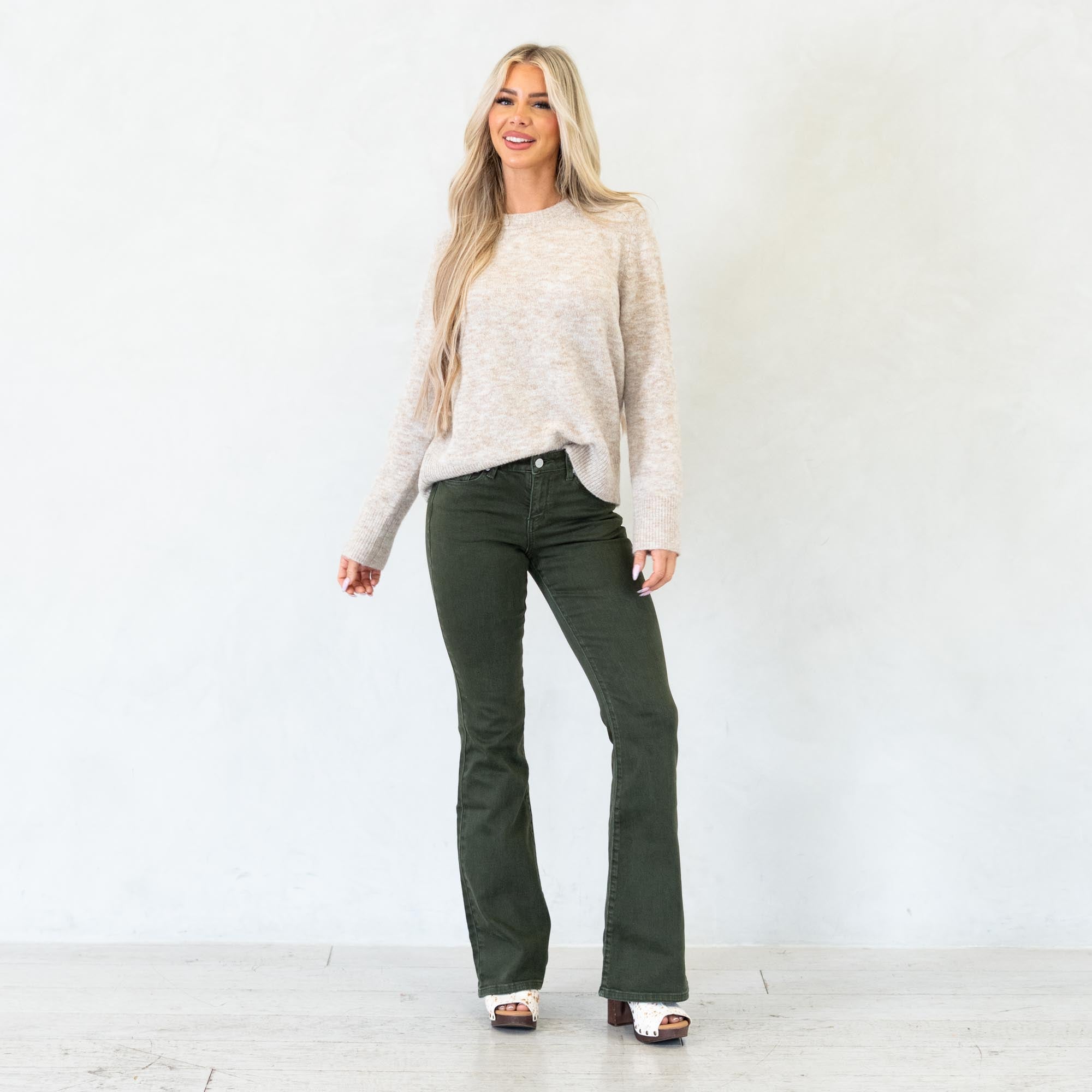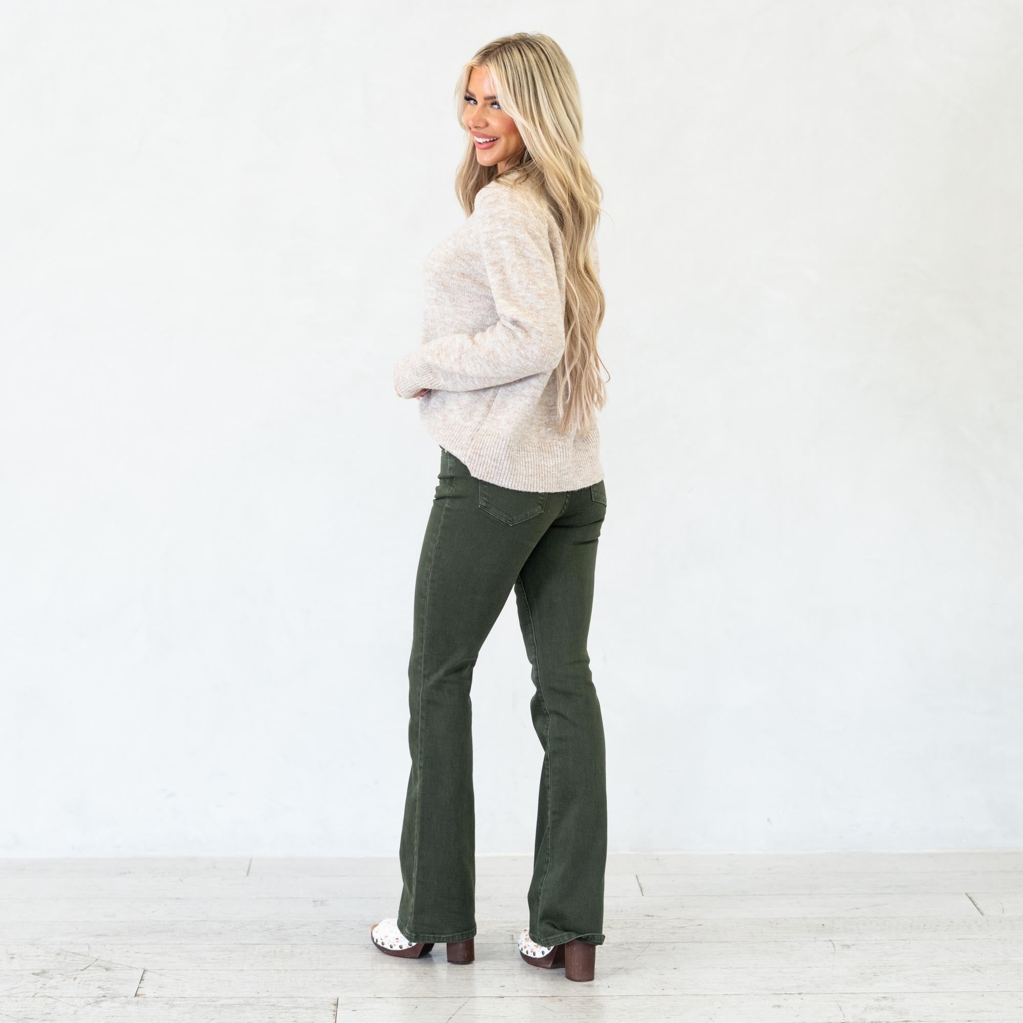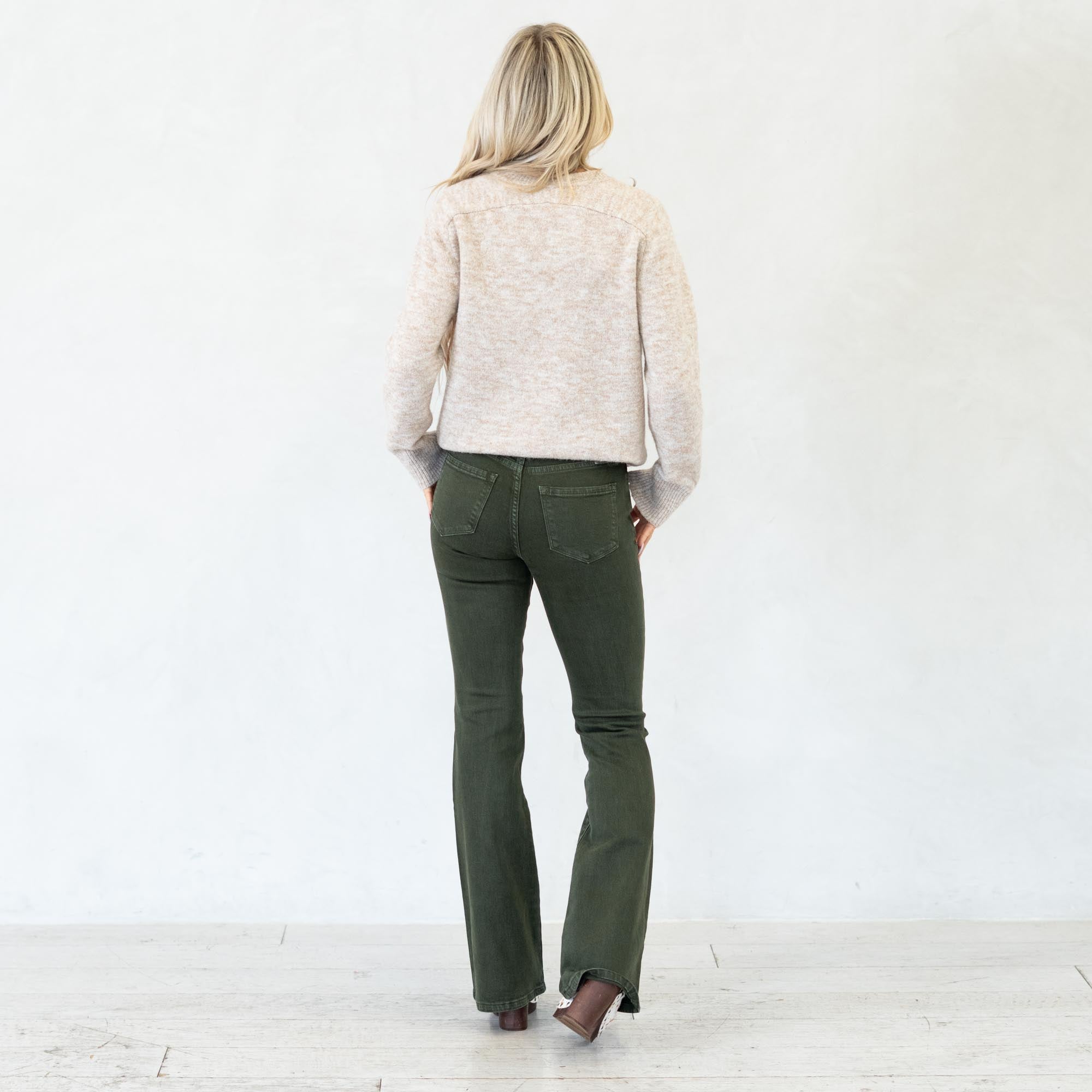 Stand out in effortless style with the Isla High Rise Olive Flare Jeans. Designed in a rich olive hue, these jeans bring a bold twist to a classic silhouette. The high-rise waist flatters your figure while the flare leg creates a long, lean shape that moves beautifully with every step.