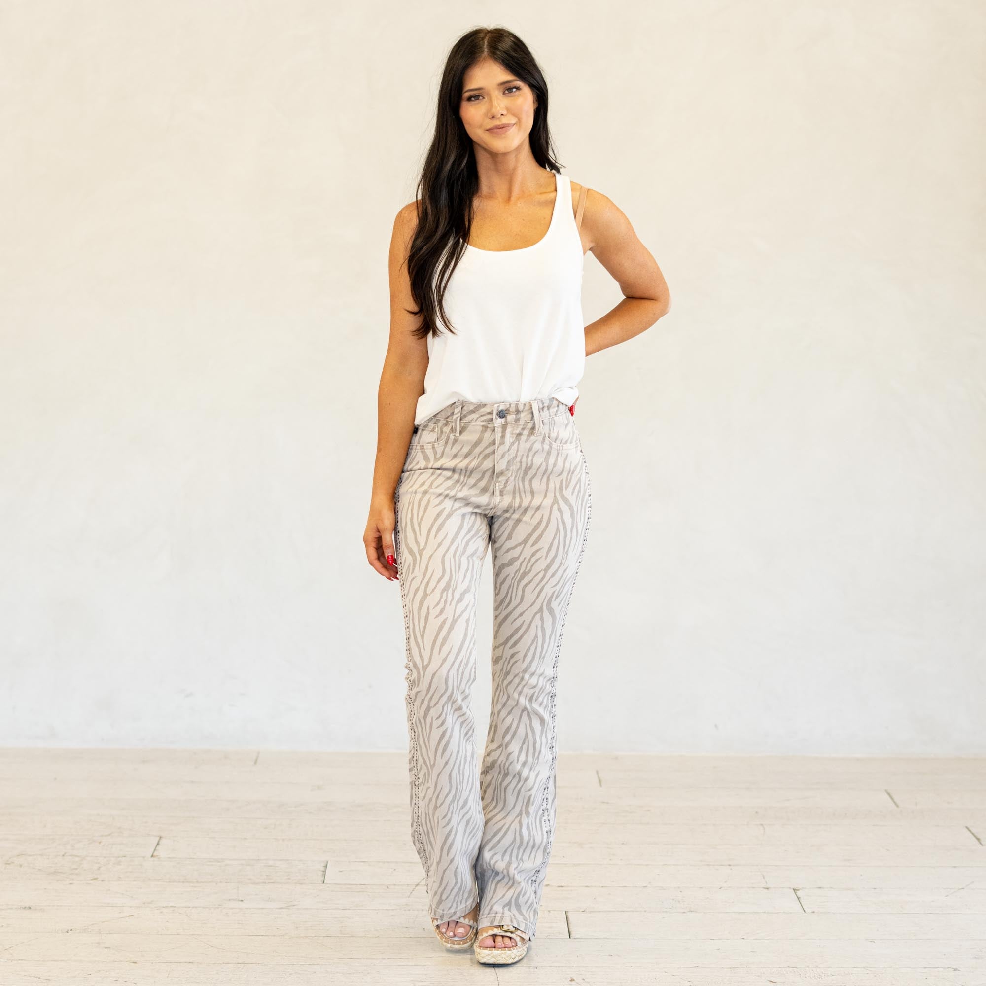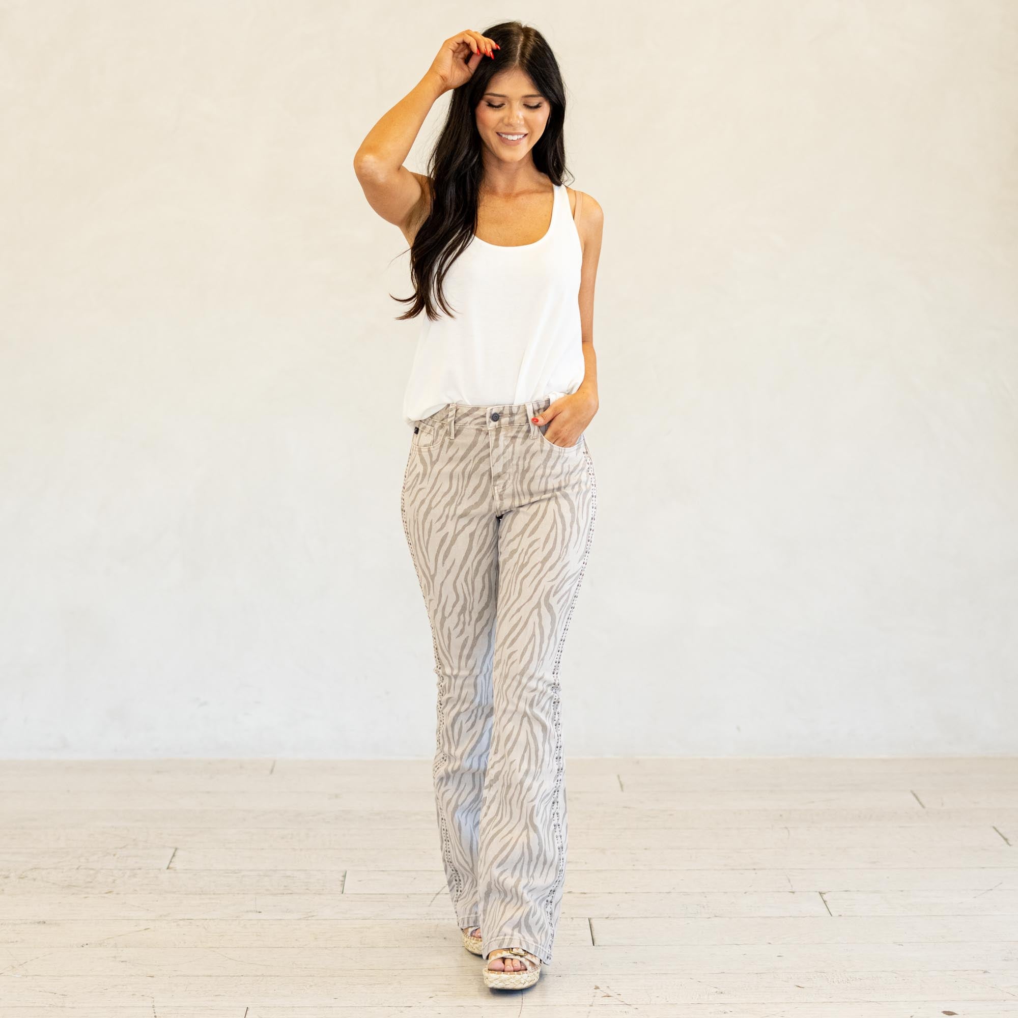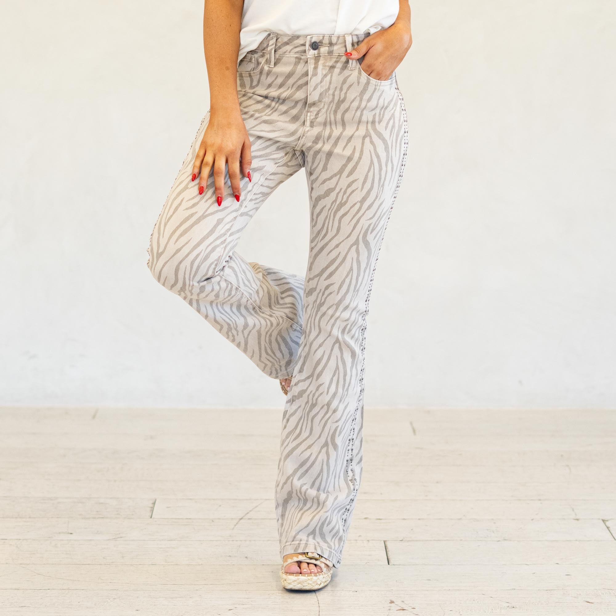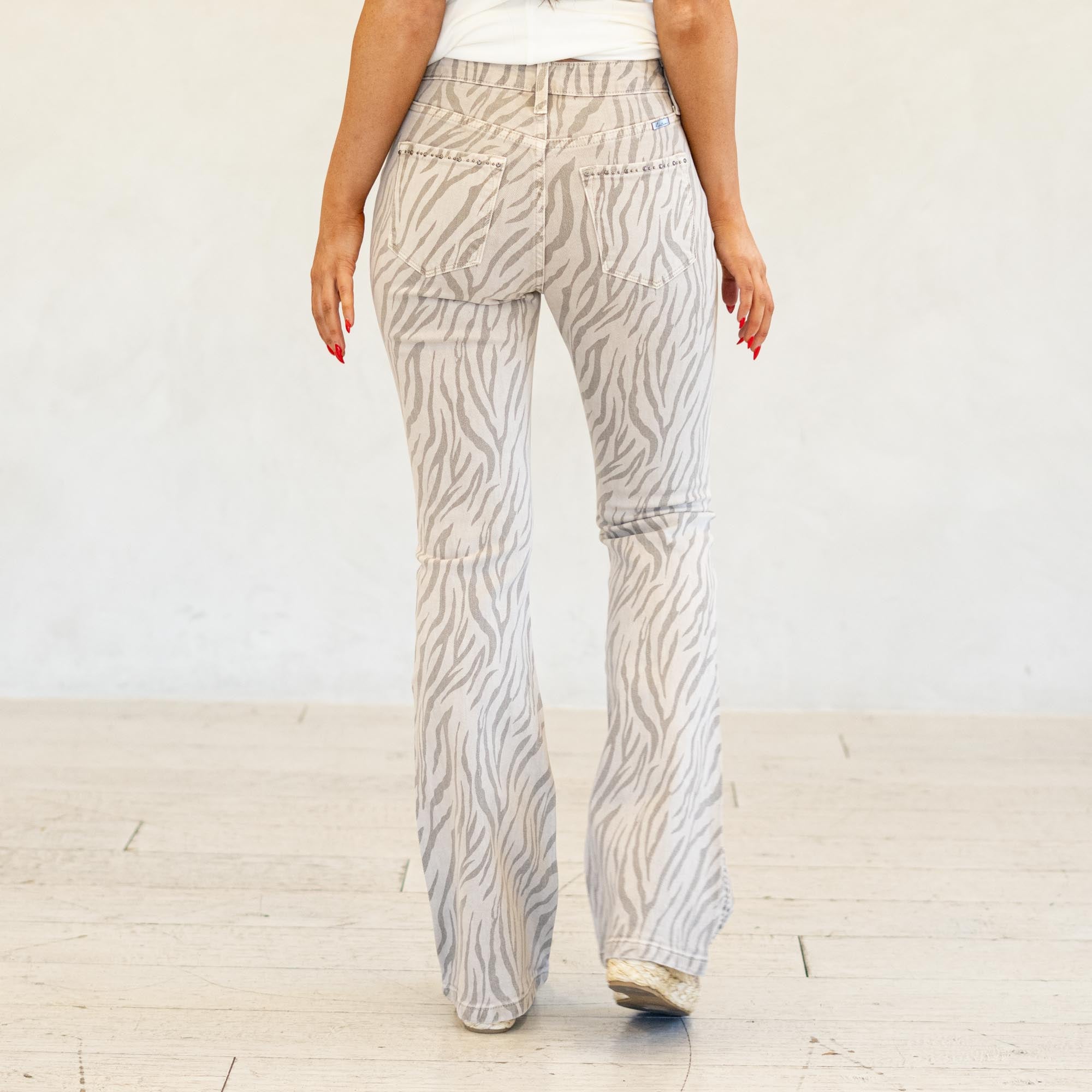 Bring bold energy to your denim collection with the Zellie High Rise Flare Jeans. Designed in a contrasting beige zebra print, this statement style hugs the waist and thighs before flaring out below the knee for a leg-lengthening silhouette.