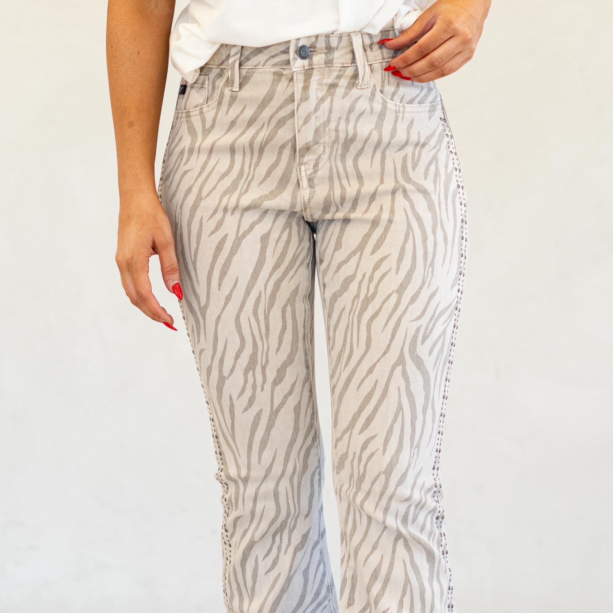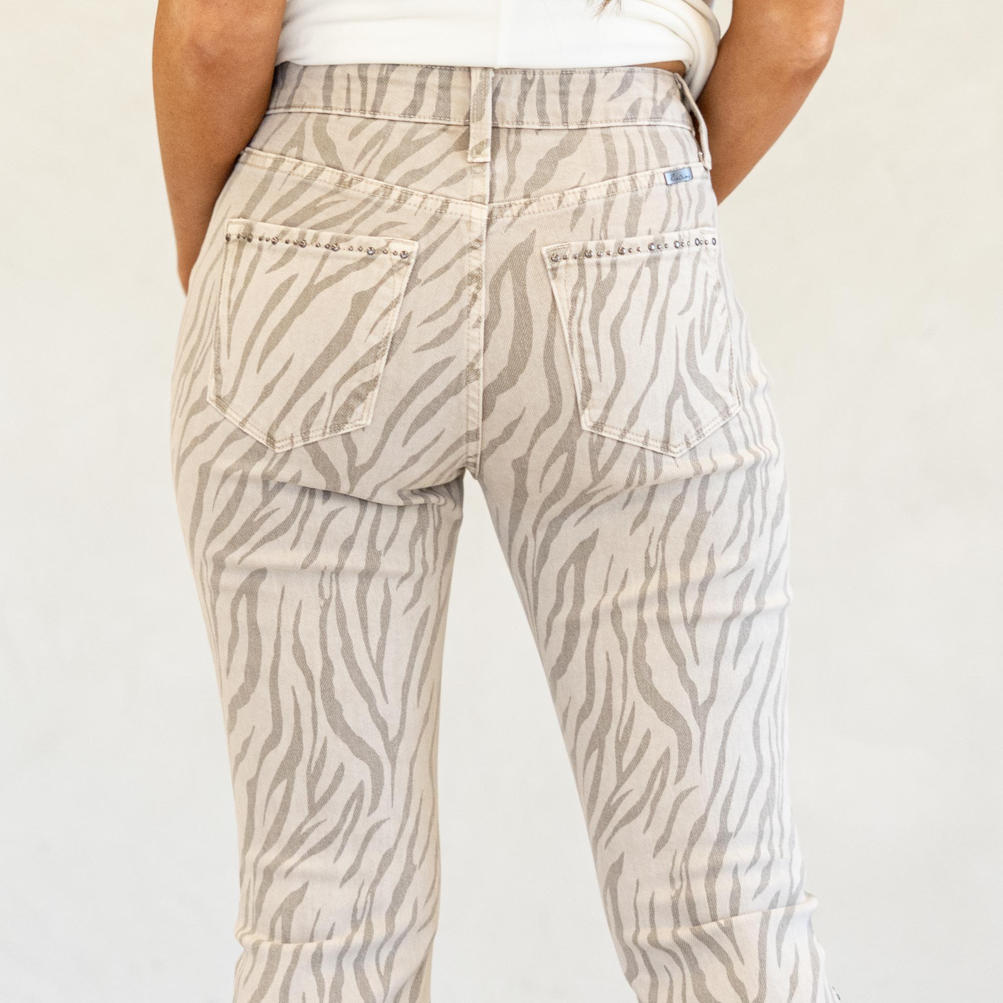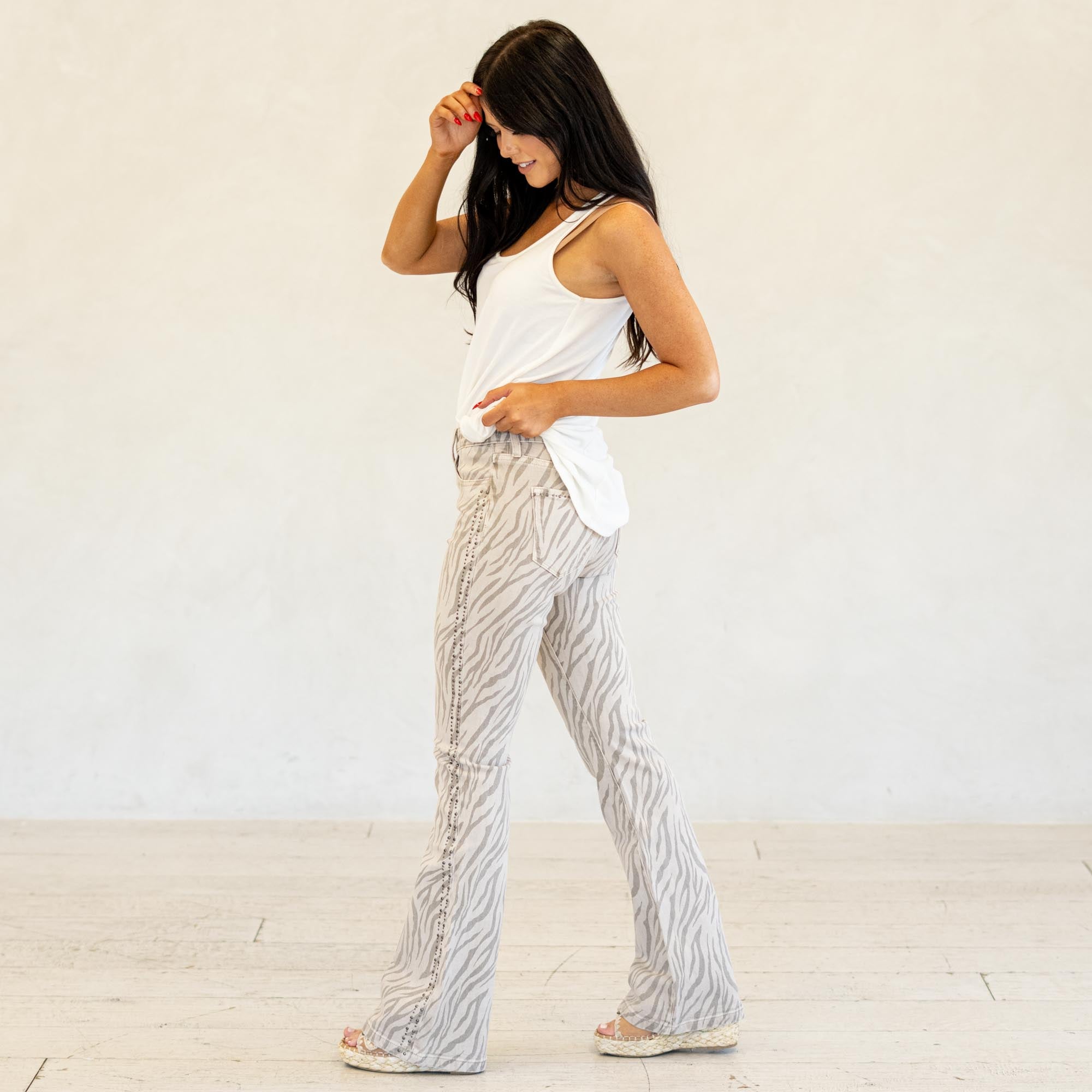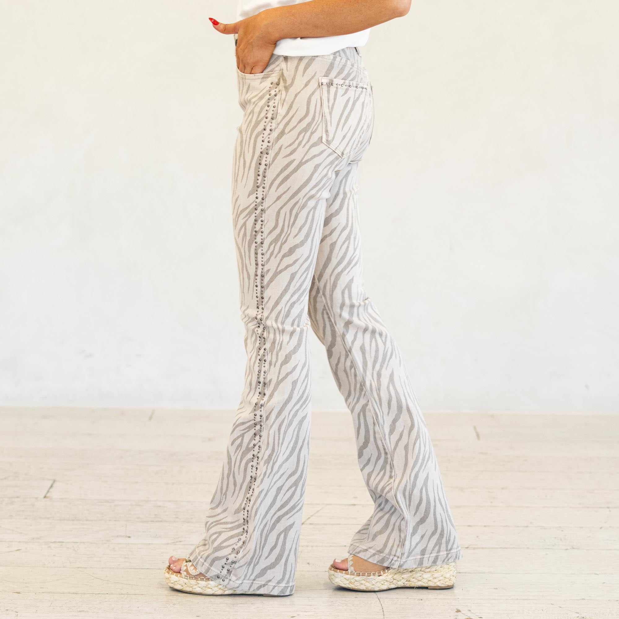 Bring bold energy to your denim collection with the Zellie High Rise Flare Jeans. Designed in a contrasting beige zebra print, this statement style hugs the waist and thighs before flaring out below the knee for a leg-lengthening silhouette.