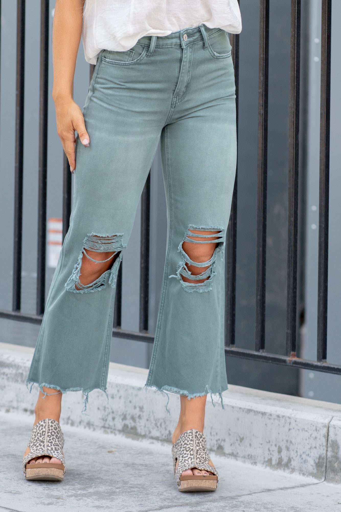 These jeans feature a high waist with a cropped flare bottom and distressed legs in a pretty balsam wash in nonstretch denim.