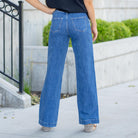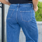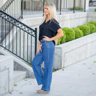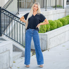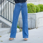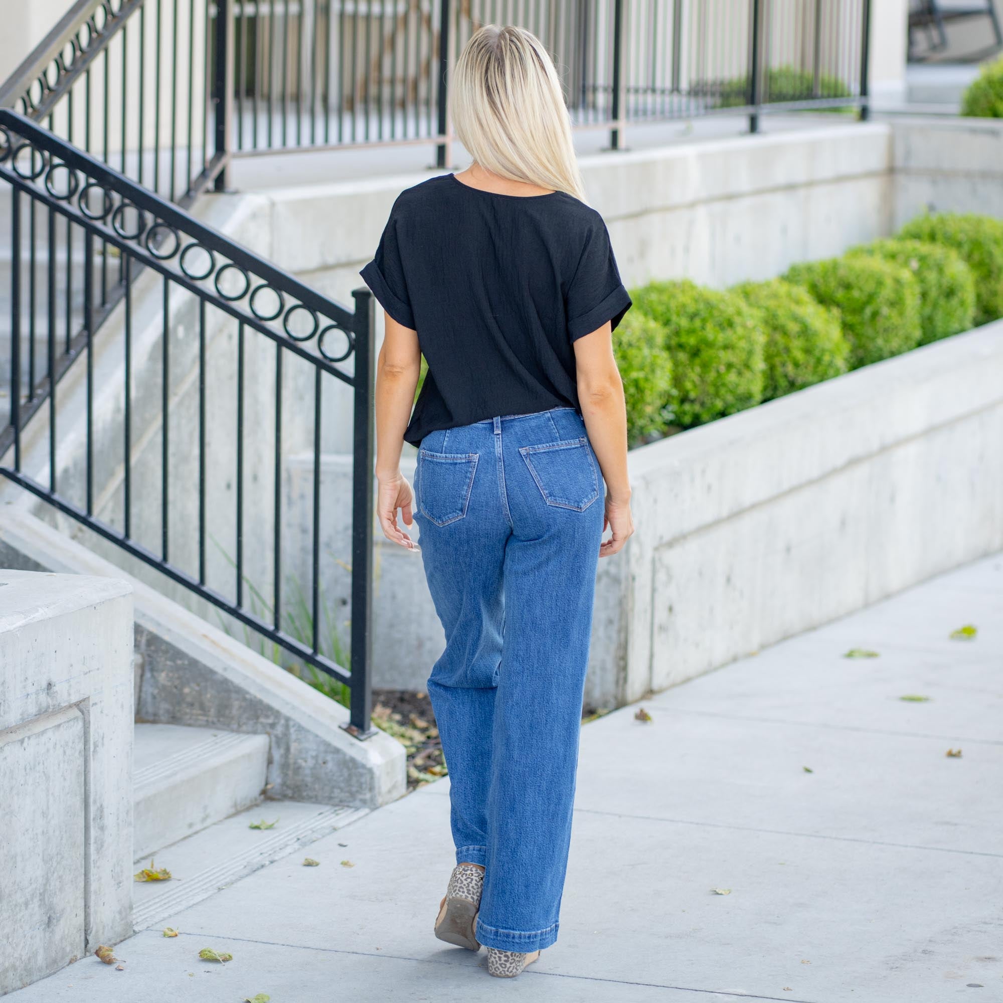 Sophisticated meets effortless in the Sol High Rise Wide Leg Trouser Jean. Crafted in a rich dark wash, this style sits just above the waist and drapes beautifully down the leg for a sleek, elongated silhouette. The trouser-inspired cut delivers a polished look that transitions seamlessly from office to evening.