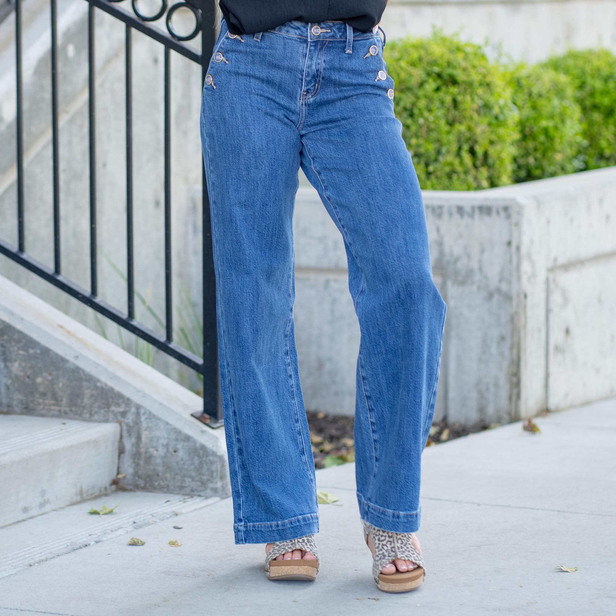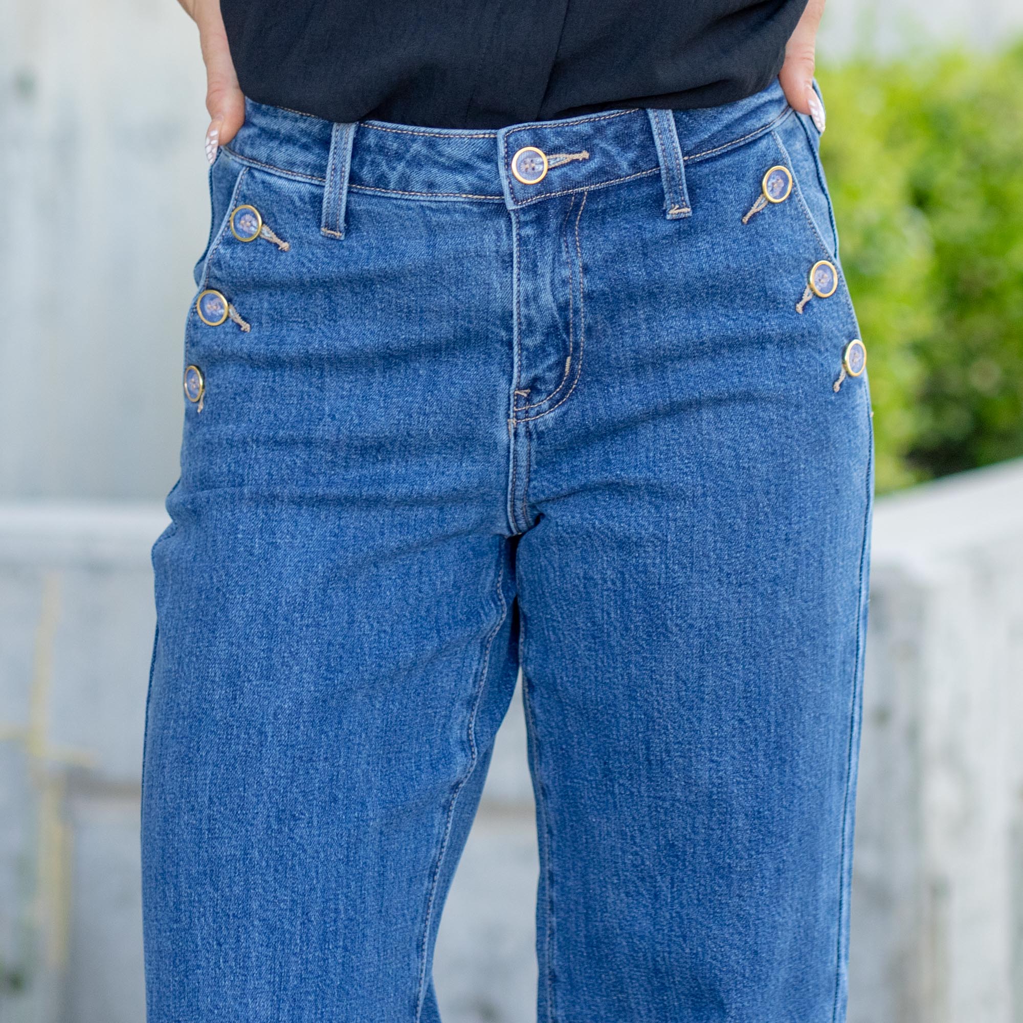 Front slant pockets are accented with decorative clear resin buttons for a refined touch, while a single-button closure and zip fly keep the design classic. Finished with subtle back dart details and a clean 1.25" hem, the Sol is an elevated denim essential with timeless appeal.