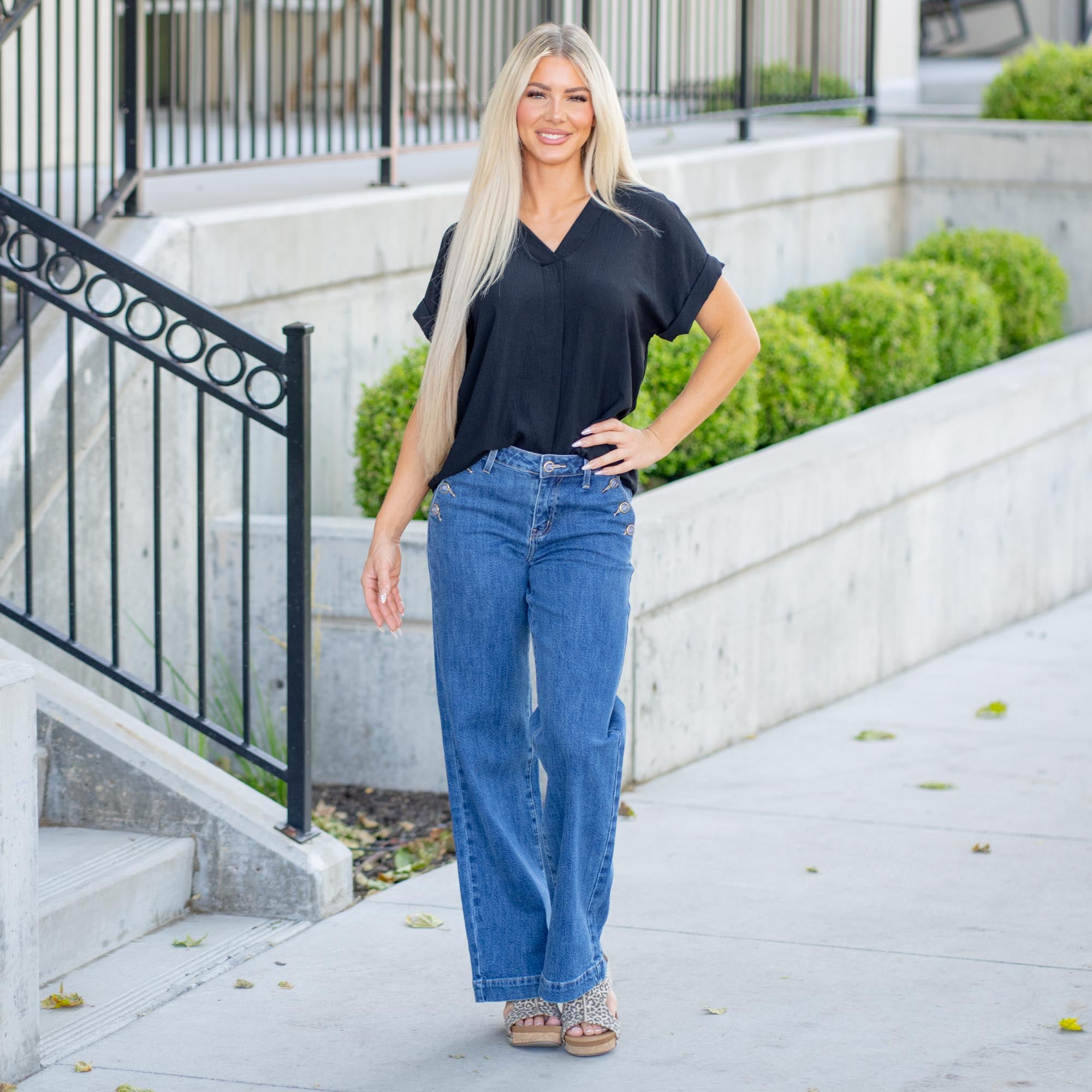 Sophisticated meets effortless in the Sol High Rise Wide Leg Trouser Jean. Crafted in a rich dark wash, this style sits just above the waist and drapes beautifully down the leg for a sleek, elongated silhouette. The trouser-inspired cut delivers a polished look that transitions seamlessly from office to evening.