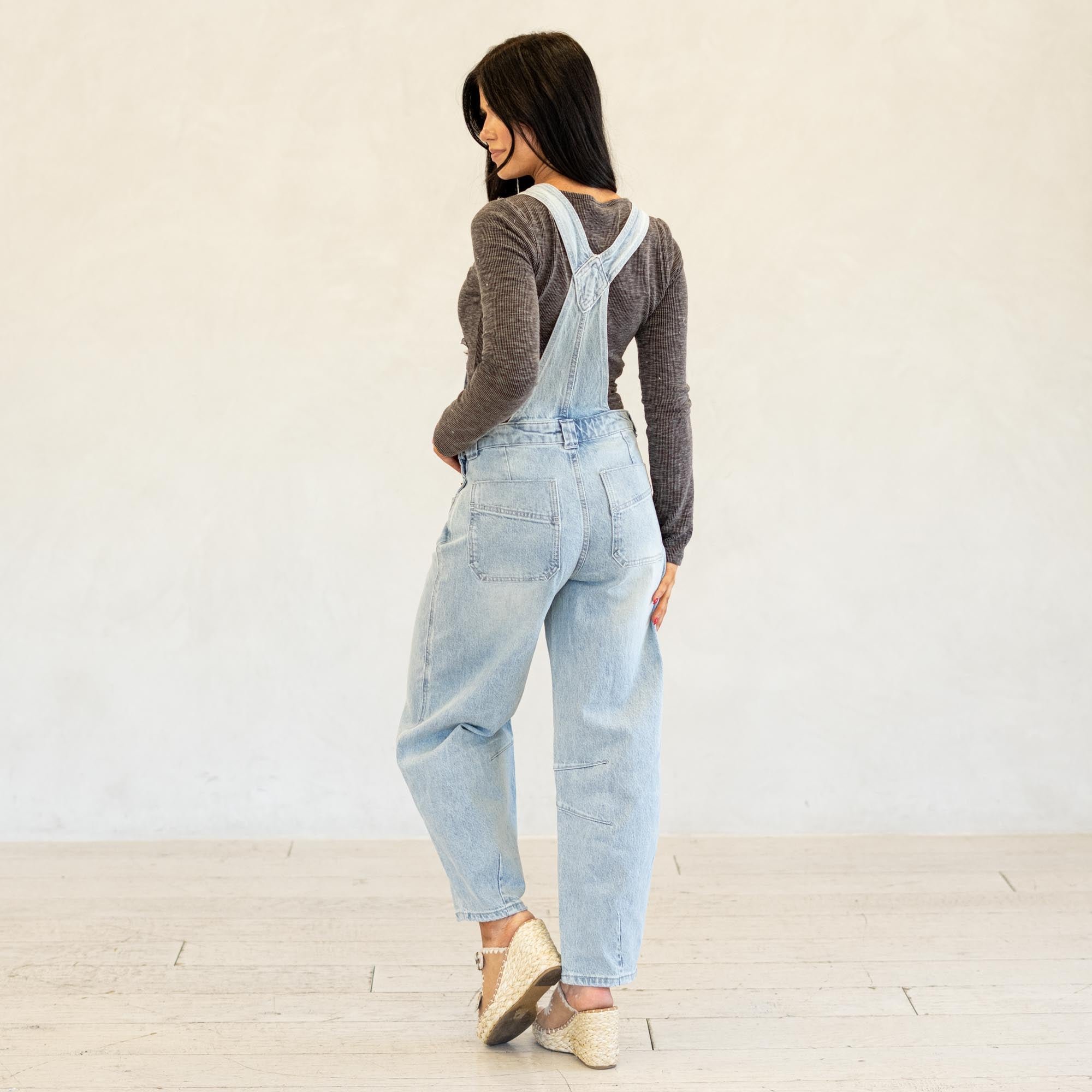 Dart details at the front and back knees accentuate the exaggerated curved leg, creating that trendy barrel shape while still keeping the look laid-back and versatile. Adjustable shoulder straps with buckle closures ensure a perfect fit, while side button closures add both function and charm.