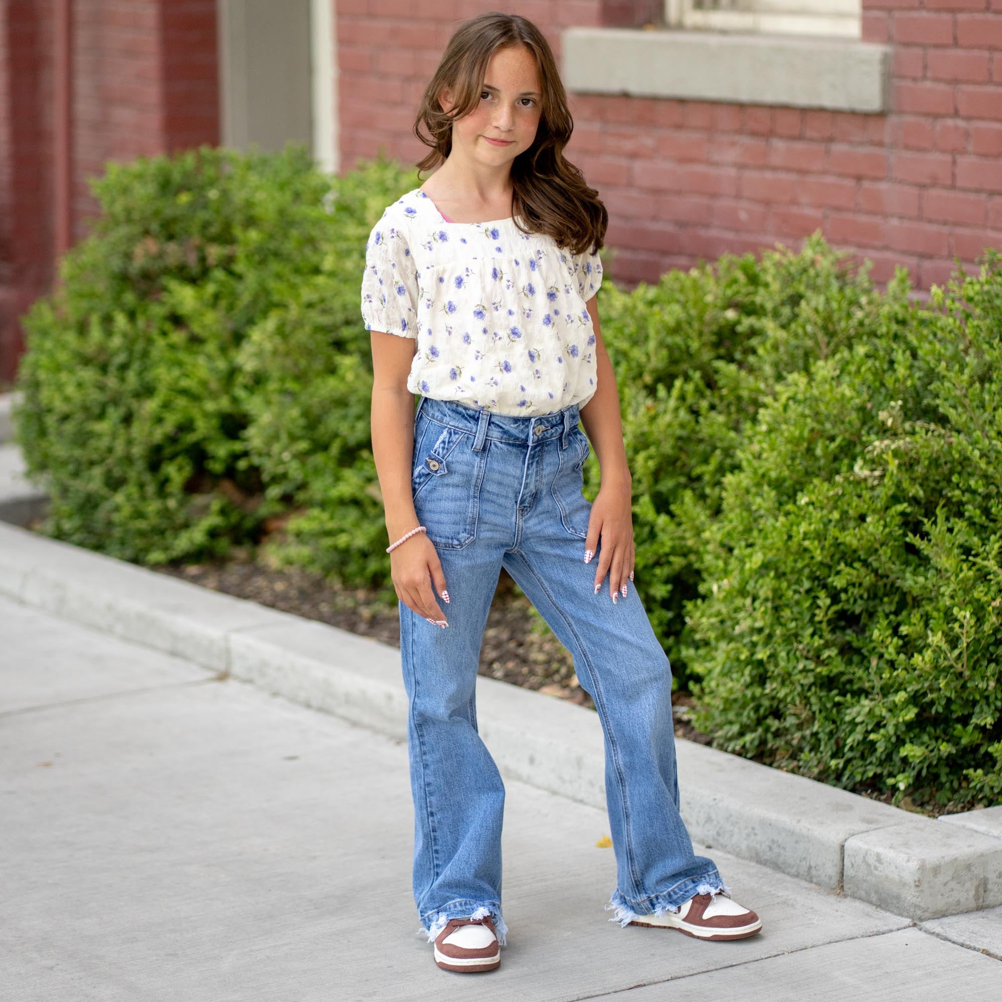 Meet Sherri — our newest go-to jean for your trendsetting kiddo! These high rise wide leg flare jeans come in a versatile medium wash and are made with comfort in mind for all-day wear. Finished with a 1" hem, porkchop pockets, a single button closure, and zip fly, the Sherri Jeans bring retro vibes with a modern fit.