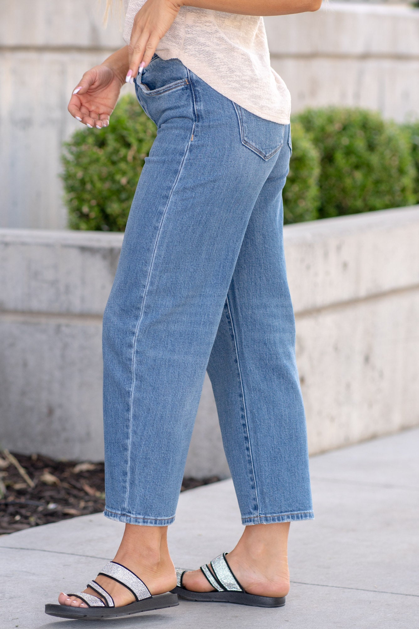 COMFORT STRETCH DENIM, SUPER HIGH RISE WAIST, CROPPED LENGTH, BARREL LEG JEANS