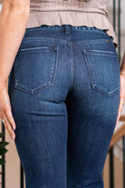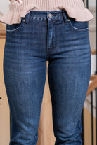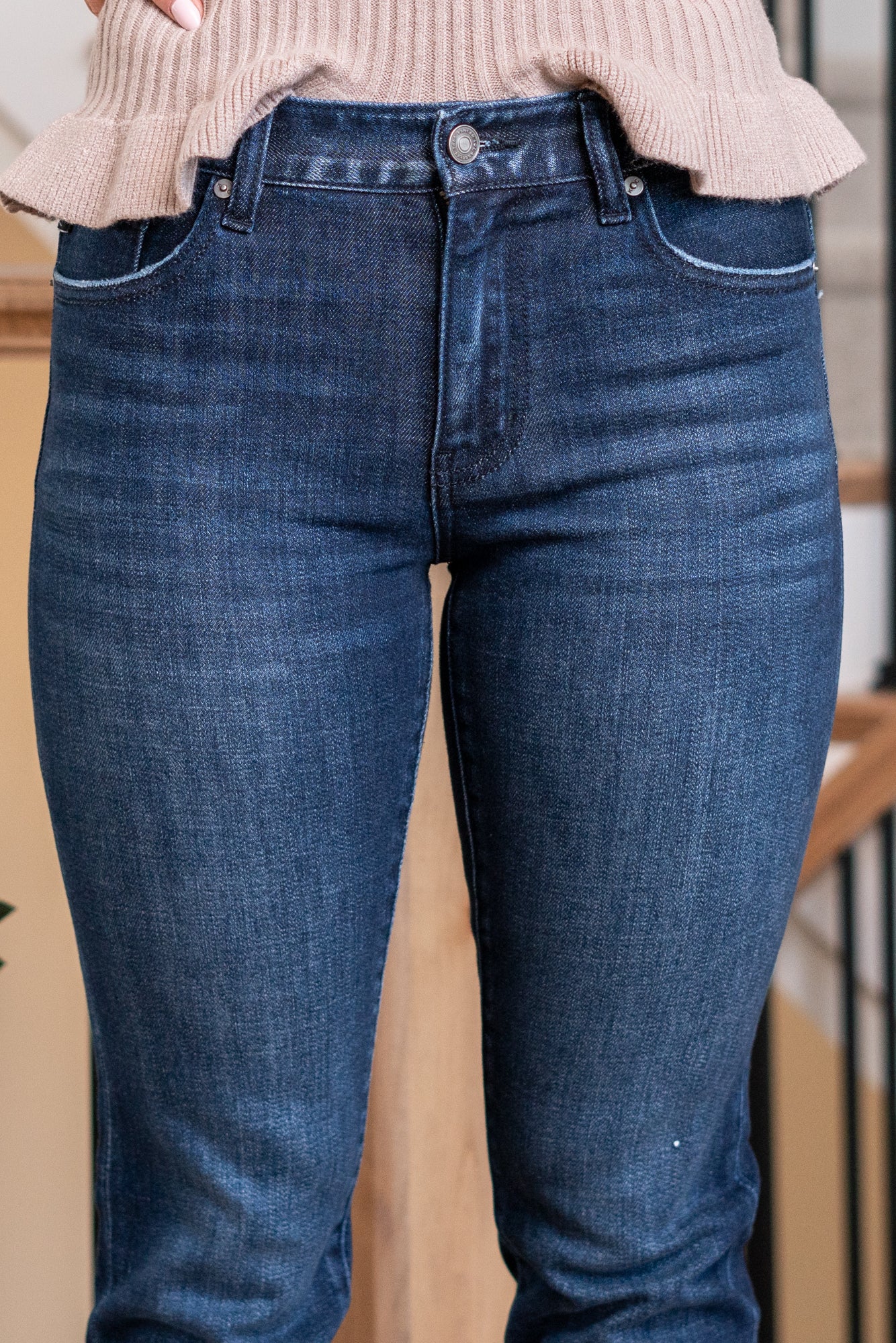 Plus Mid Rise Skinny Straight Jeans in a stylish dark stone wash. Crafted from stretch denim, these jeans offer both comfort and a flattering fit. They feature a straight leg and a single cuff with destruction for added style.