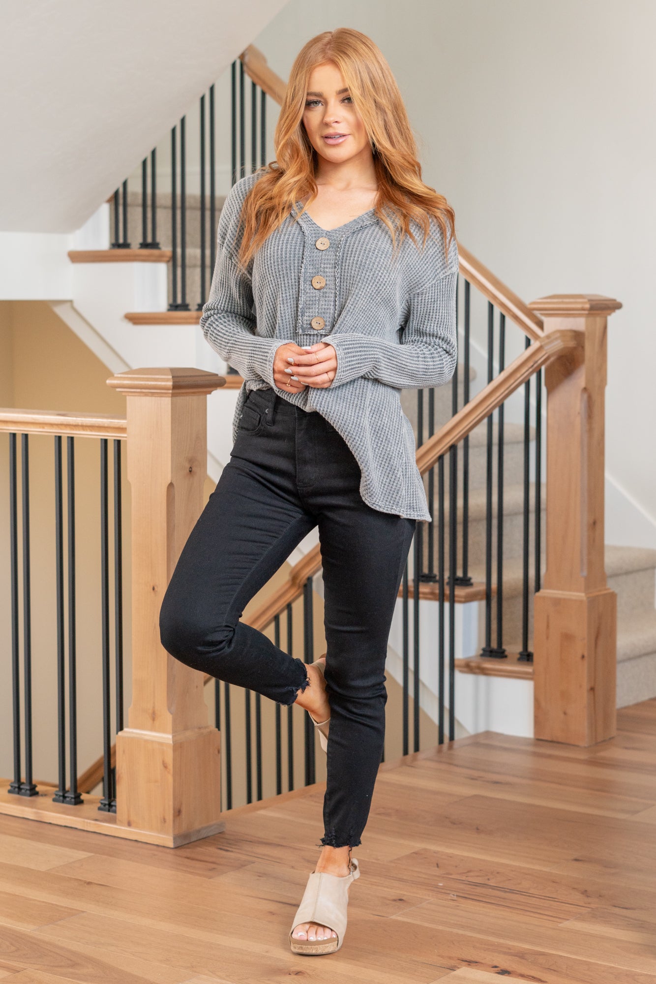 These black jeans are a wardrobe staple. They have a flattering high-rise waist and a super skinny fit that hugs your curves and elongates your legs. The stretchy fabric allows for maximum comfort and flexibility, while the regular hem hits at the perfect length. The classic five-pocket style gives you plenty of space to carry your essentials, and the open seam adds a trendy touch. These jeans will be your go-to for any casual or dressy occasion.