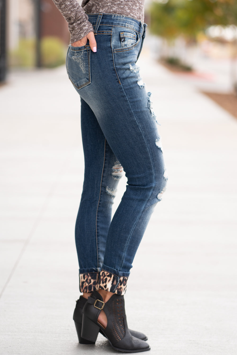 KanCan Mason Mid Rise Leopard Patch Skinny Jeans Dark Blue Wash