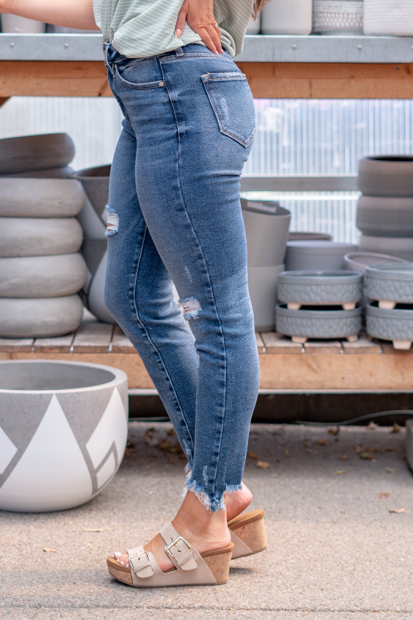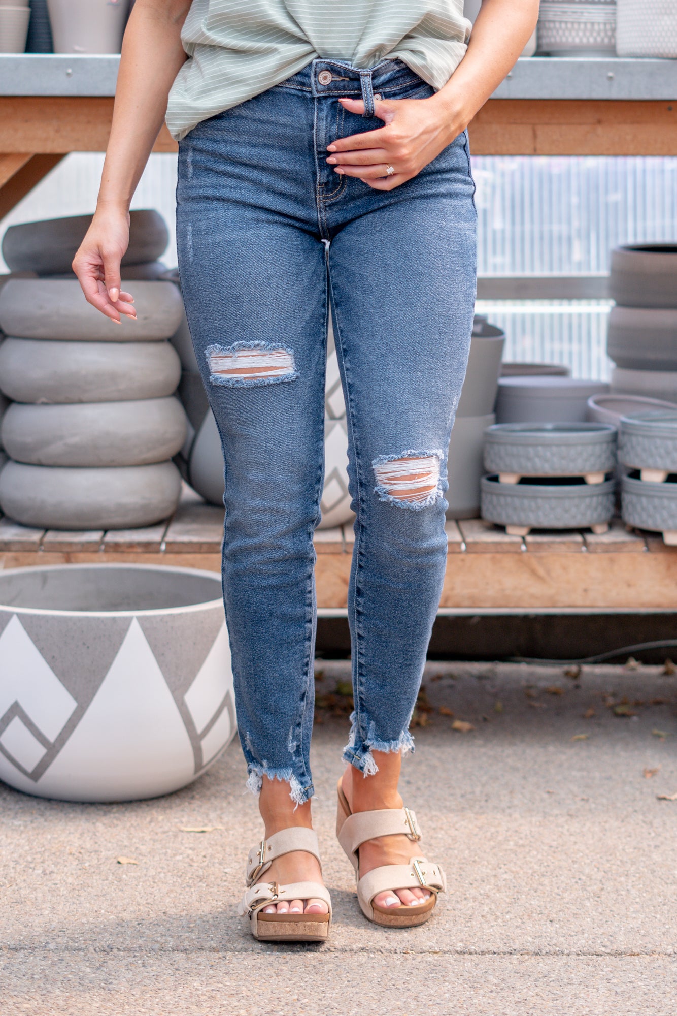 These high-rise ankle skinny jeans are a versatile addition to any wardrobe. The stonewash creates a sophisticated, timeless look, while the distressed details give them a touch of edgy style. With a stretchy fabric that moves with you, these jeans are both comfortable and flattering. Whether dressed up or down, these jeans are sure to become a go-to favorite.
