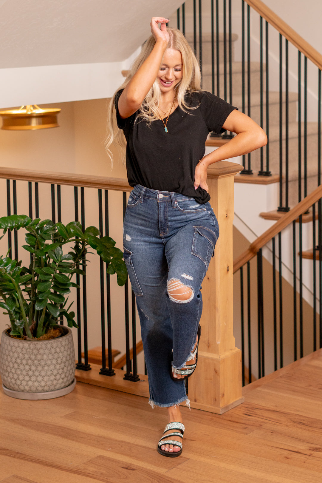Sunny Sky Folded Front Hem Mid Rise Straight