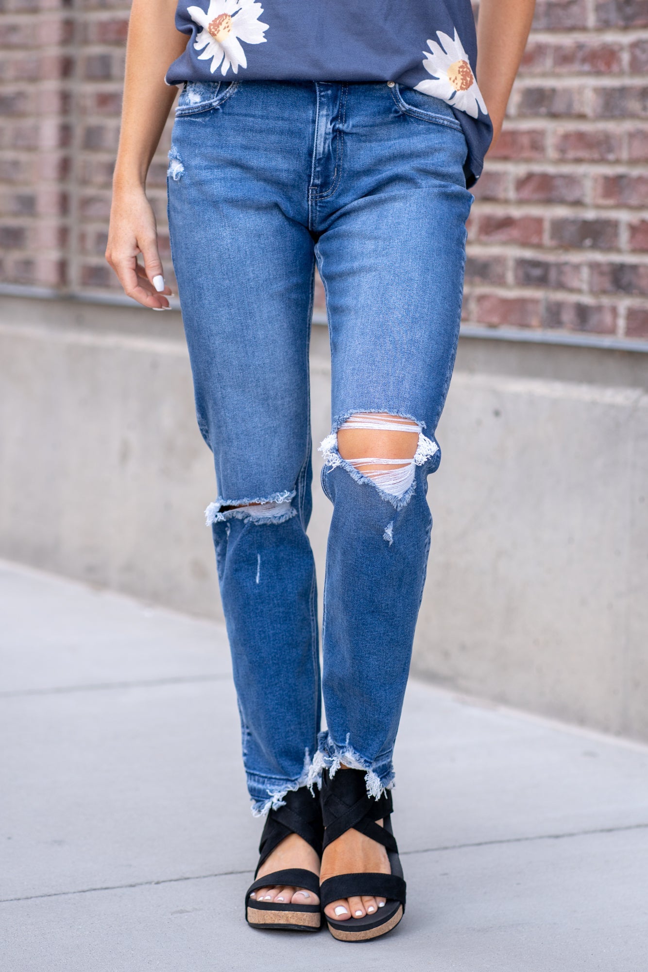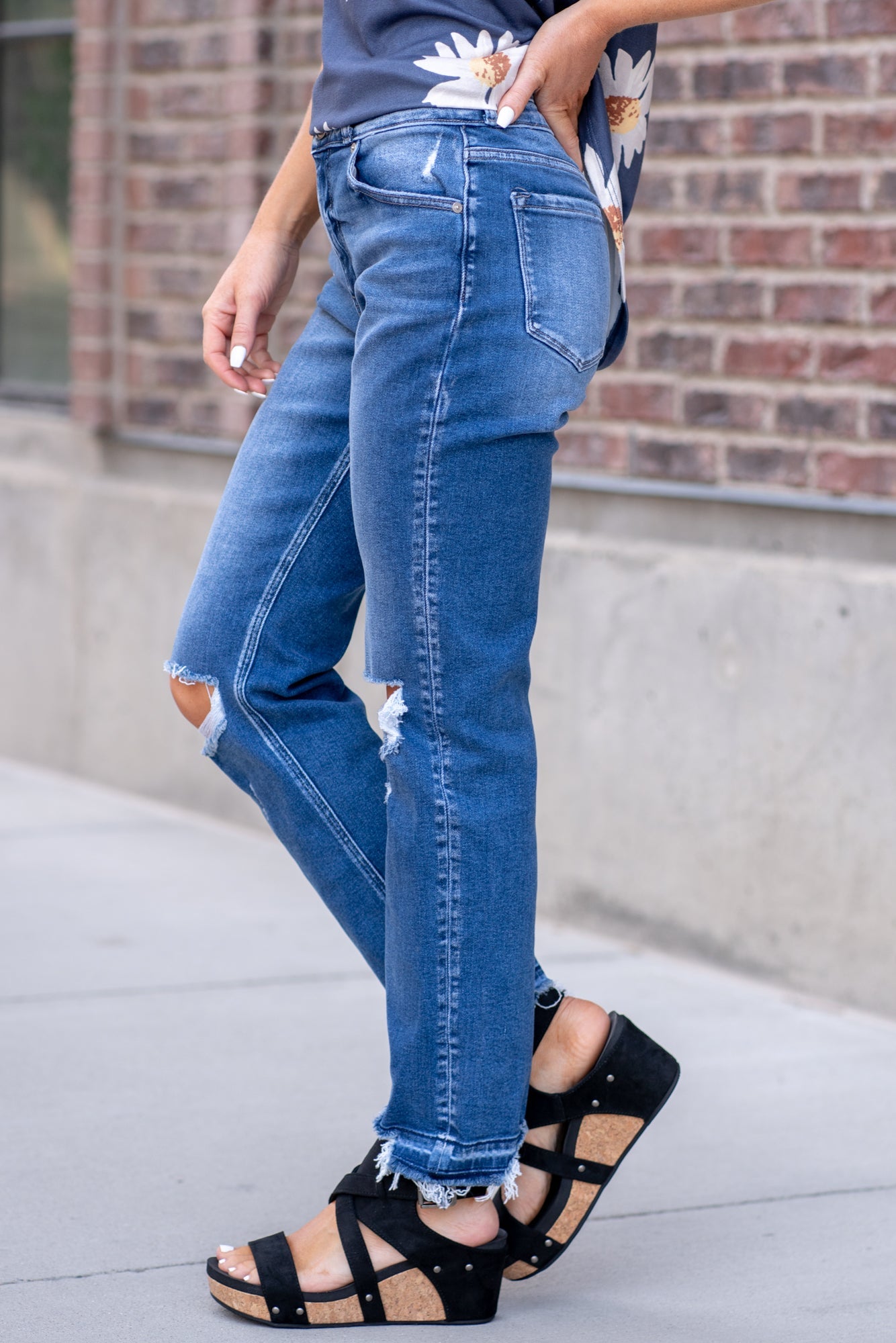 These high rise slim straight jeans in a medium stone wash exude effortless style and versatility. The stretch fabric ensures a comfortable and flexible fit, while the double waistband adds a unique and trendy touch. With a released hem featuring distressed details, these jeans perfectly blend modern aesthetics with a hint of vintage charm. Dress them up with heels and a blazer for a chic evening look or pair them with sneakers and a casual top for a relaxed yet fashionable outfit.