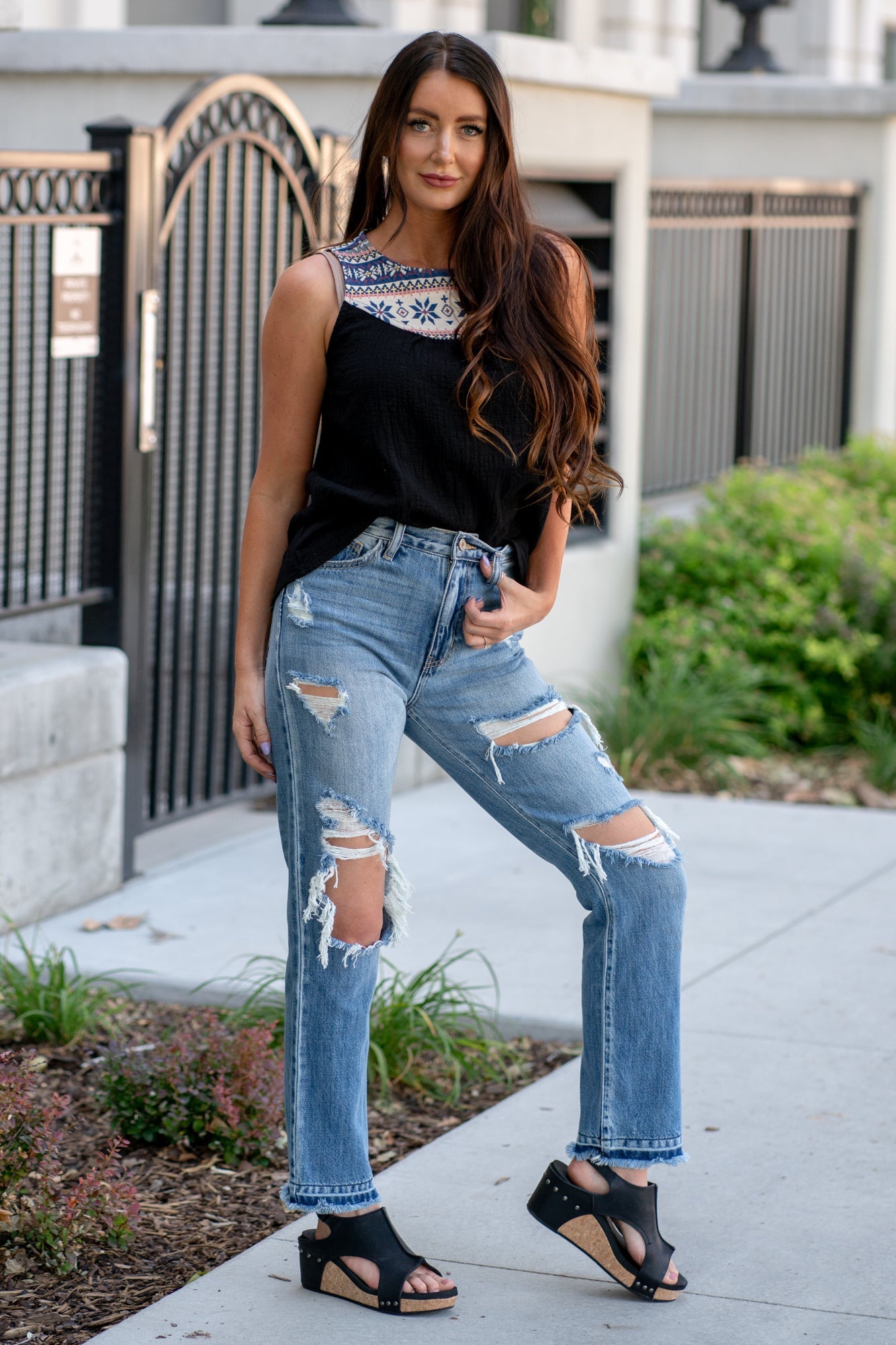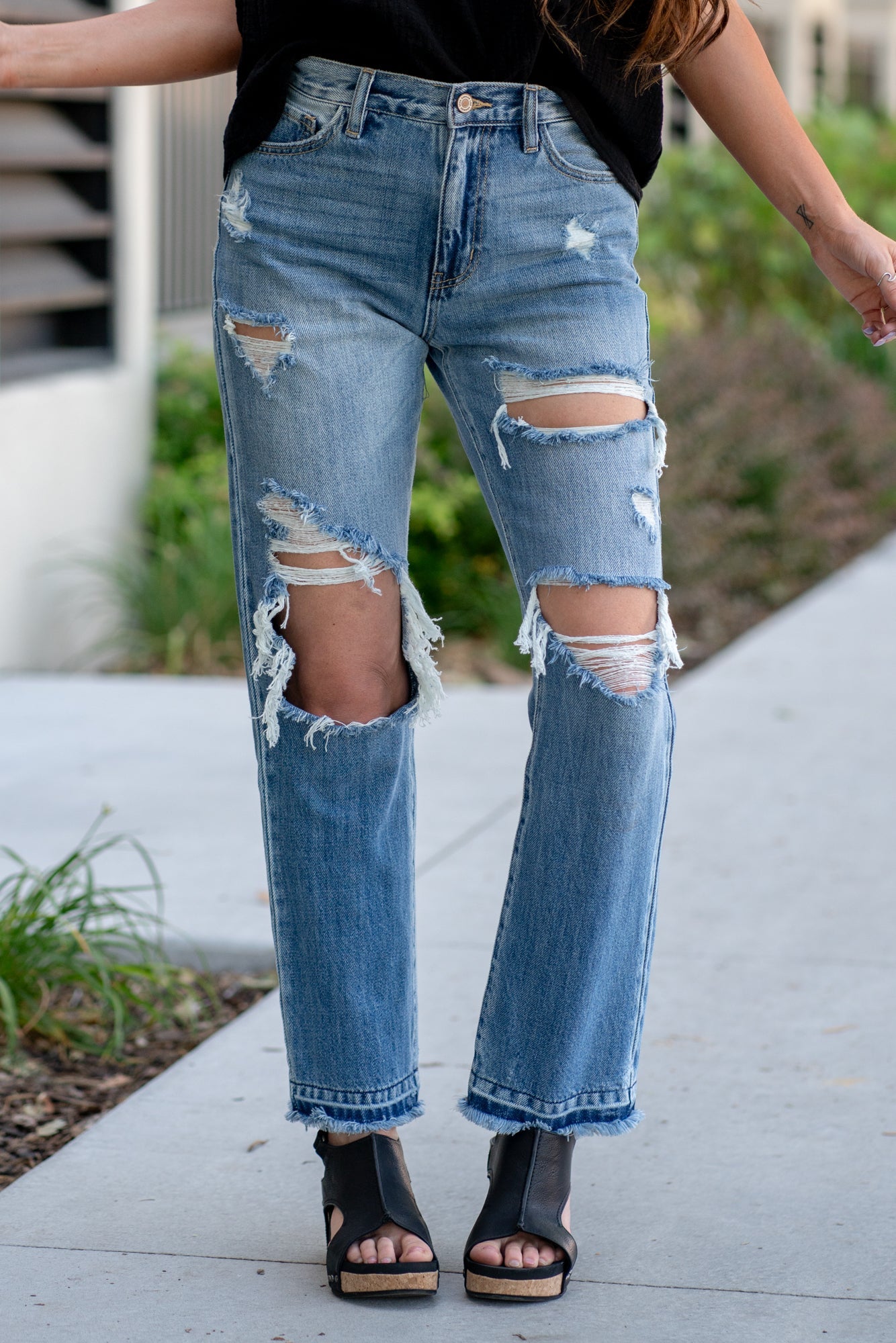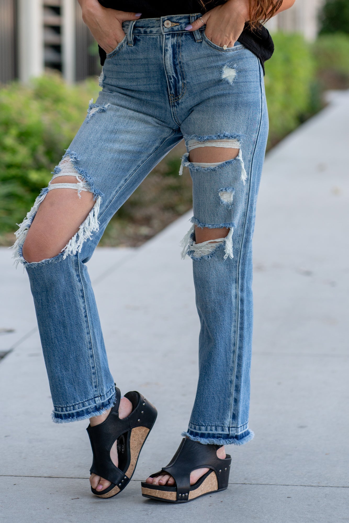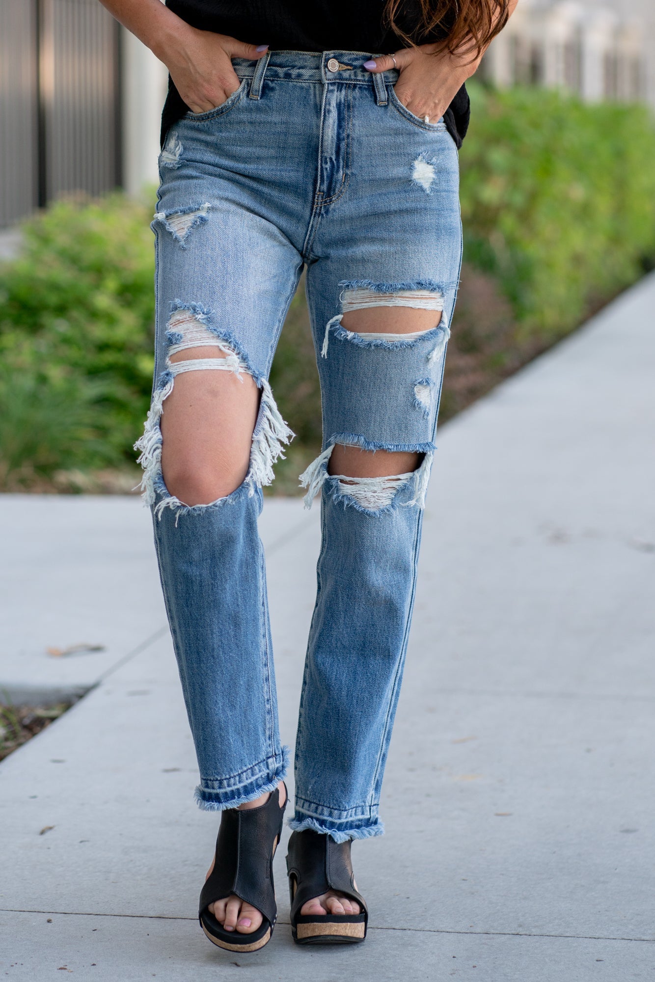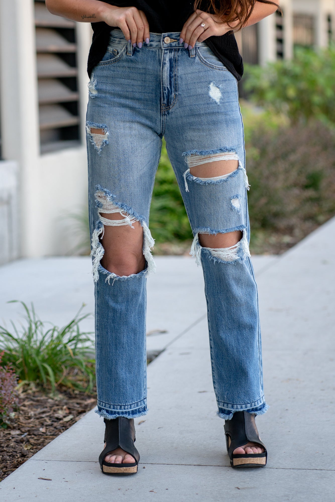 The High Rise Straight jeans boast a classic silhouette with a comfortable 11" rise and 30" inseam (size 3). Made from 100% cotton, these jeans offer a rigid feel with Stretchiness Level #1. The distressed detailing adds a trendy and worn-in look, making them a timeless addition to your wardrobe that effortlessly combines style and comfort.
