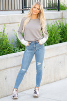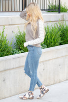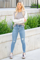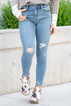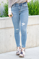 These high-rise ankle skinny jeans with distressing provide a stylish and edgy addition to your wardrobe. With a high waist and an ankle-length cut, they offer a flattering and on-trend look. The distressed details add a touch of rugged charm, making them a versatile choice for both casual and more daring outfits.