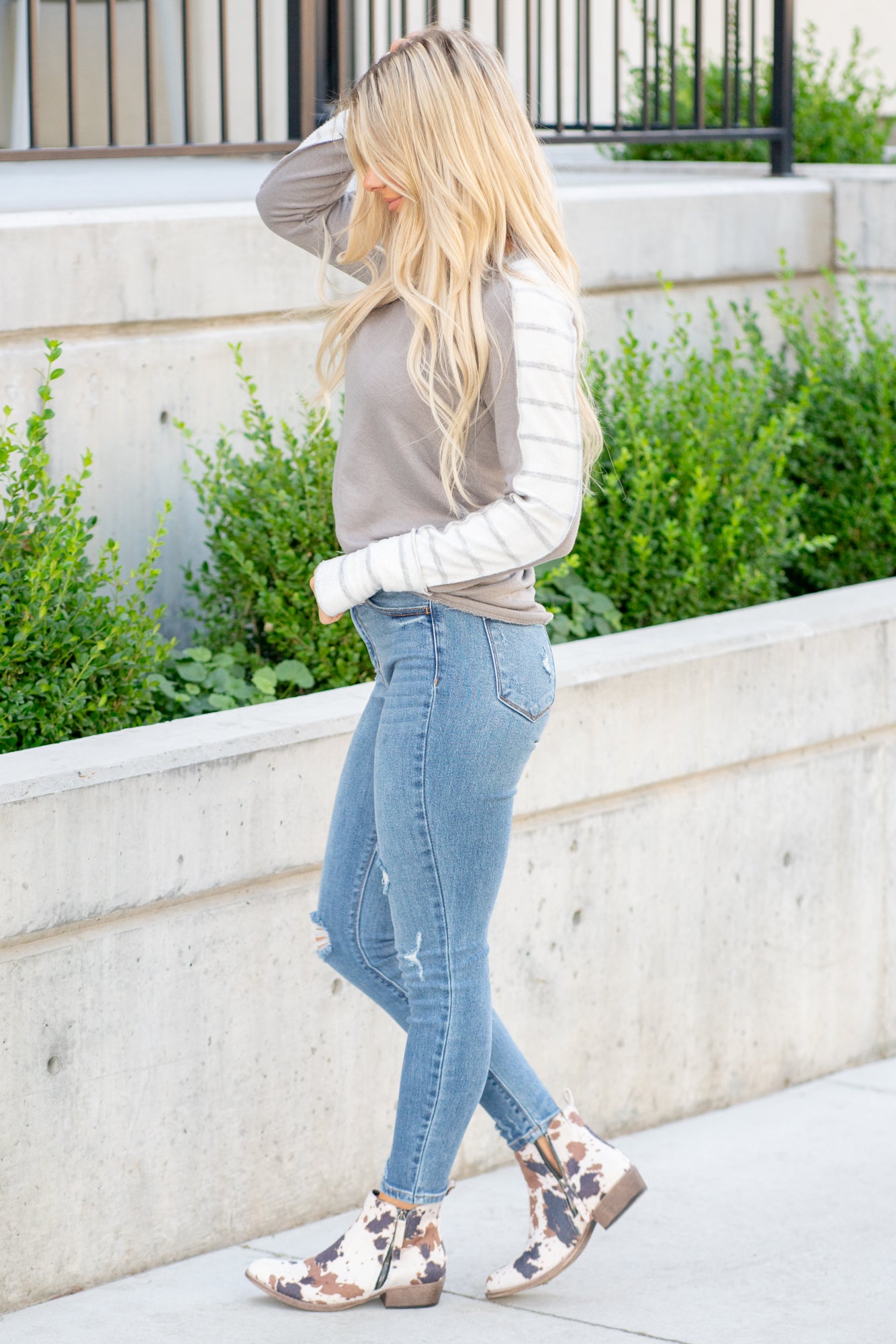Cas is 5'7" and wears a size 25 in jeans, a small in tops, and 8 in shoes. She is wearing size 3 in these jeans.