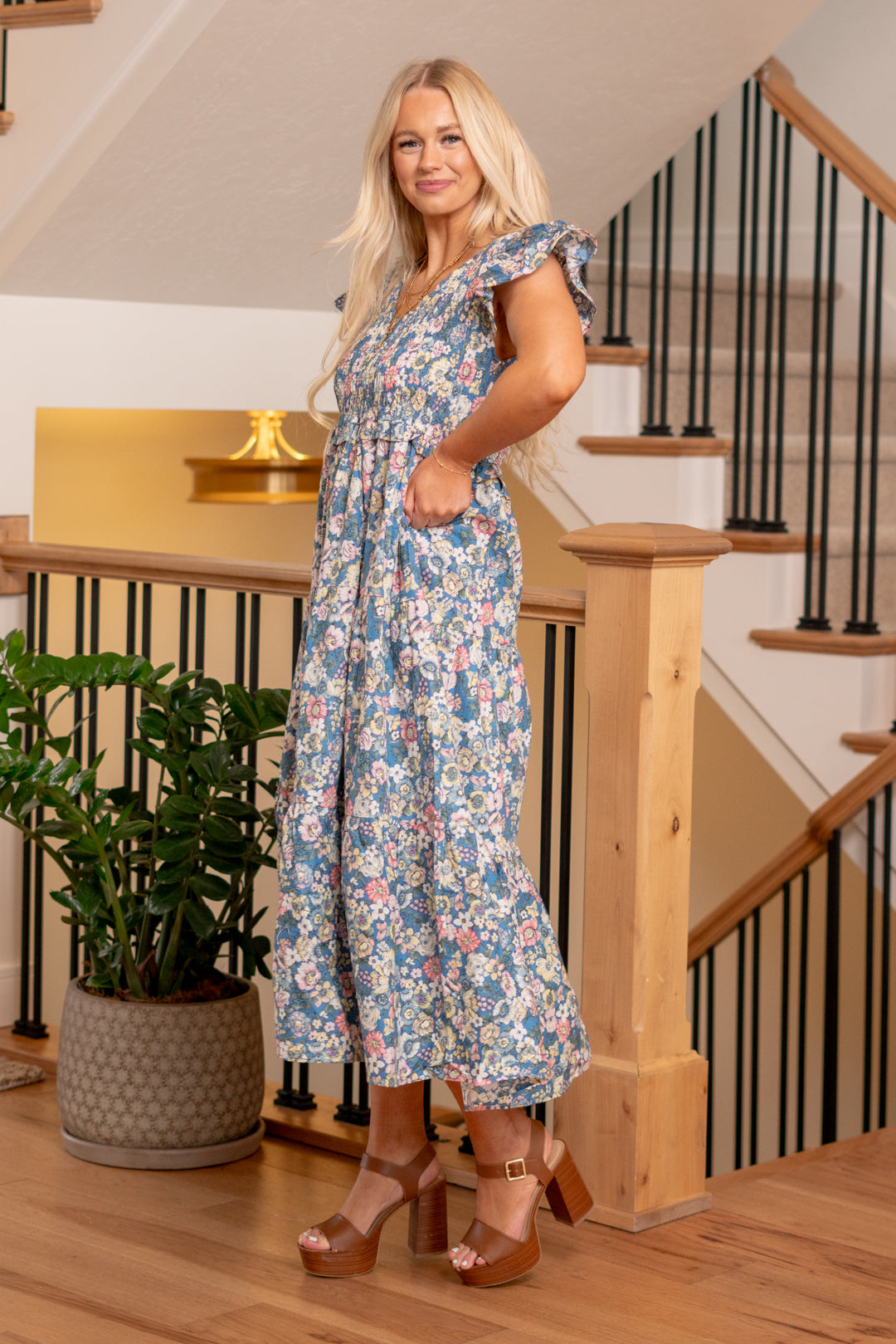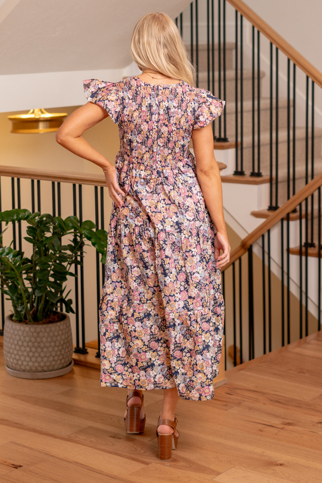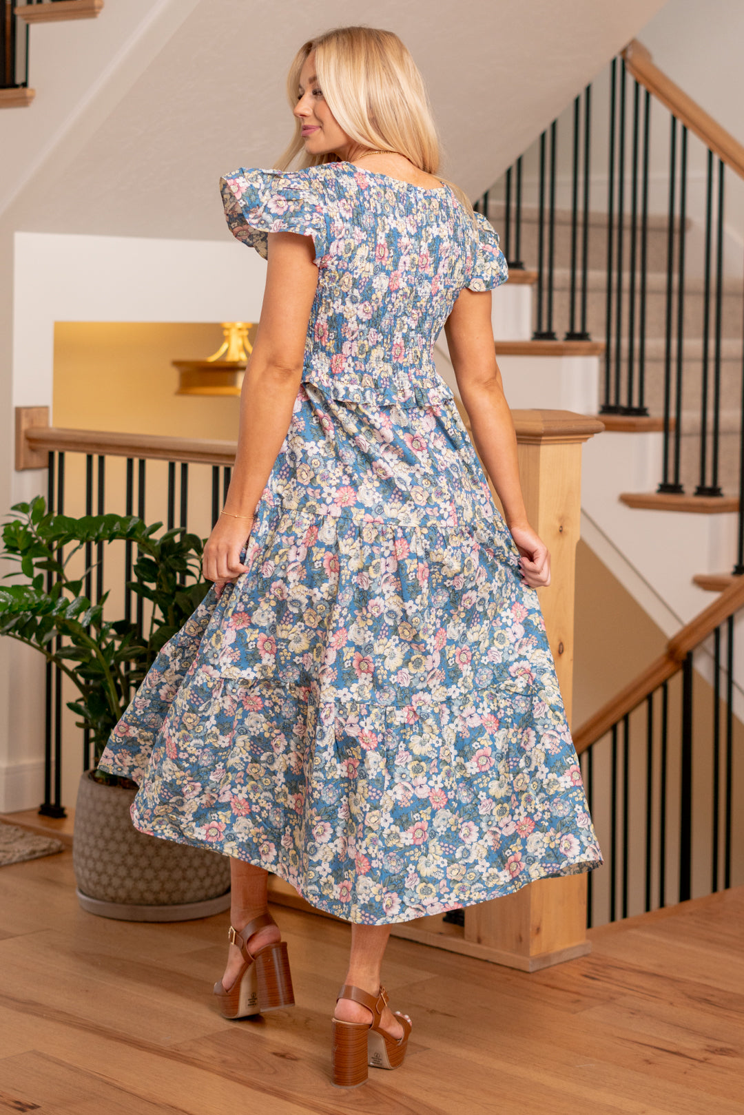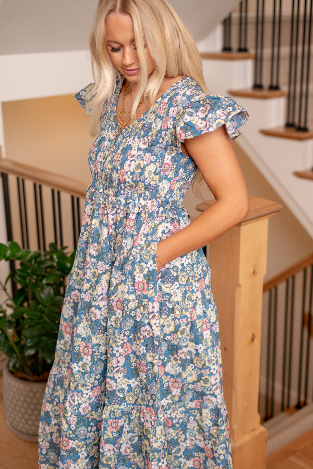 Vintage Garden Floral Flutter Smocking Midi Dress