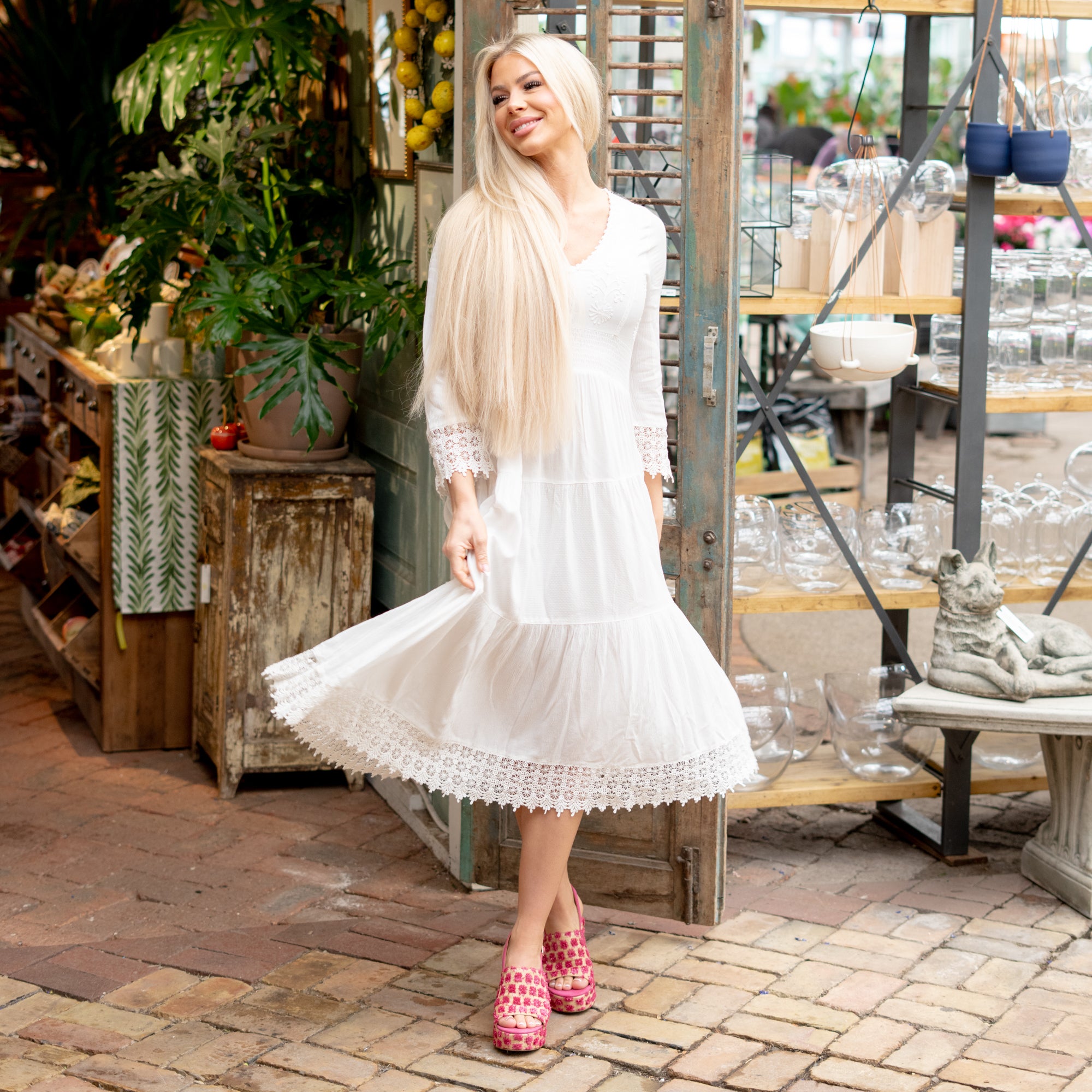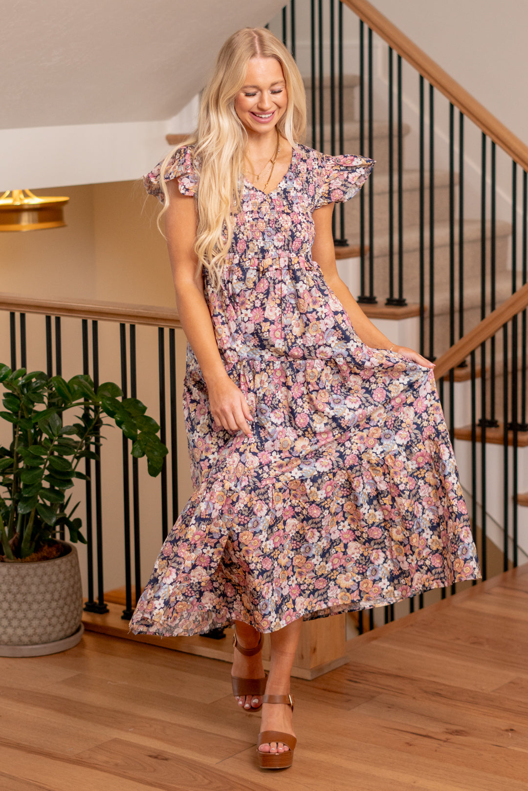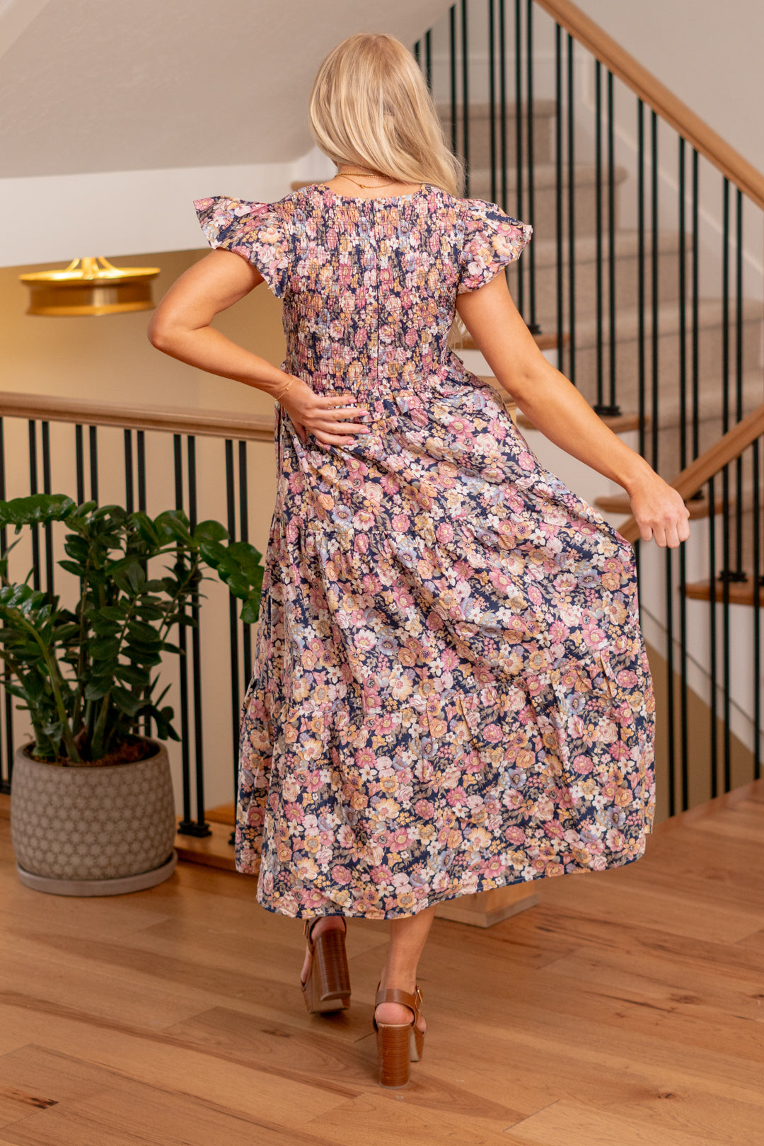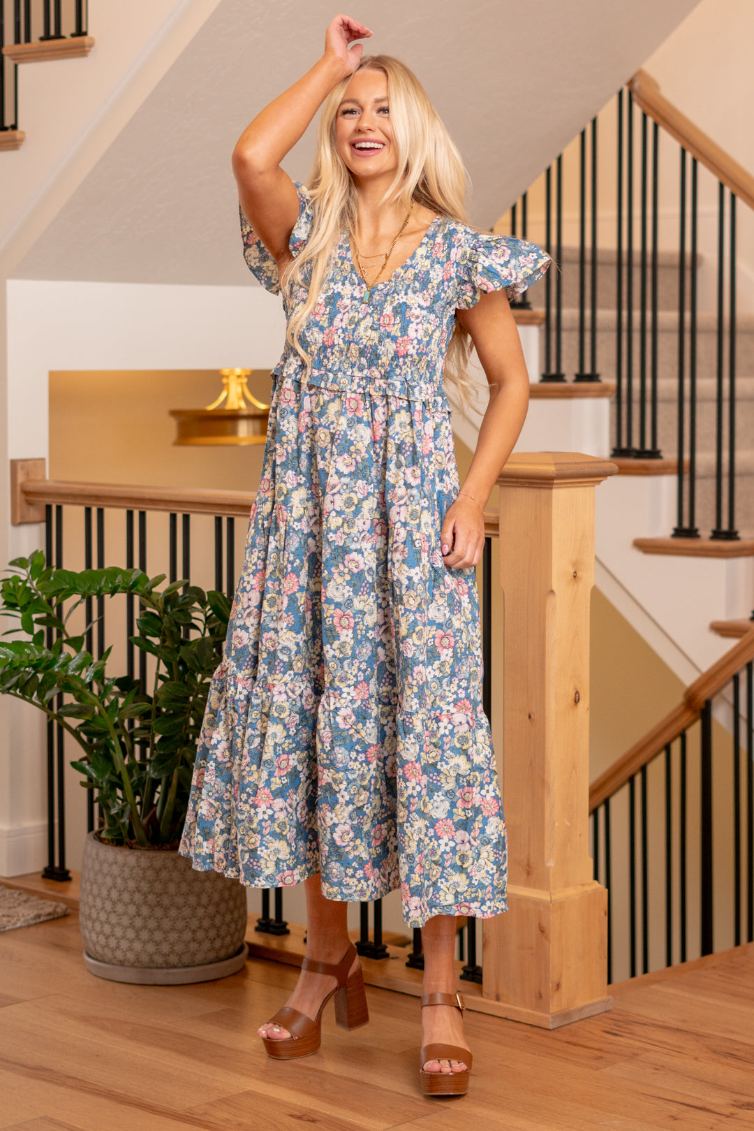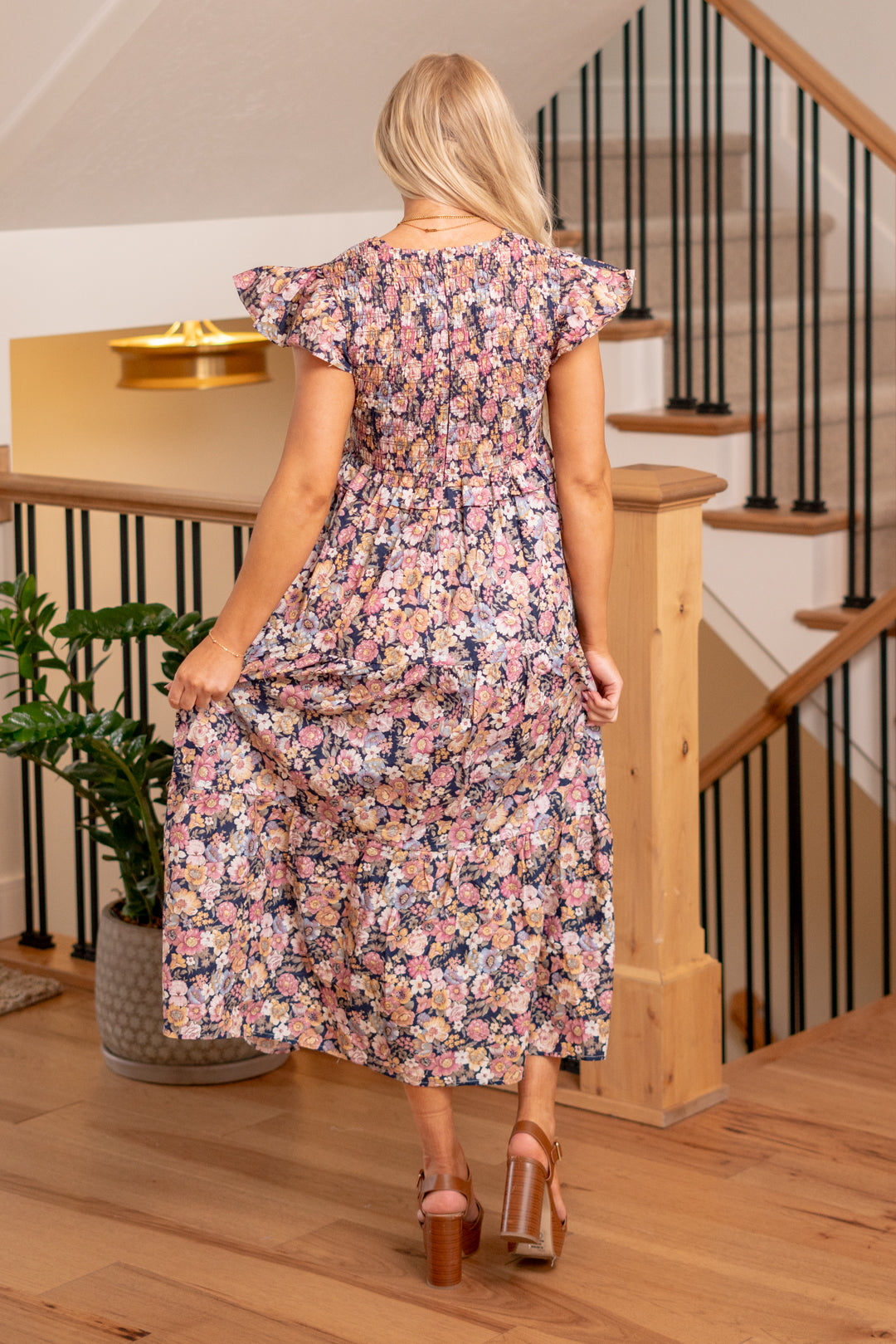 Vintage Garden Floral Flutter Smocking Midi Dress