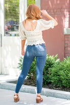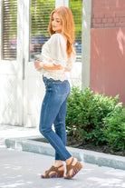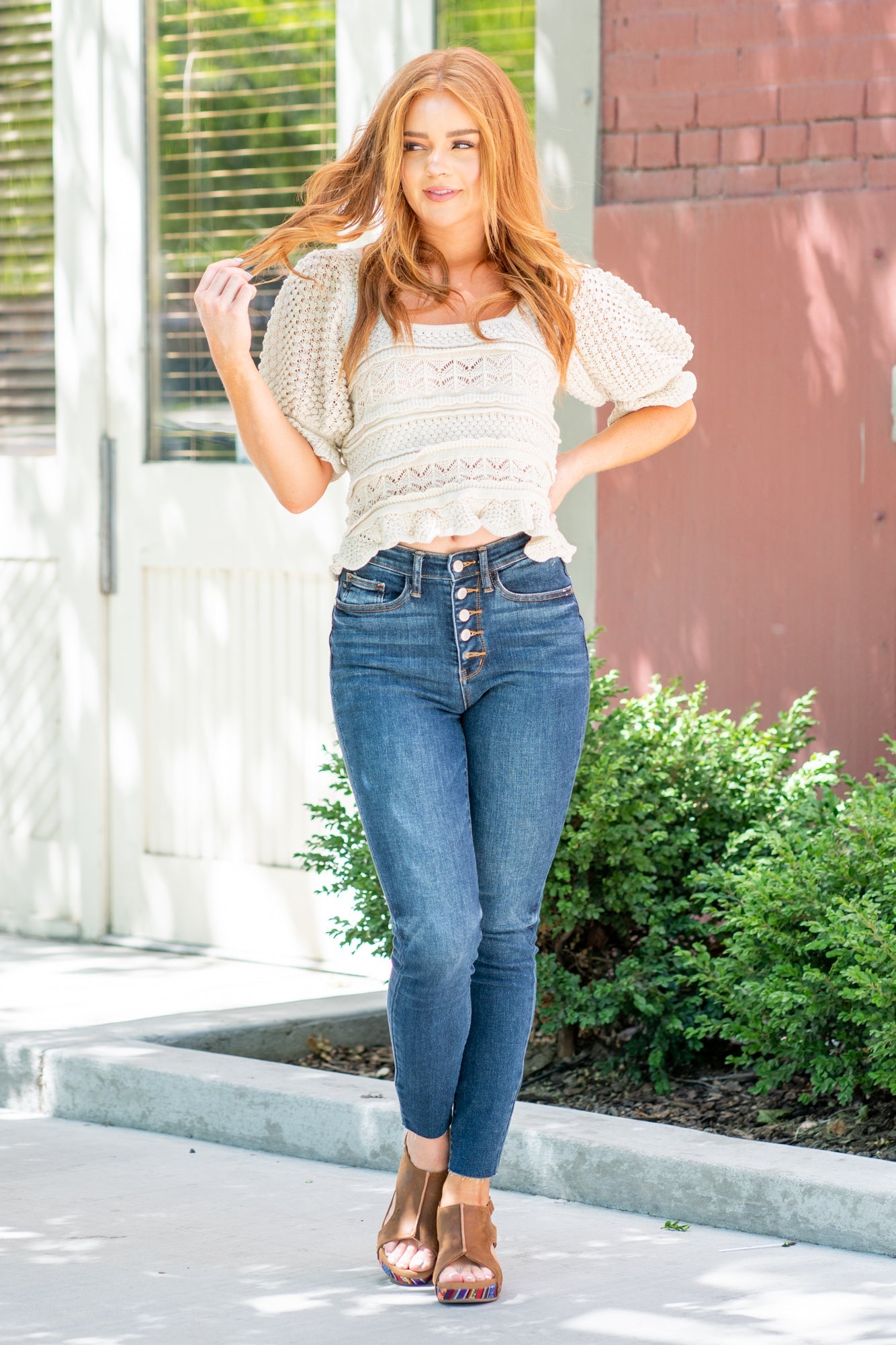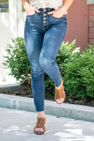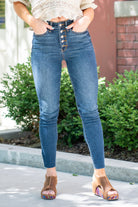 Don't be afraid to wear high-waisted jeans, especially with this dark wash denim. With a button fly and distressed legs, these will be your favorite pair to dress up!