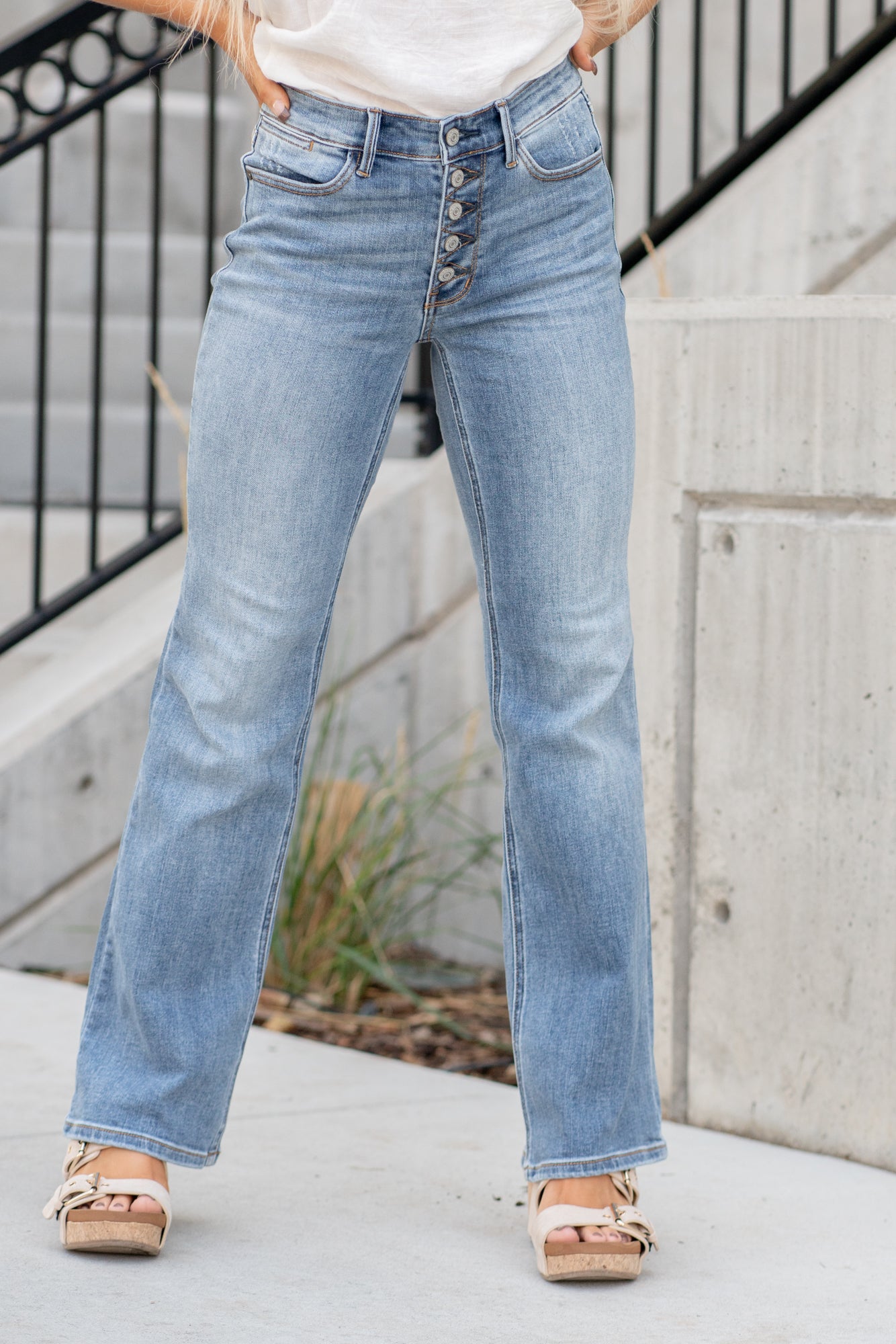 These mid-rise jeans showcase a trendy bootcut silhouette with a stylish button fly. The mid-rise waistline offers a comfortable fit and a flattering shape. With their versatile design, these jeans can be dressed up or down for various occasions.