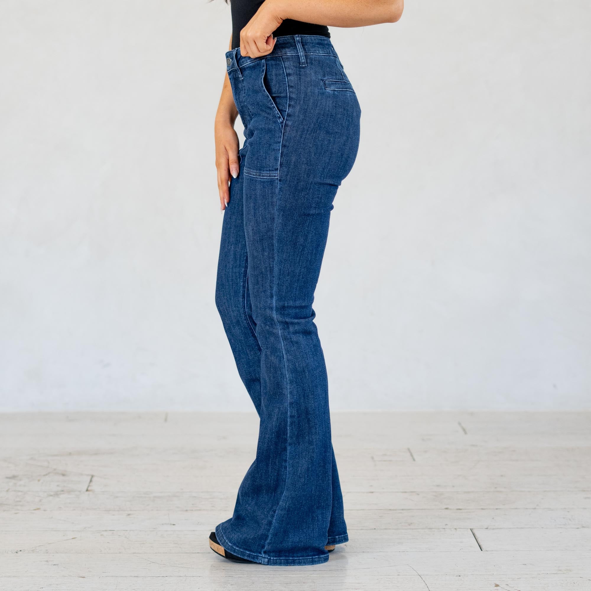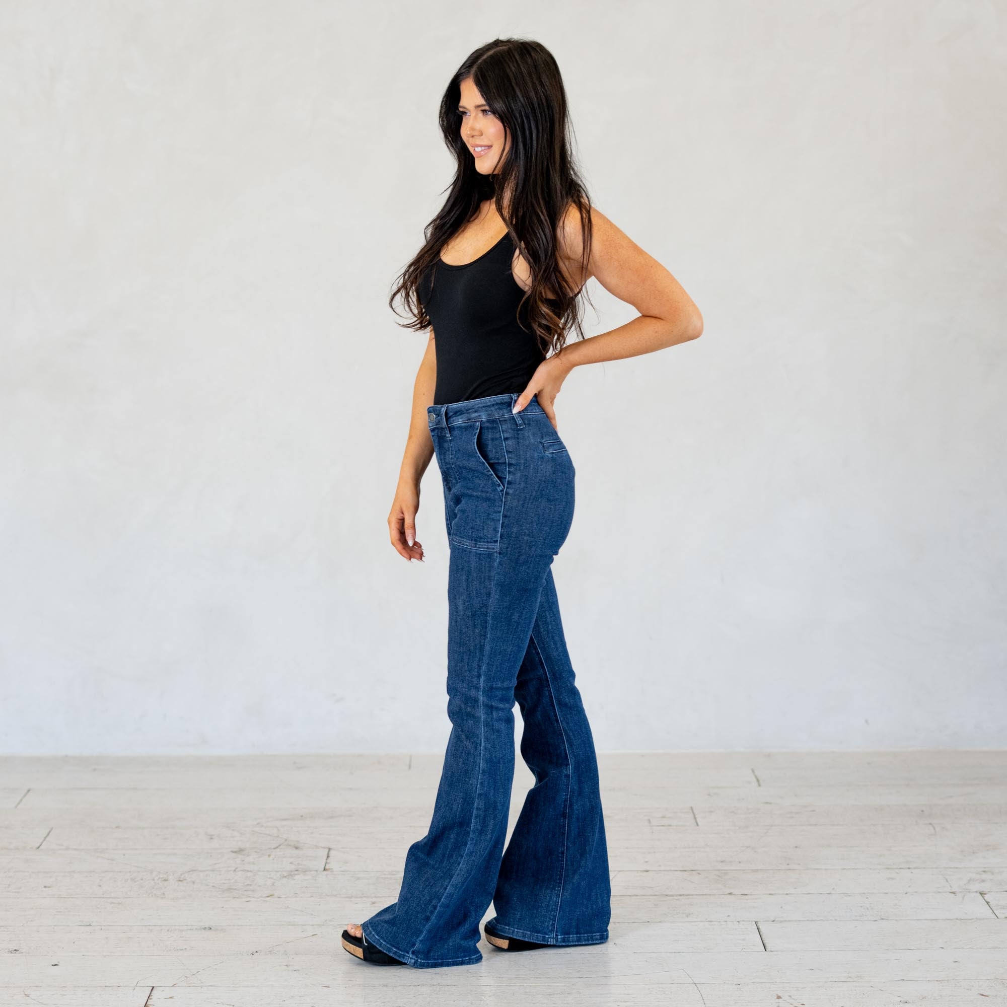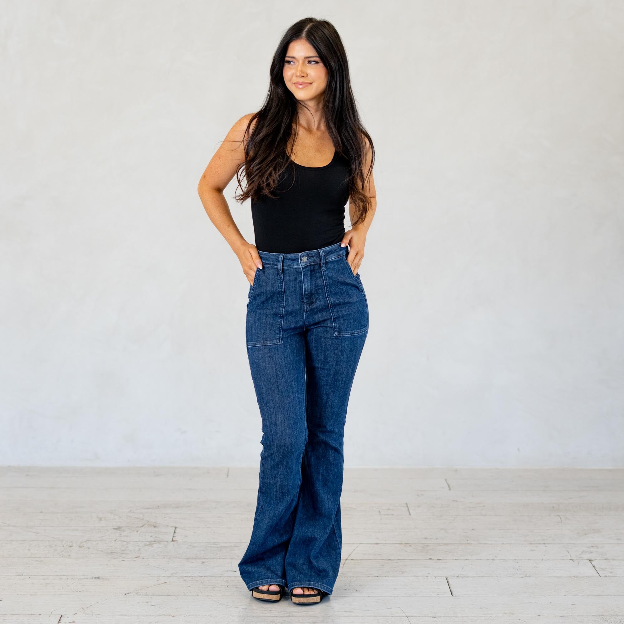 Judy Blue Celeste High Rise Patch Pocket Flare Dark Blue Wash