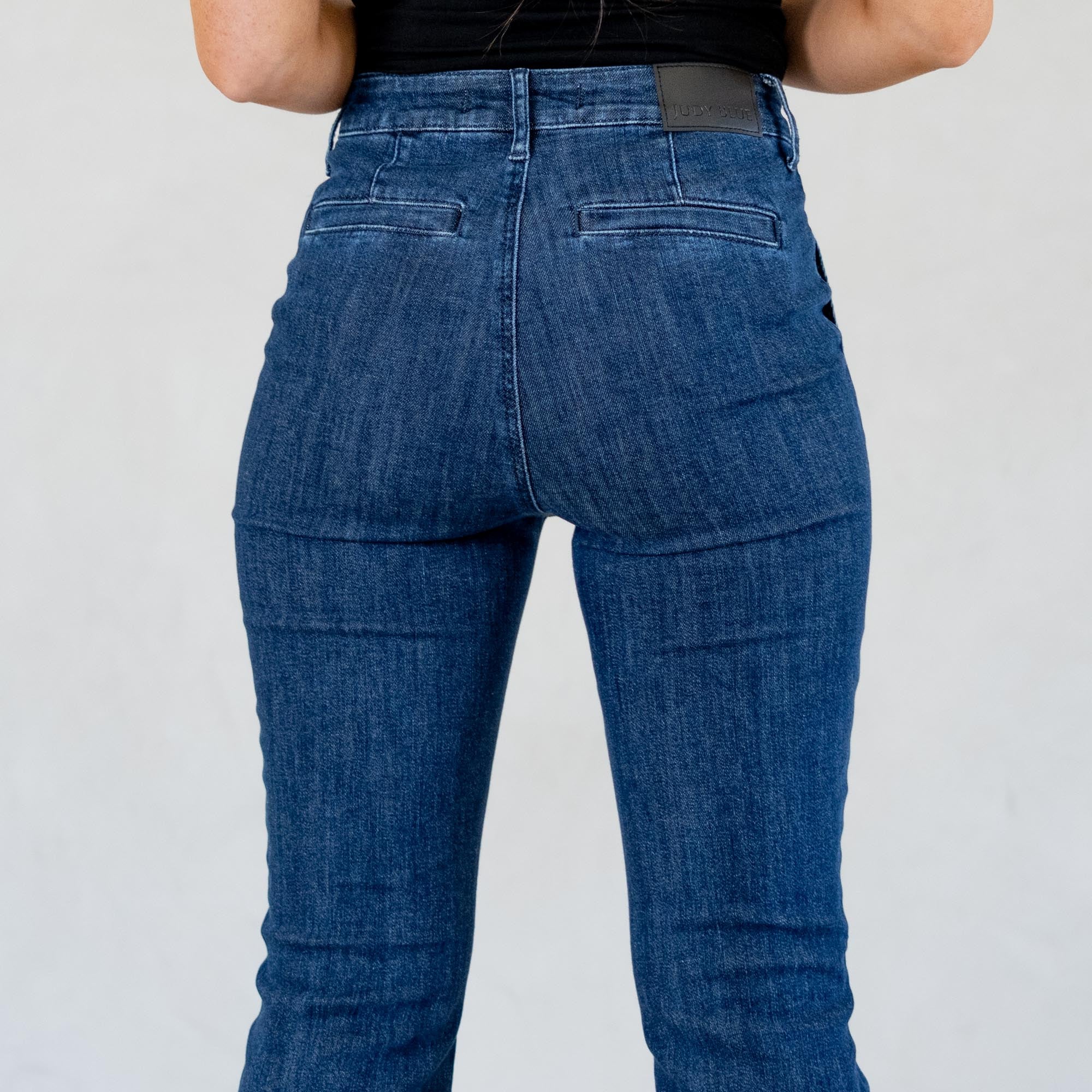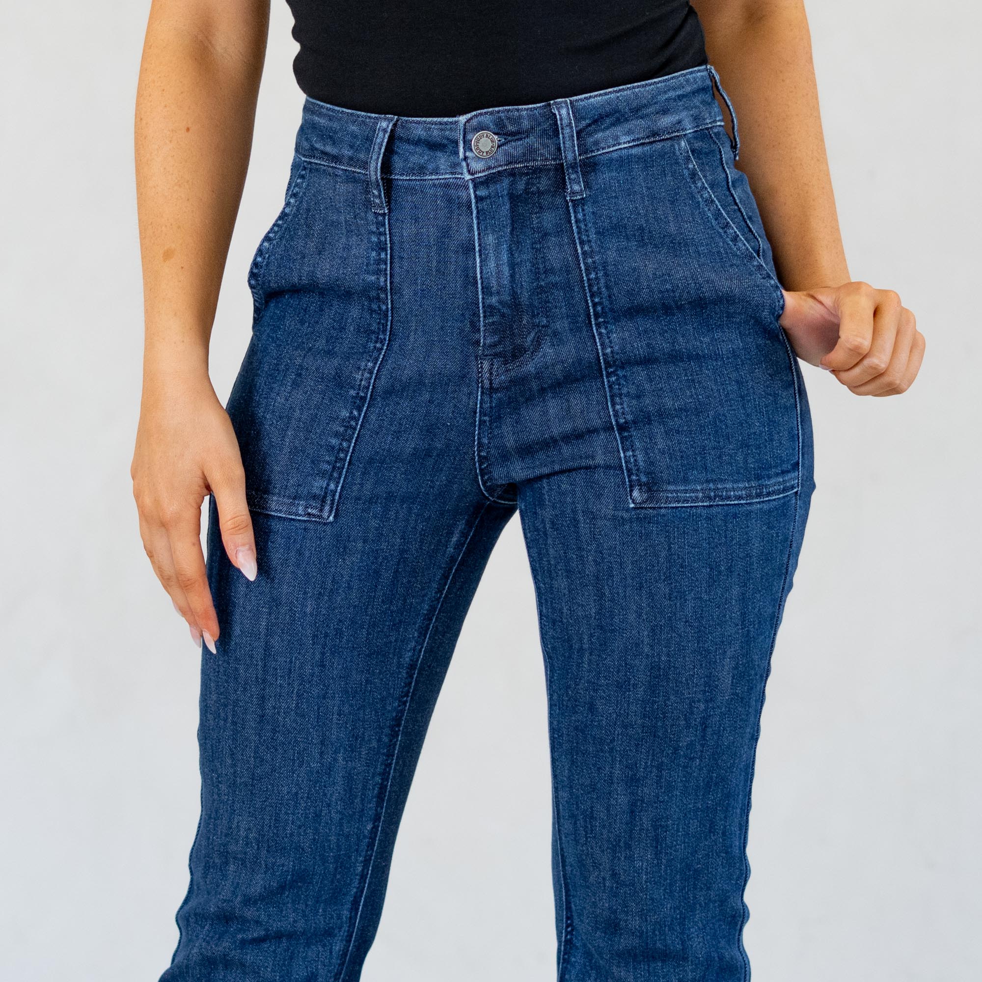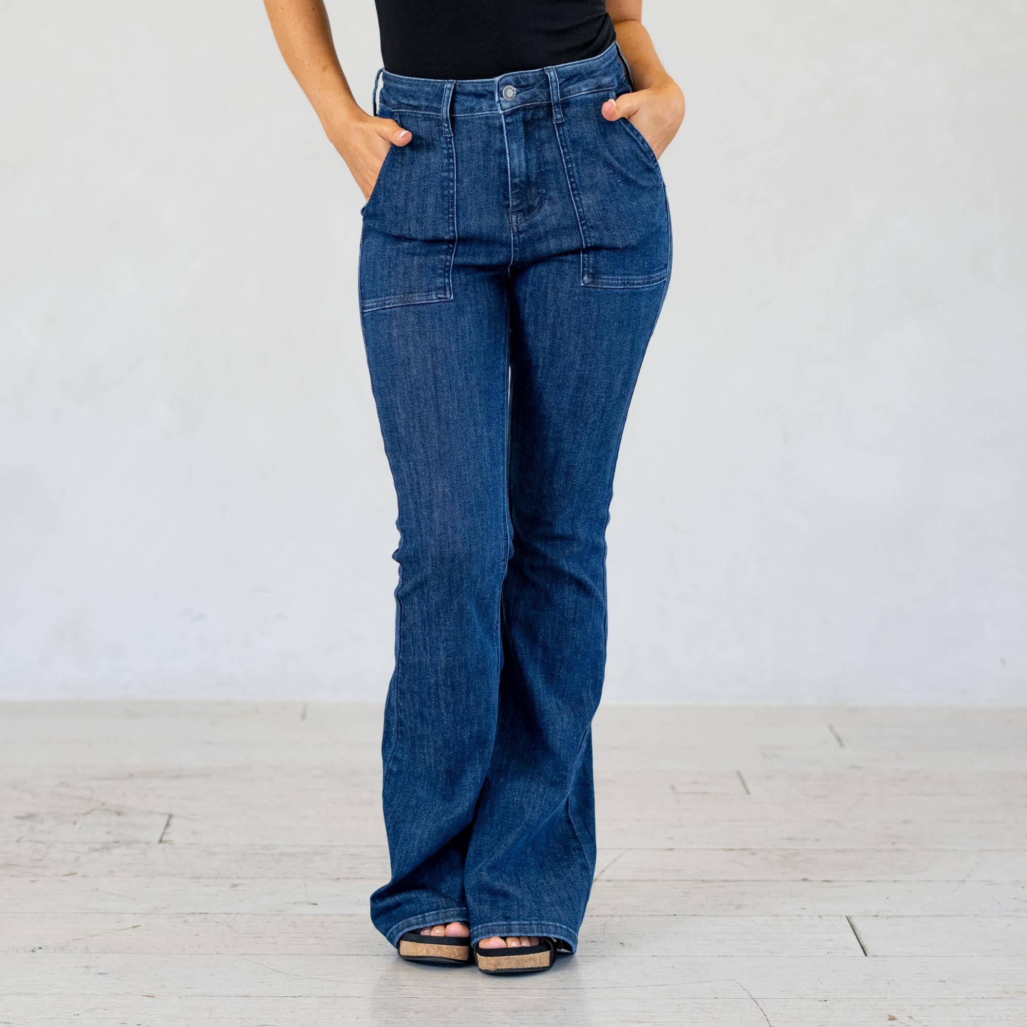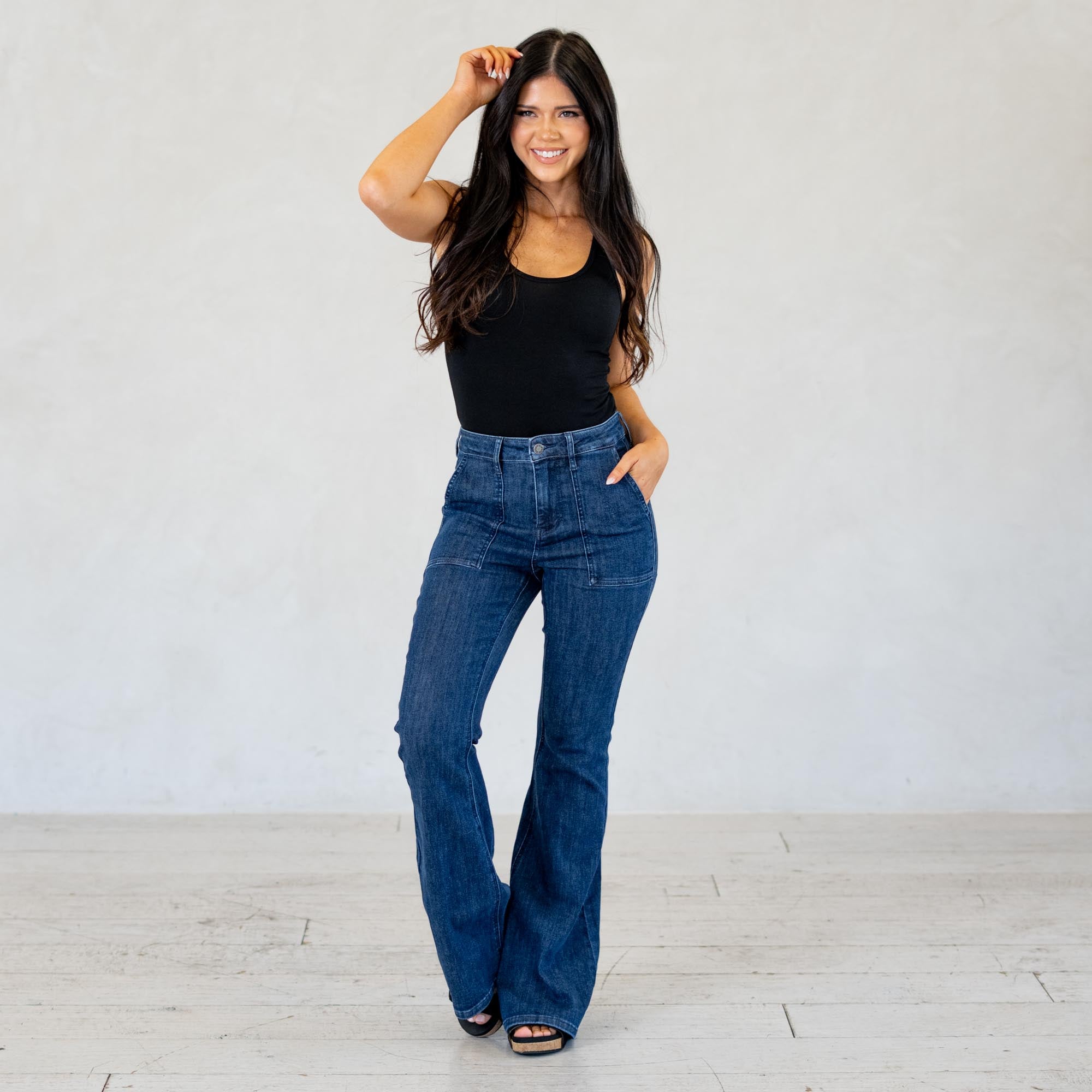 Judy Blue Celeste High Rise Patch Pocket Flare Dark Blue Wash