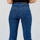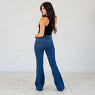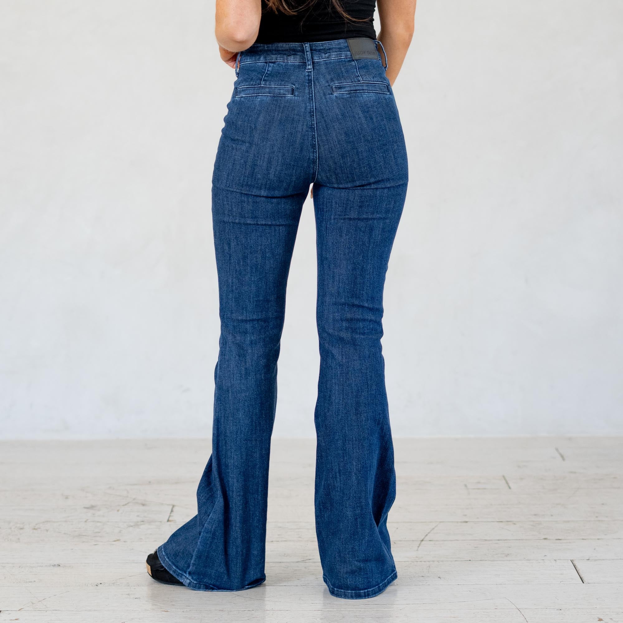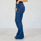 Add a retro-inspired touch to your denim rotation with our Celeste High Waist Flare Jeans. Crafted in a rich dark blue wash, these jeans feature a sleek high-waisted fit that elongates the legs and accentuates your shape.