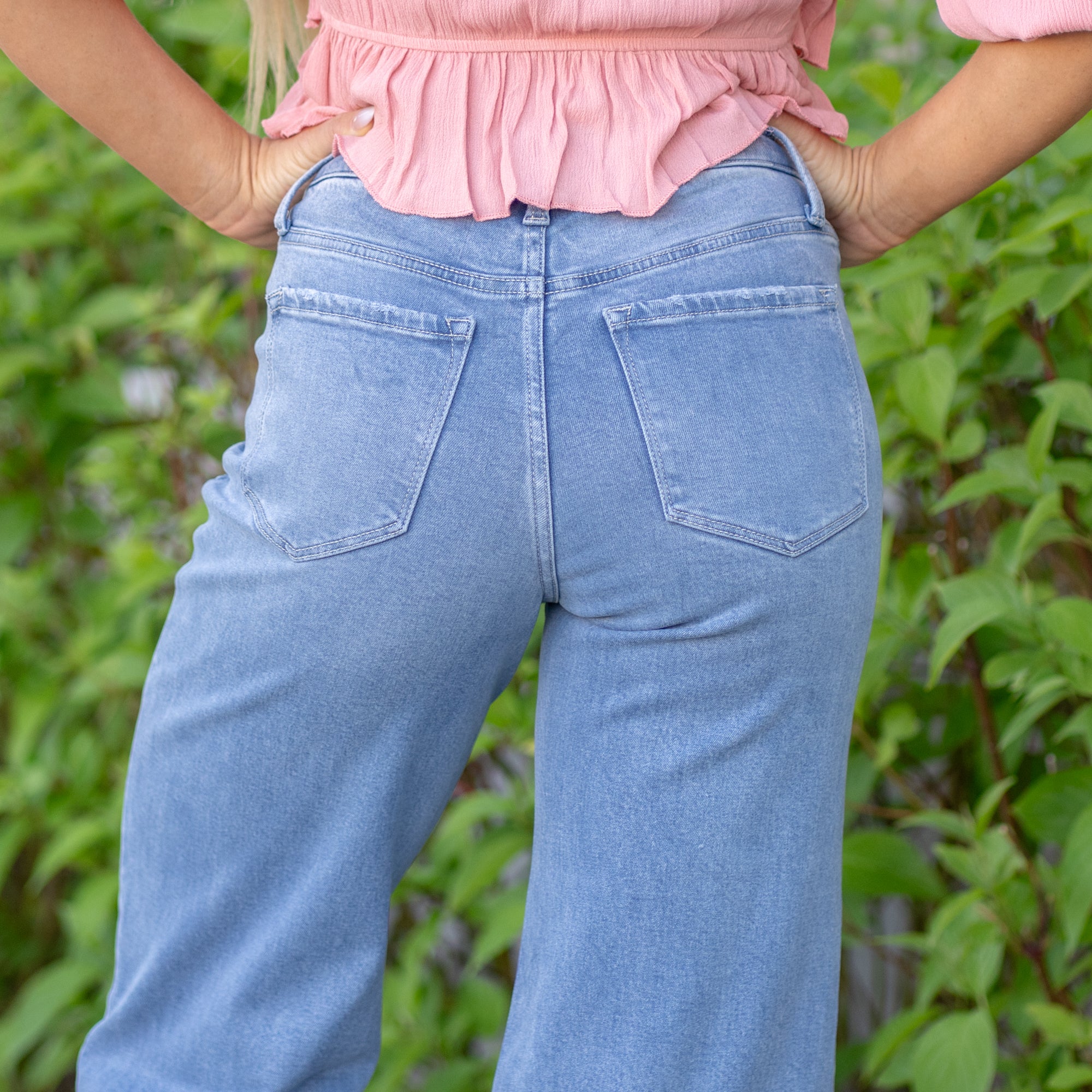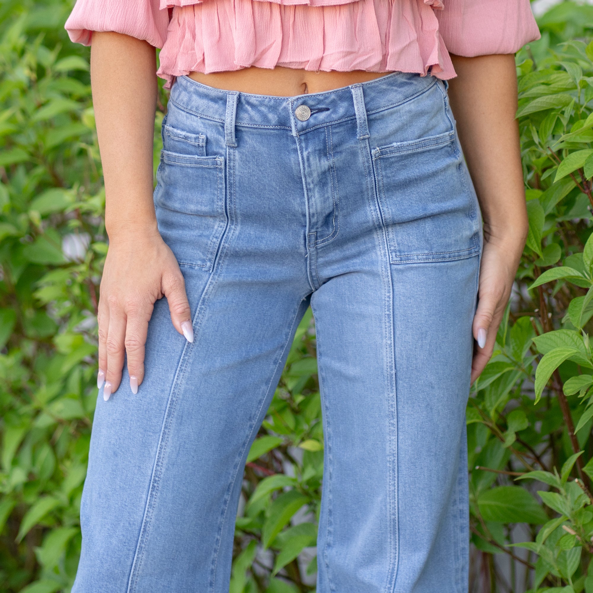 These High Rise Full Length Extreme Wide Leg Jeans make a serious style statement. Designed with a flattering high rise waist and dramatic wide leg fit, they’re crafted from comfort stretch denim that moves with you while keeping its shape. Seam detailing adds a polished touch, while the finished hem keeps the look clean and elevated. Perfect for pairing with fitted tops or cropped layers for that head-turning balance.