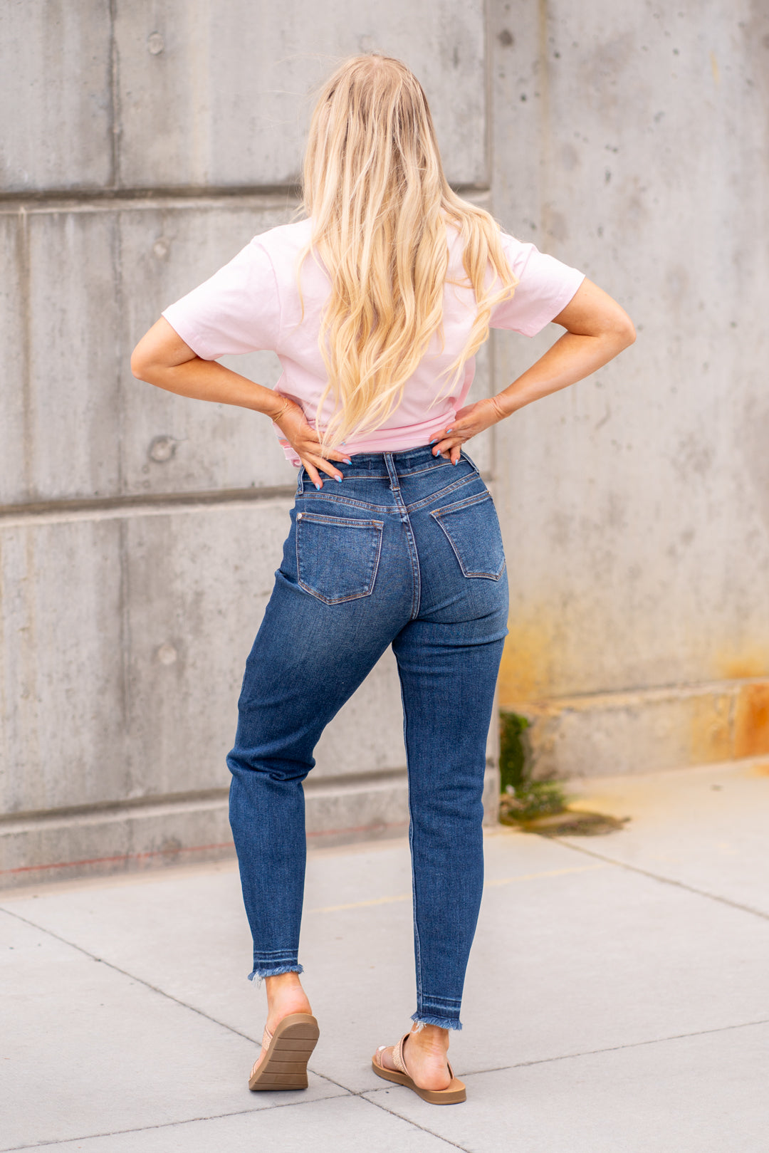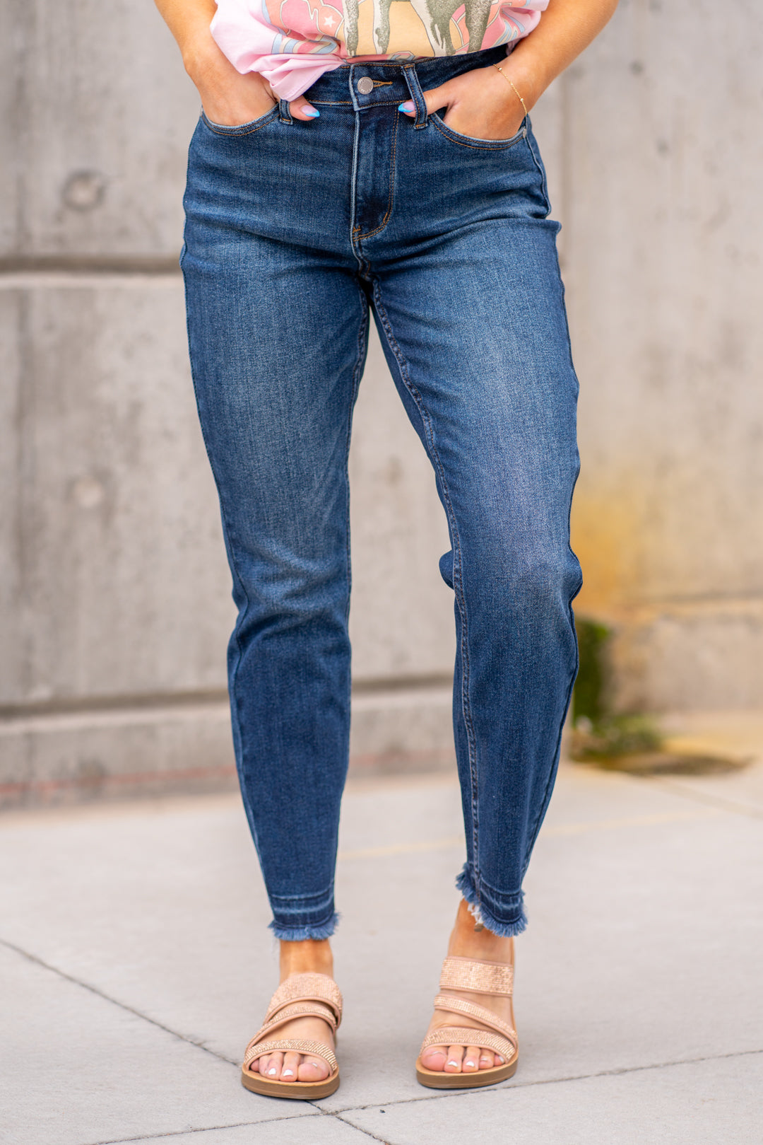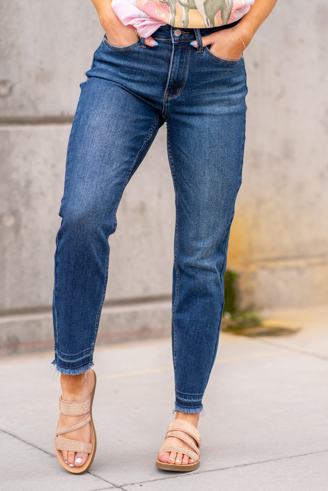 Step up your fashion game with these High Waist Released Hem Slim Fit jeans in a deep, dark blue wash. These jeans offer both style and flexibility with their 4-way stretch fabric. The high waist adds a touch of sophistication, while the released hem brings a trendy flair to your outfit. Perfect for effortlessly making a chic fashion statement while enjoying maximum comfort.