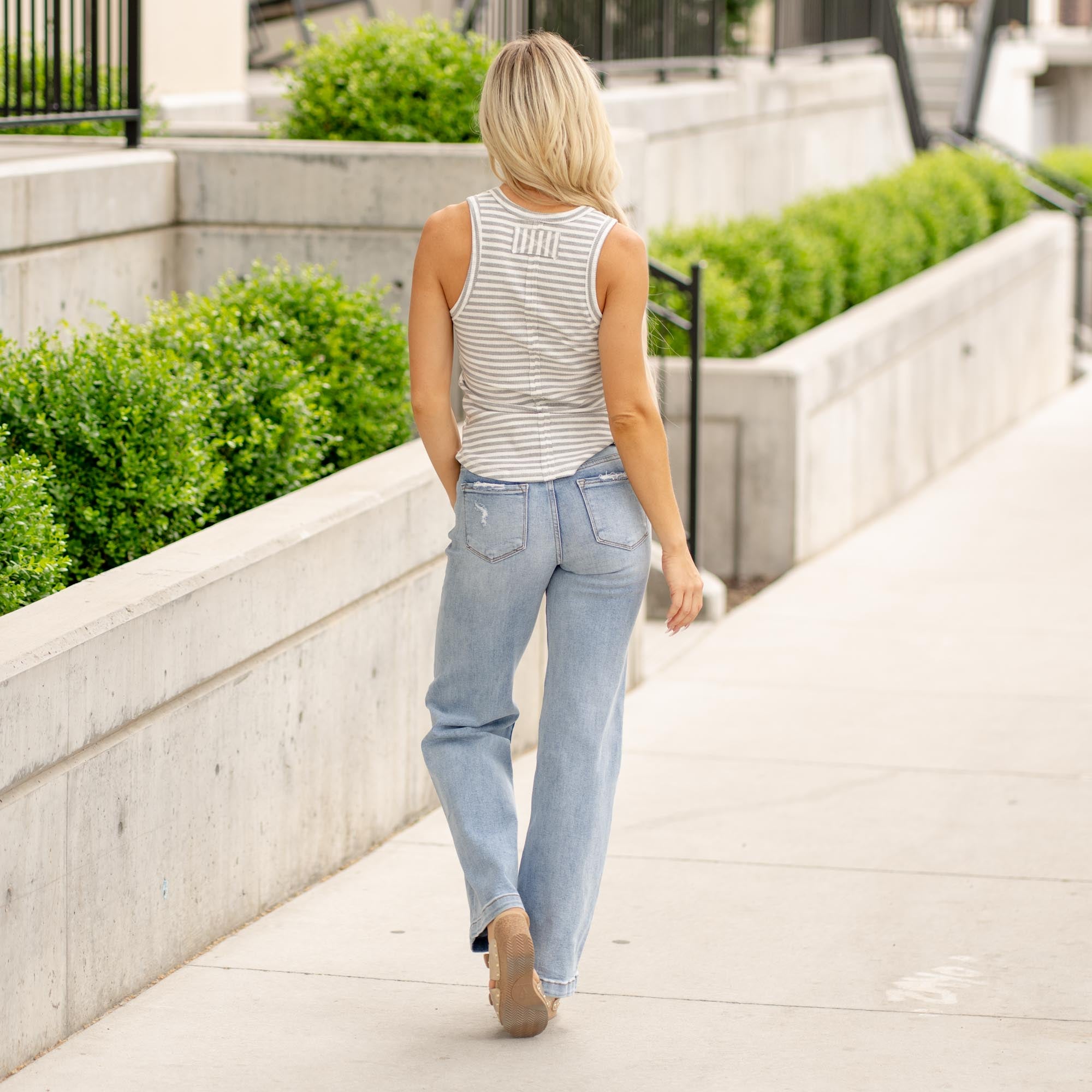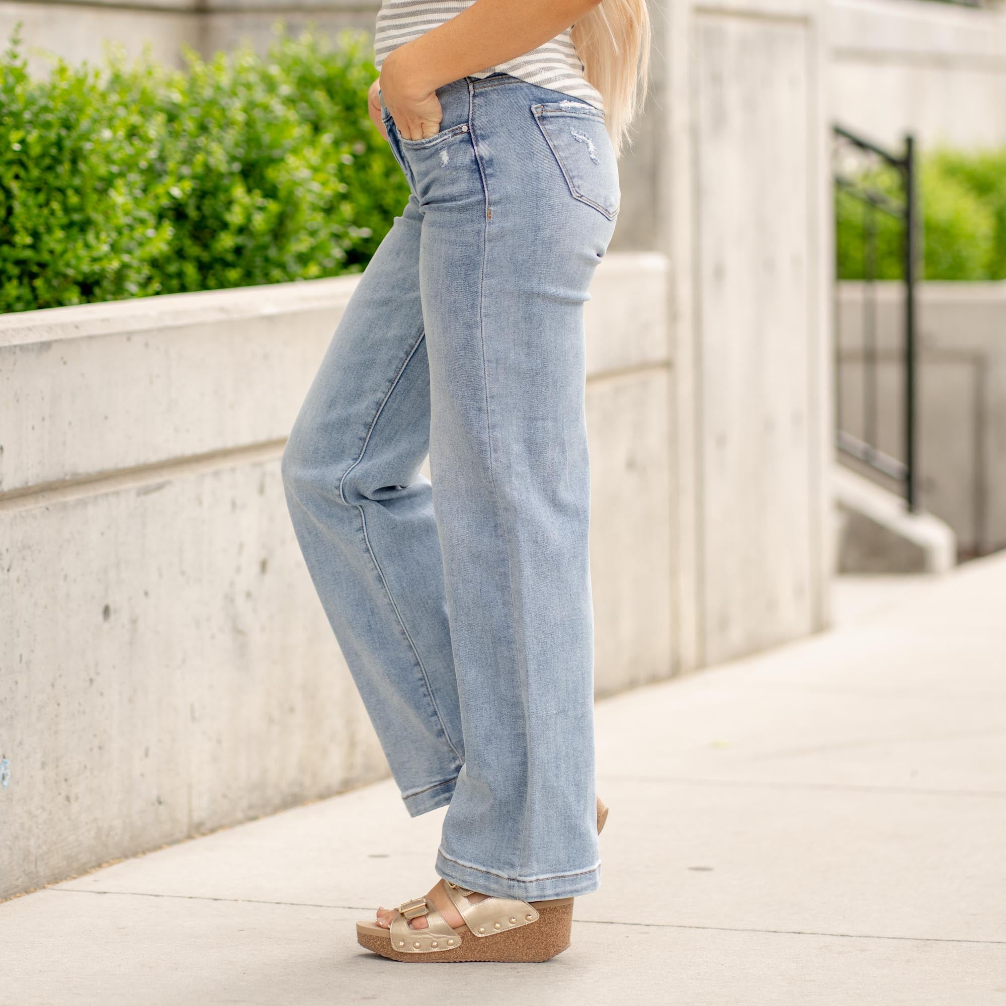 The Ease Into It Wide Leg is made for movement, comfort, and standout style. Featuring a mid-rise fit with a hidden elastic waistband, this light blue pair delivers all-day ease without sacrificing structure. Light distressing adds that perfectly worn-in vibe, while the wide leg silhouette brings effortless cool to any outfit. Crafted from Risen’s signature comfort stretch denim that flows with you—these are the jeans you’ll reach for on repeat. Finished with a zip fly, single-button closure, and classic 5-pocket design.