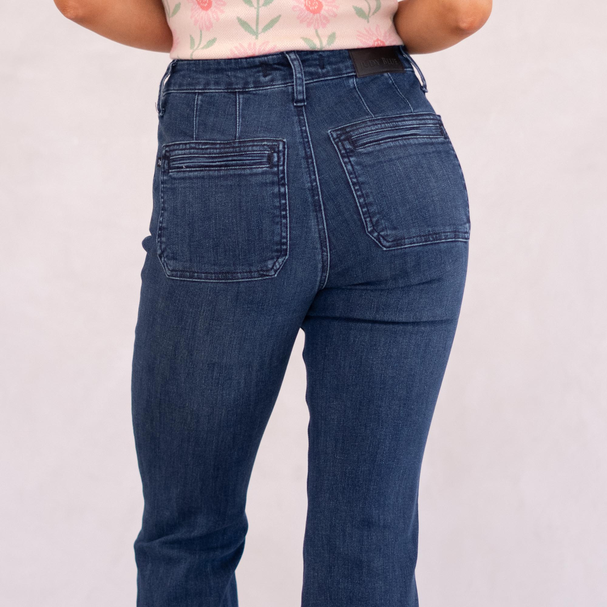 Judy Blue Celeste High Rise Patch Pocket Flare Dark Blue Wash