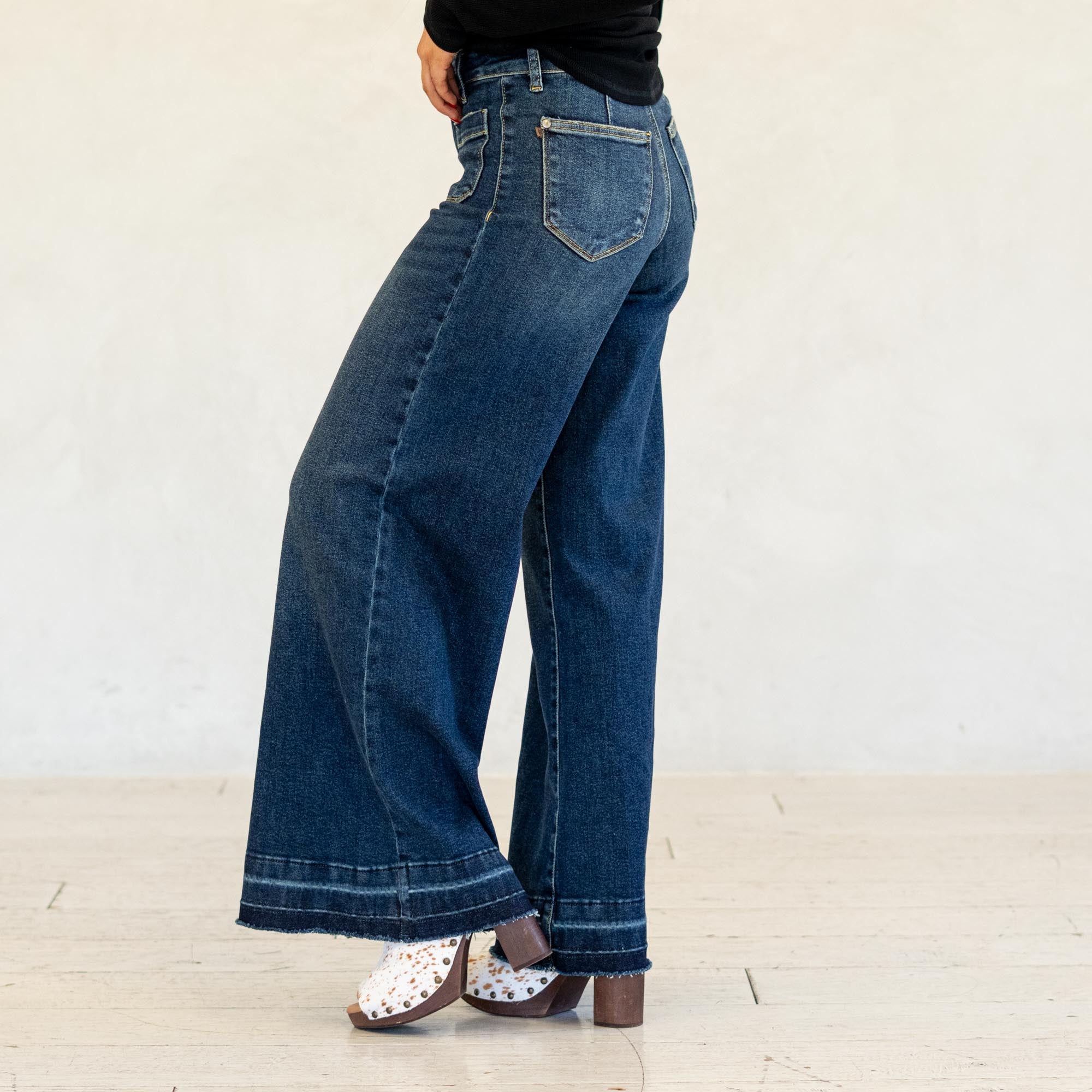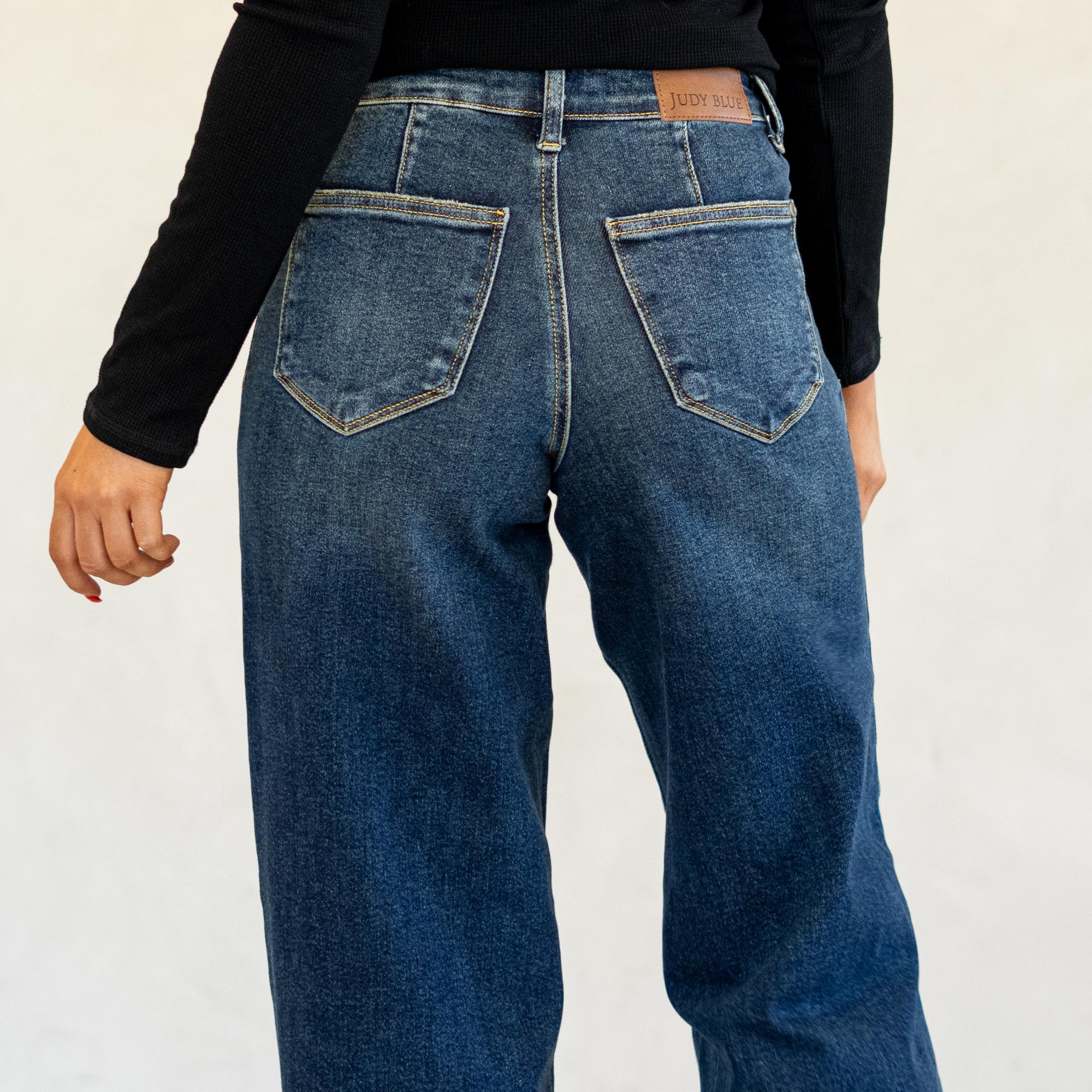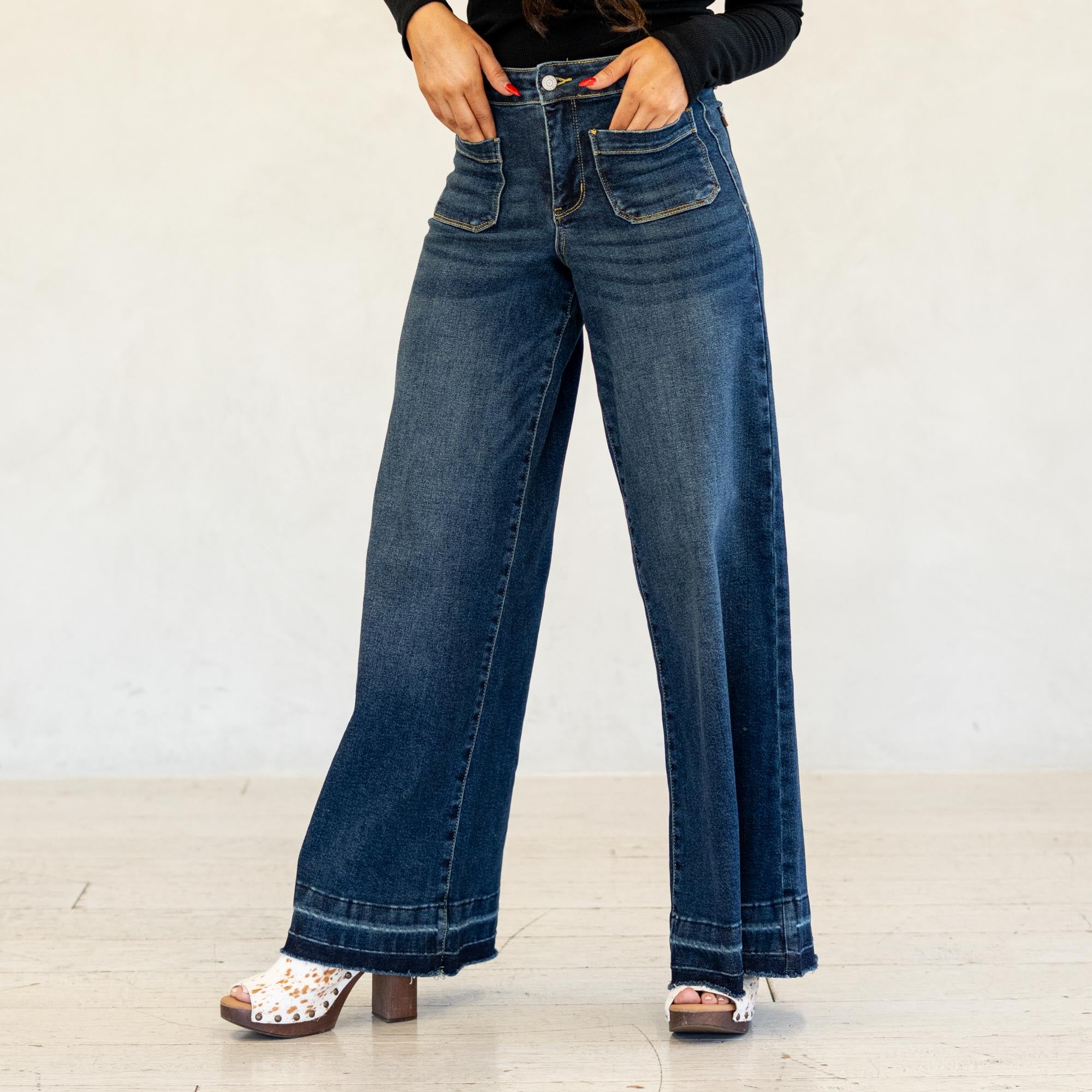 Judy Blue Monroe Palazzo Patch Jeans Dark Blue Wash Regular & Plus Sizes