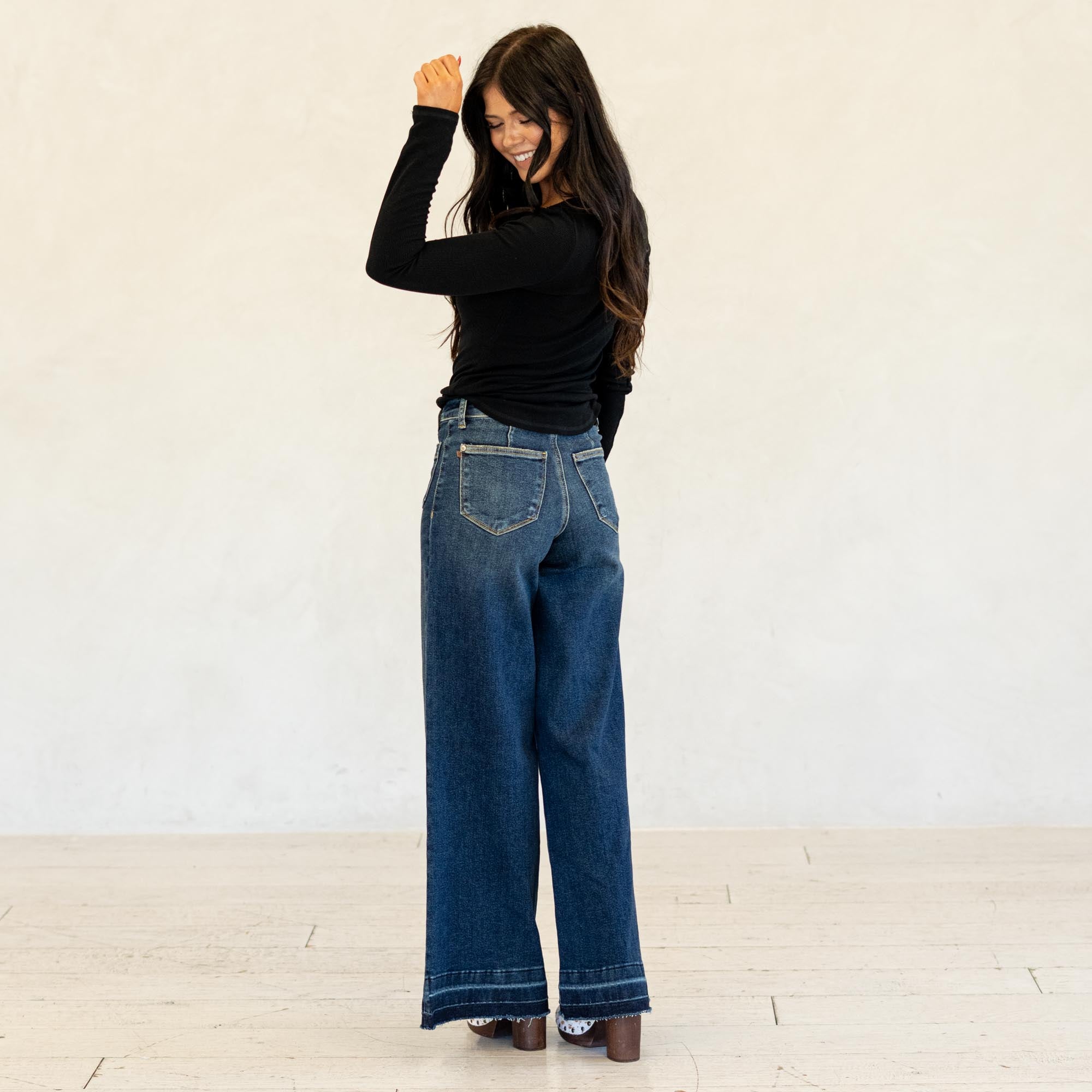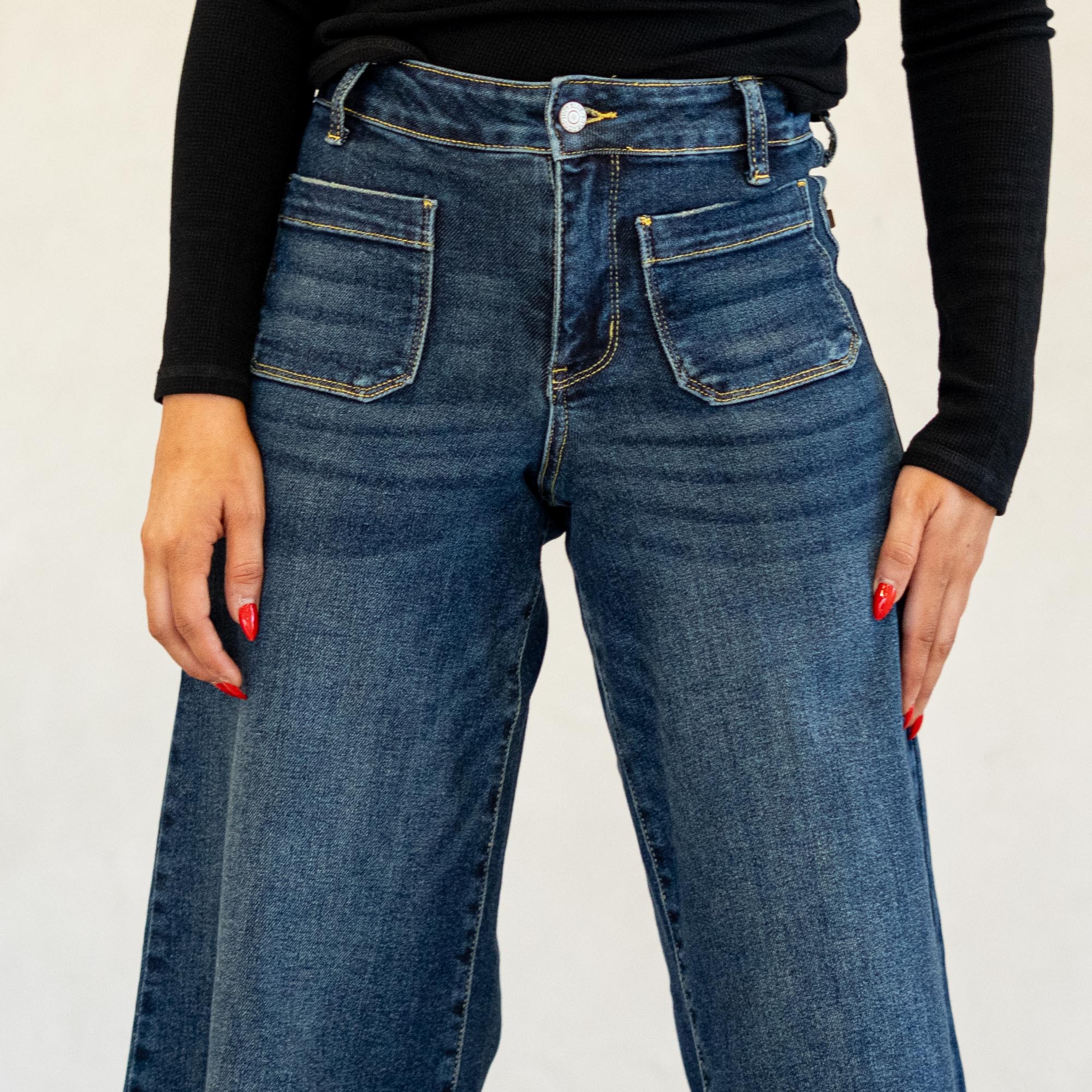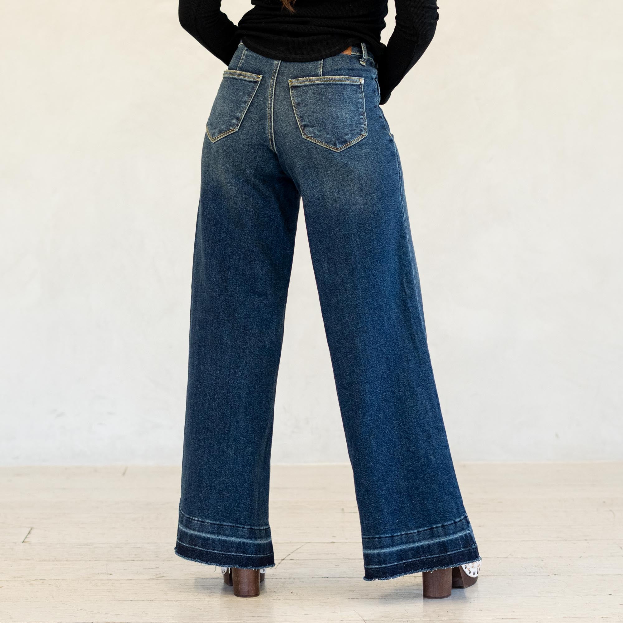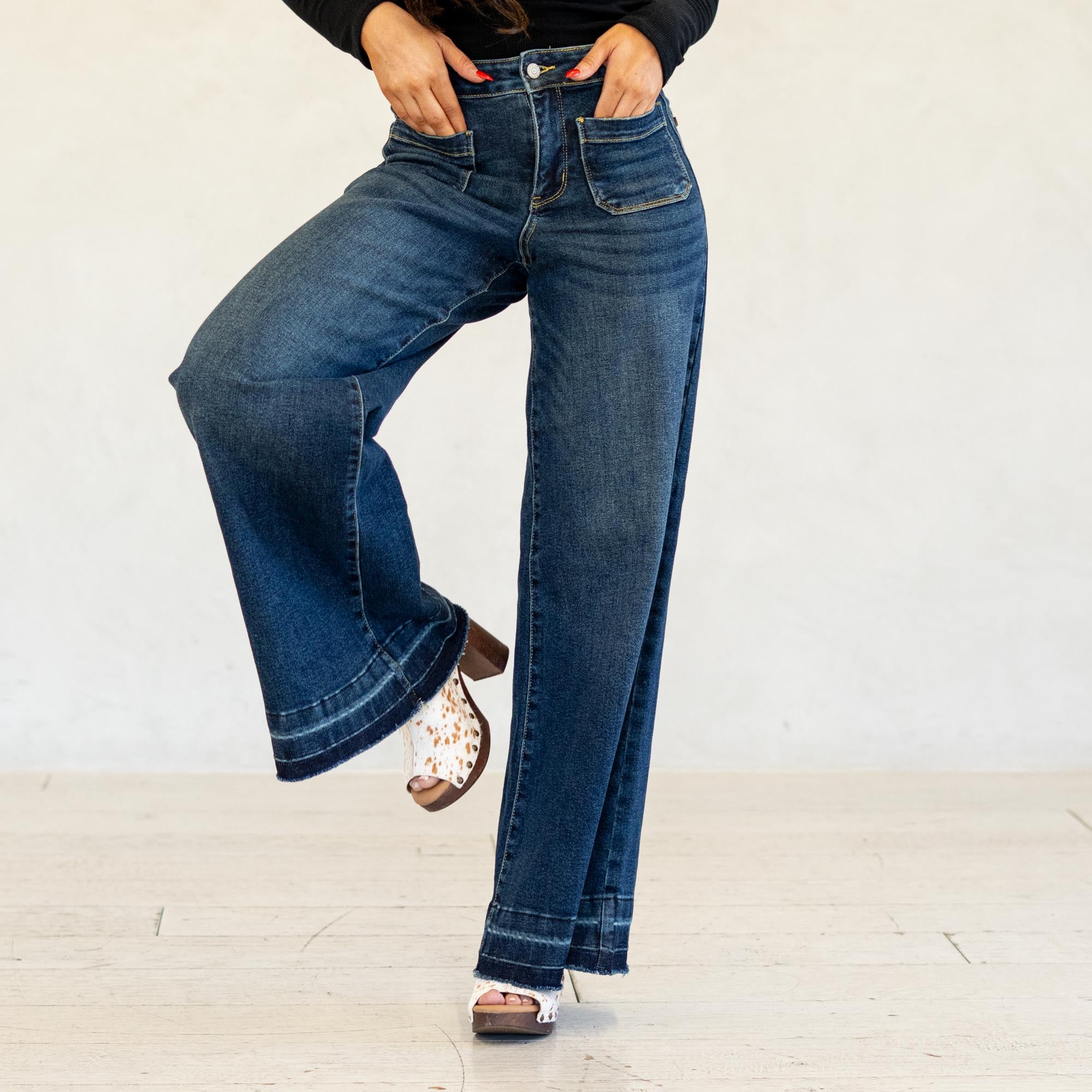 Judy Blue Monroe Palazzo Patch Jeans Dark Blue Wash Regular & Plus Sizes