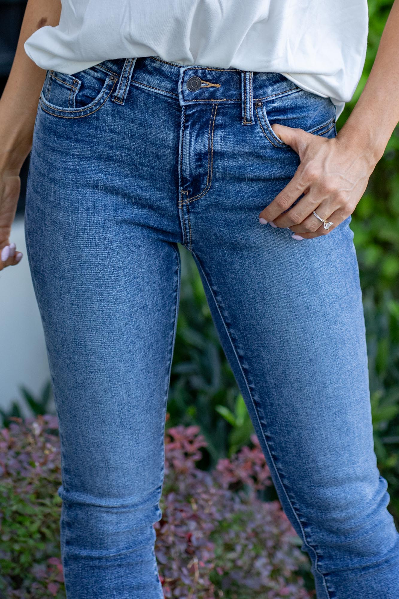The Eclipse Cuffed Cropped Skinny Jeans are designed for a sleek, versatile look with all-day comfort. Sitting high on the waist, this style hugs your curves through the hip and thigh before finishing in a skinny leg silhouette. The dark wash adds a polished touch, while the cropped length and cuffed hem keep the vibe modern and casual.