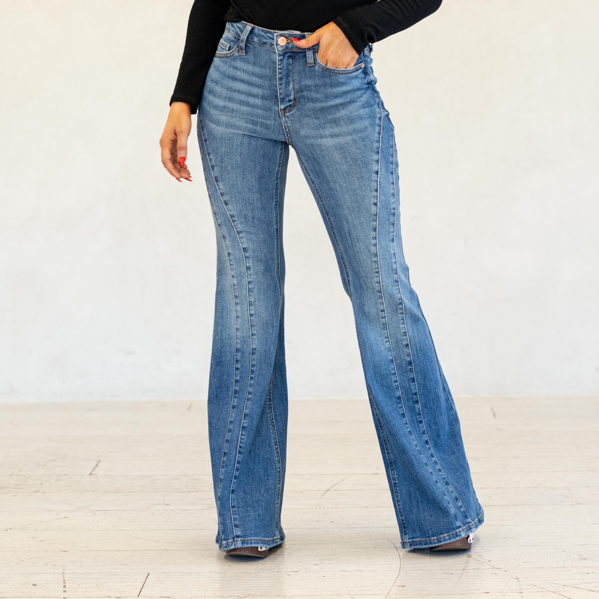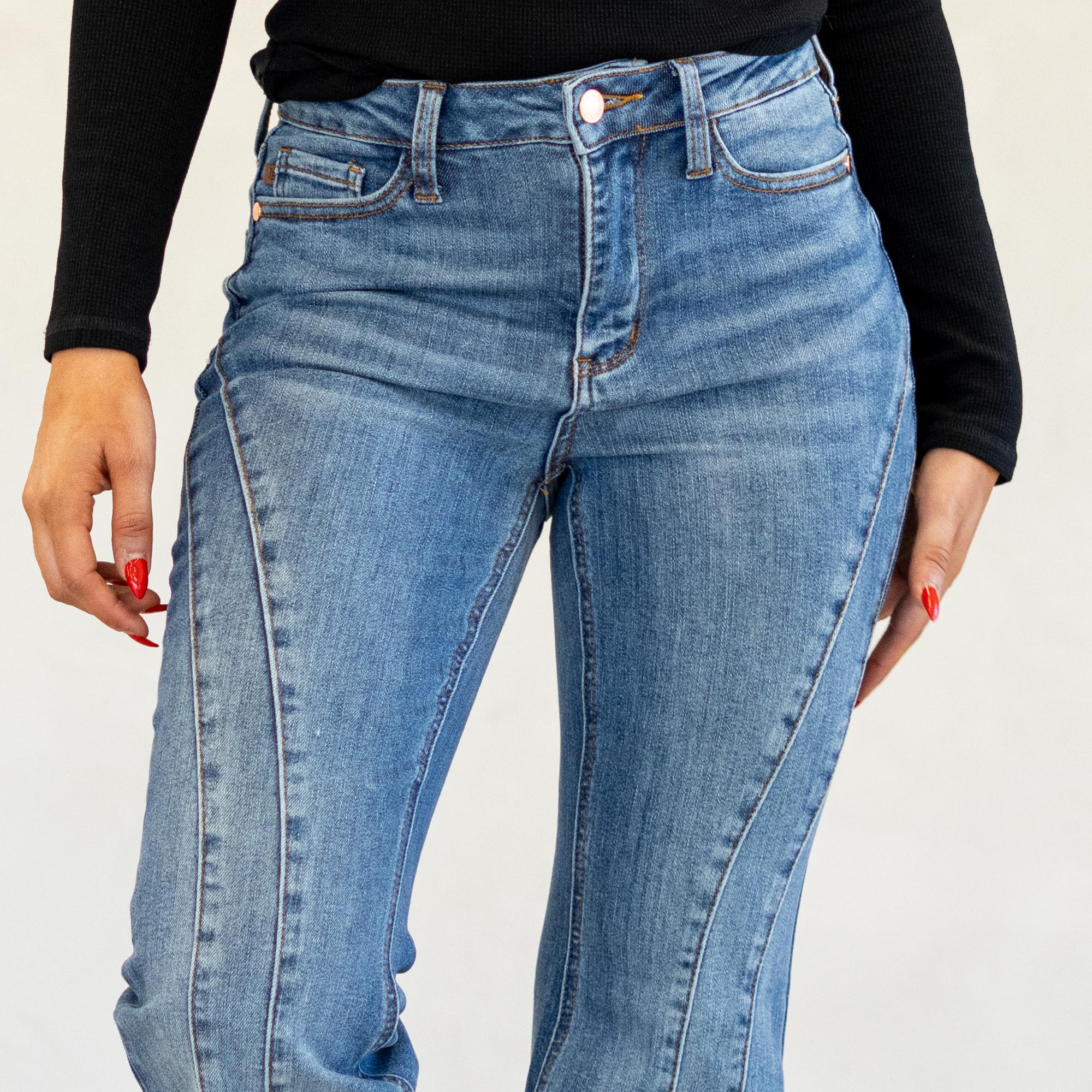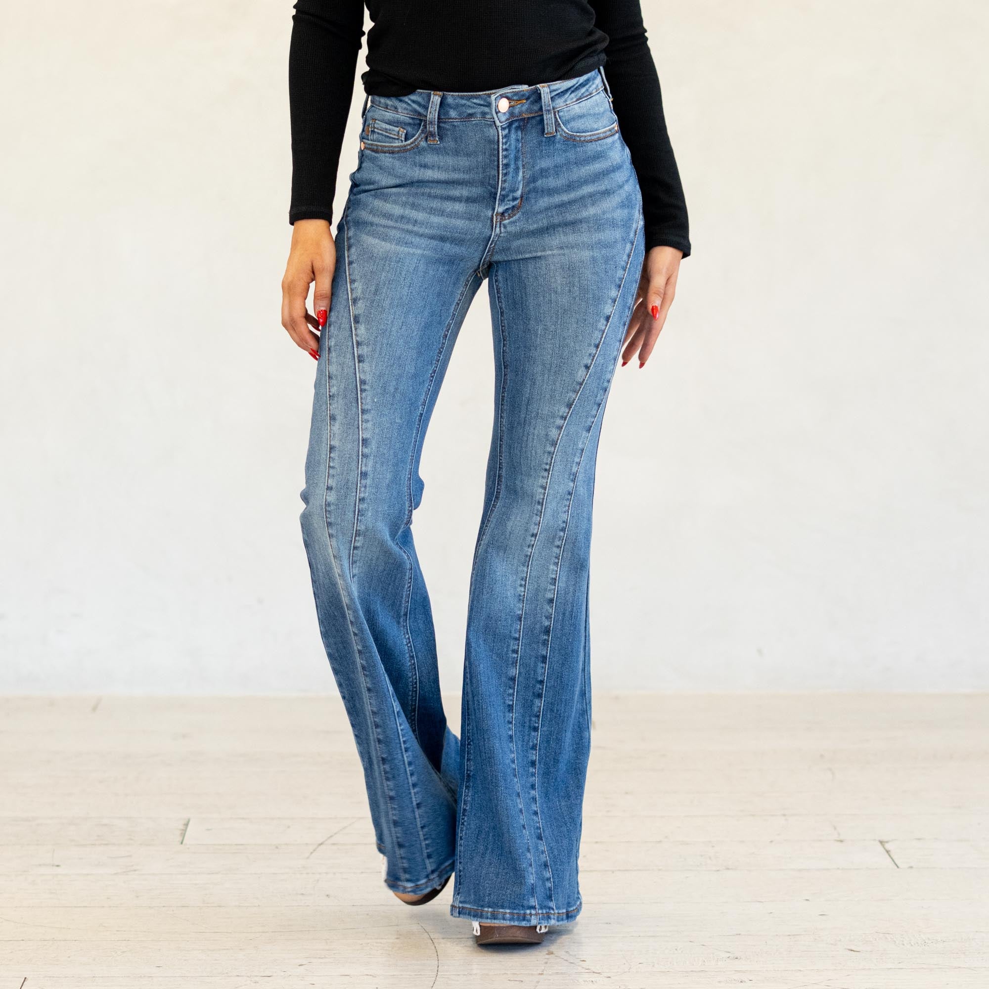 The Jaqueline Mid Rise Flare brings a fresh edge to a timeless silhouette. Designed with bold double angular seam detailing, this pair creates a flattering, sculpted look that elongates the leg. Finished in Judy Blue’s ultra-comfortable stretch denim, these flares move with you while holding their shape wear after wear. Dress them up with a fitted top or keep it casual for effortless everyday style.