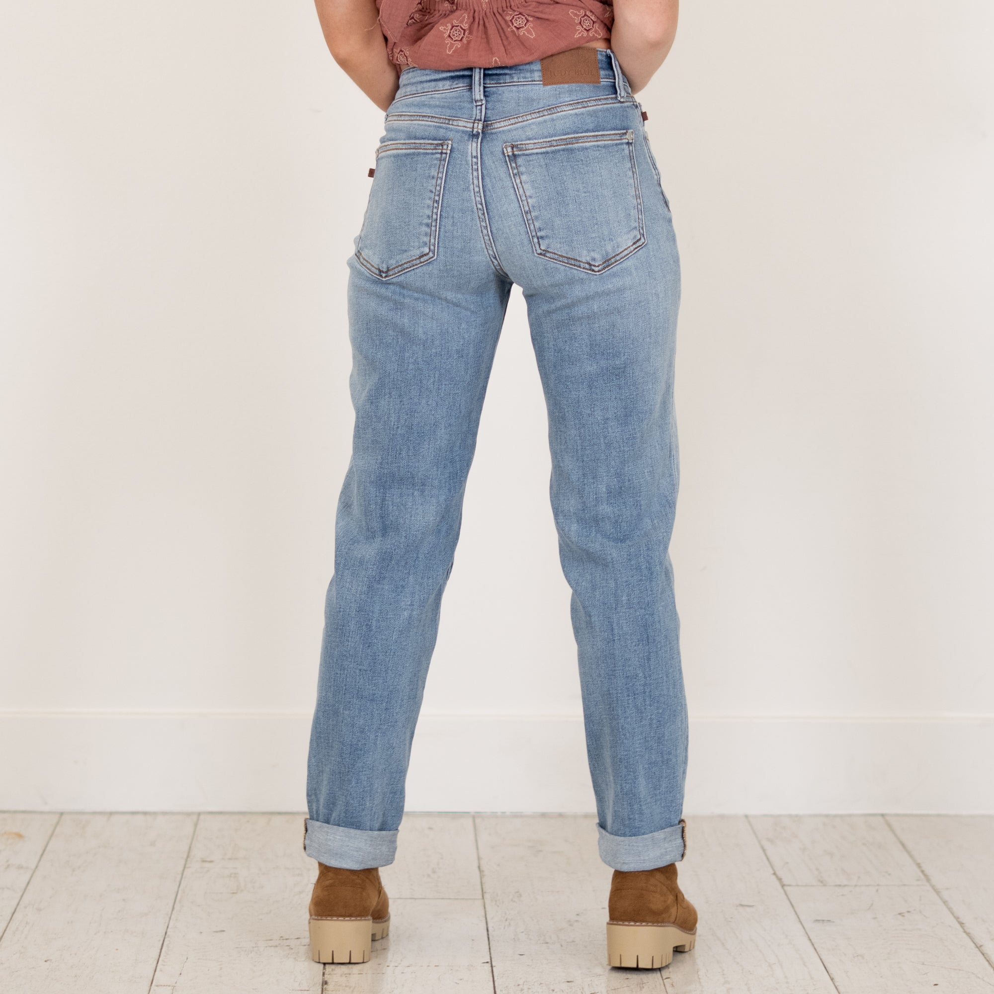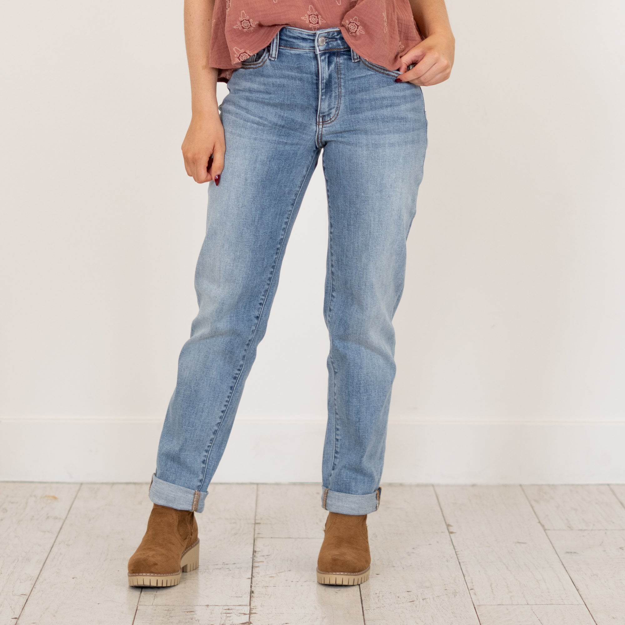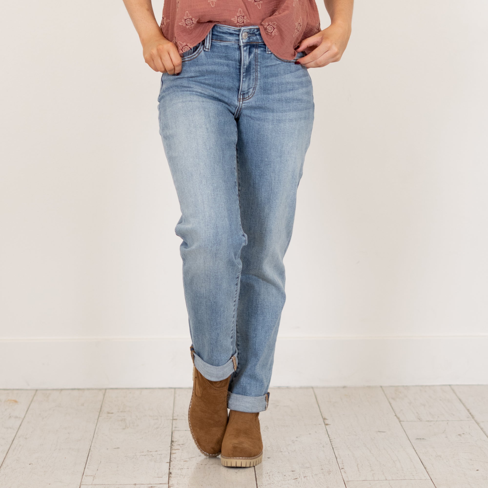 MR Boyfriend, a pair of jeans by Judy Blue, captures everyday comfort and contemporary style. These medium wash jeans feature a regular, boyfriend fit that's ideal for casual outings. With a 9 3/4" rise and a 28" cuffed / 31" uncuffed inseam, they offer a perfect fit for the modern woman. The solid color design adds to their versatility, making them a must-have for your fall/winter wardrobe. Hand wash recommended. Experience the blend of timeless appeal and modern twist with Judy Blue.