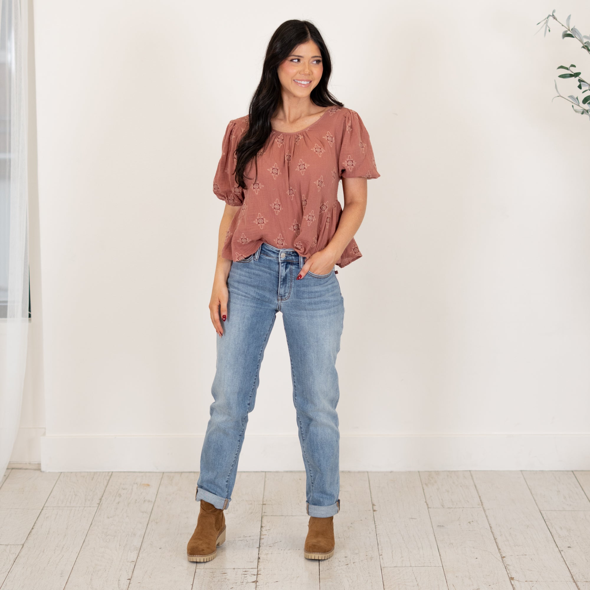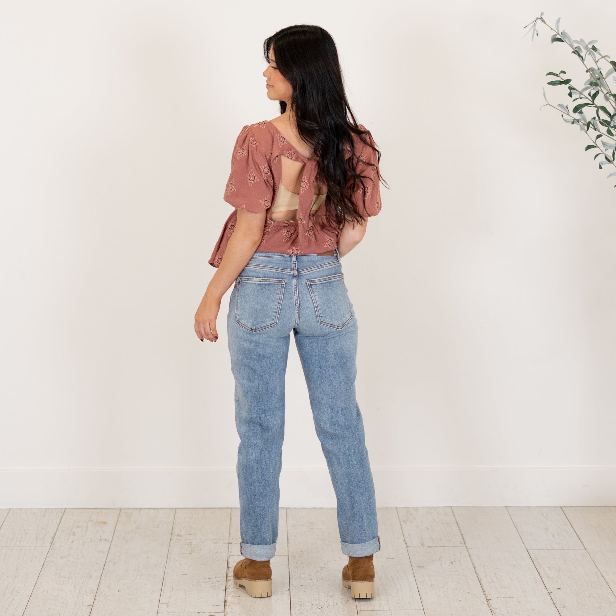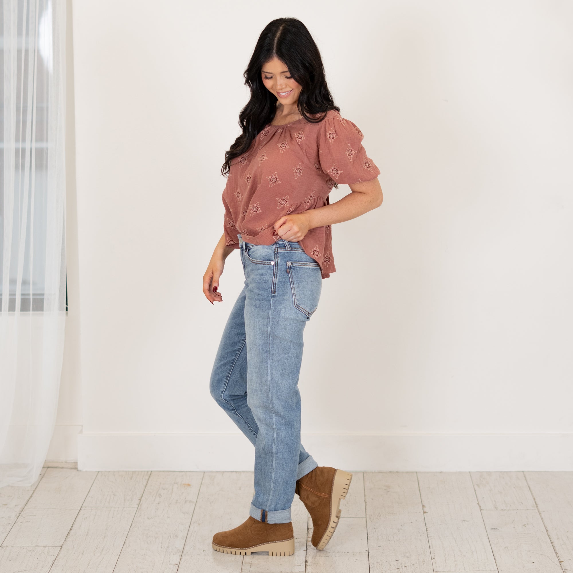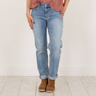 MR Boyfriend, a pair of jeans by Judy Blue, captures everyday comfort and contemporary style. These medium wash jeans feature a regular, boyfriend fit that's ideal for casual outings. With a 9 3/4" rise and a 28" cuffed / 31" uncuffed inseam, they offer a perfect fit for the modern woman. The solid color design adds to their versatility, making them a must-have for your fall/winter wardrobe. Hand wash recommended. Experience the blend of timeless appeal and modern twist with Judy Blue.