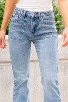 These high-rise flares have vintage square pockets and a distressed hem. They have a 31" inseam in a comfortable stretch denim.